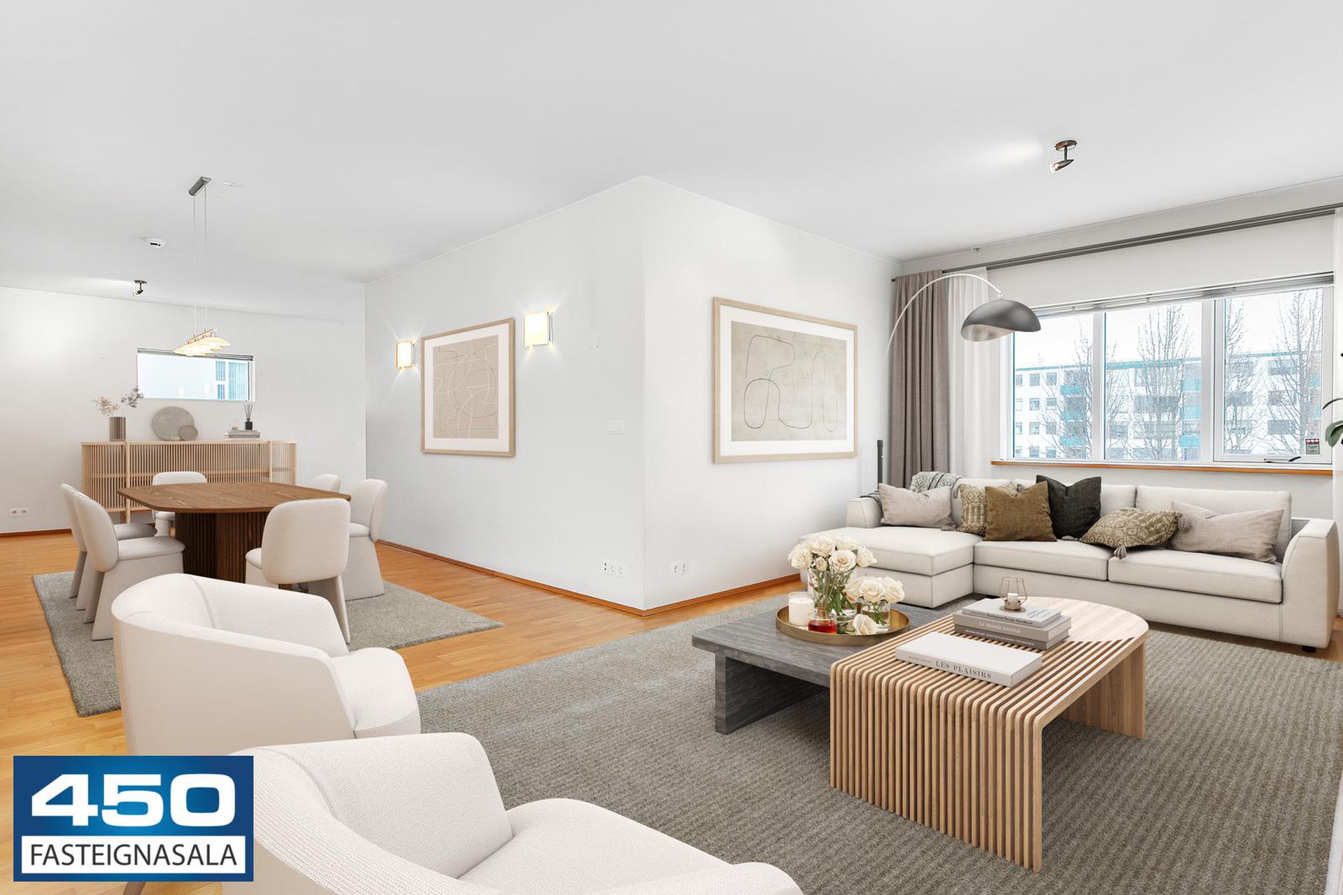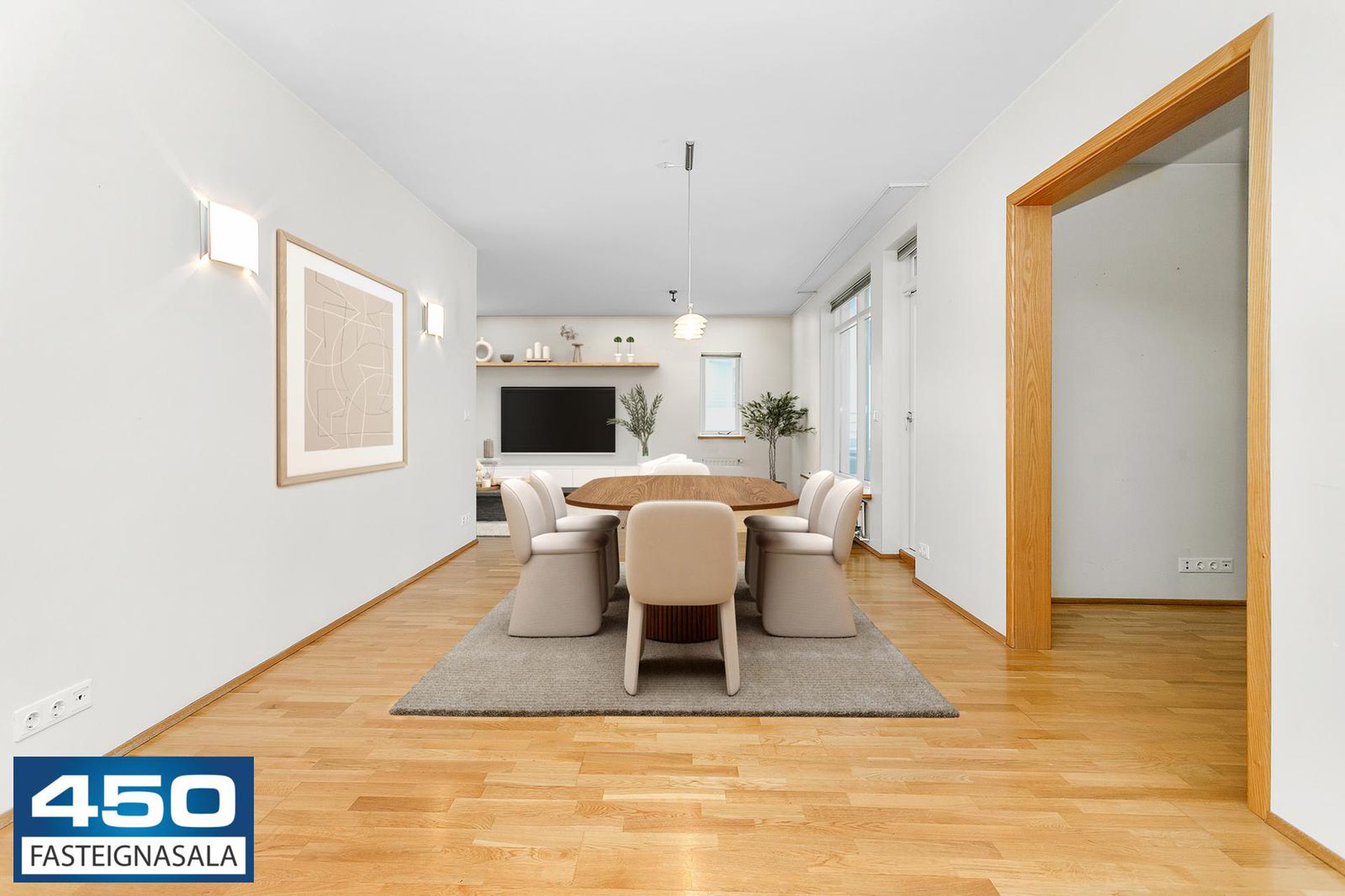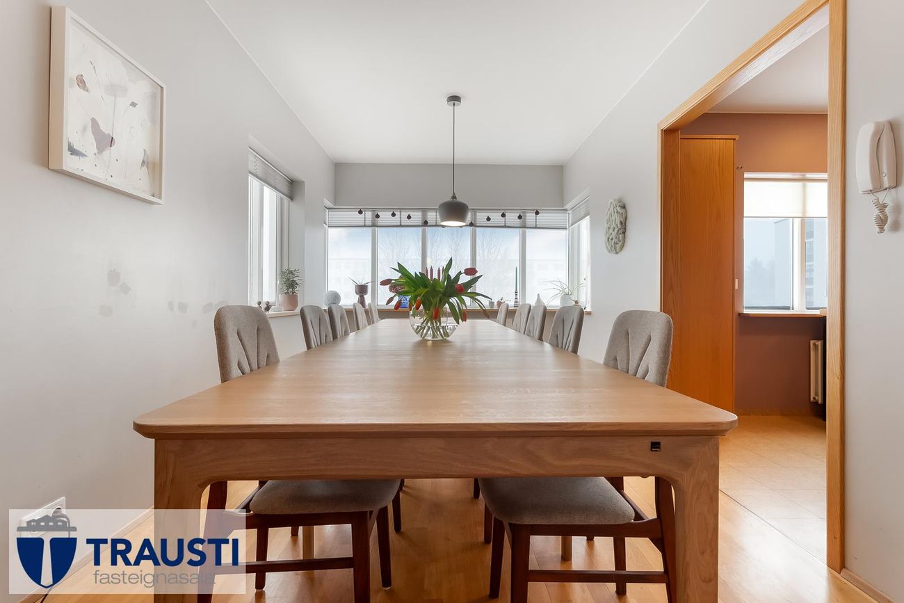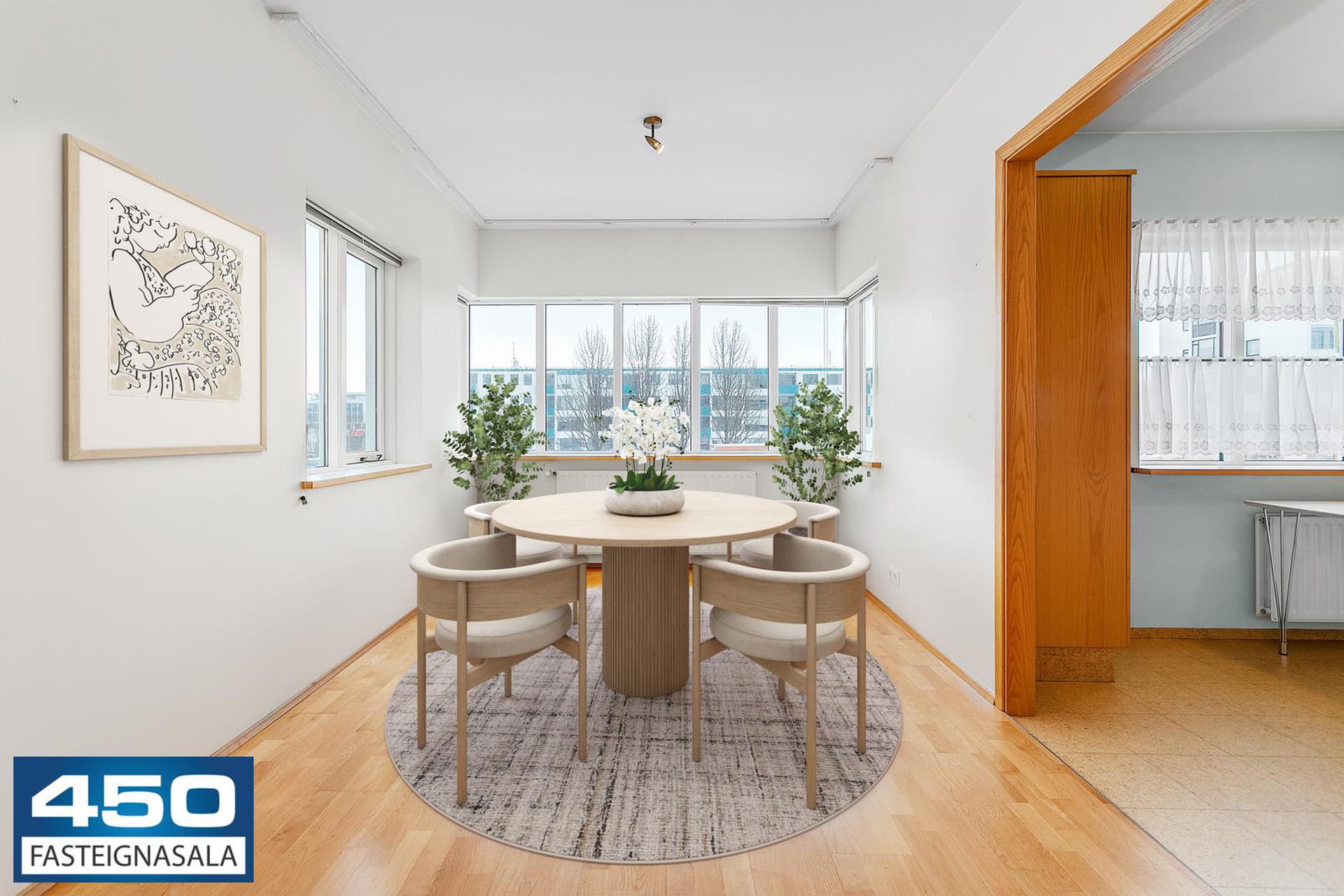 Þrískipt stofa/borðstofa í U-laga um eldhús með parketgólfi. Rúmgóð með möguleikum.