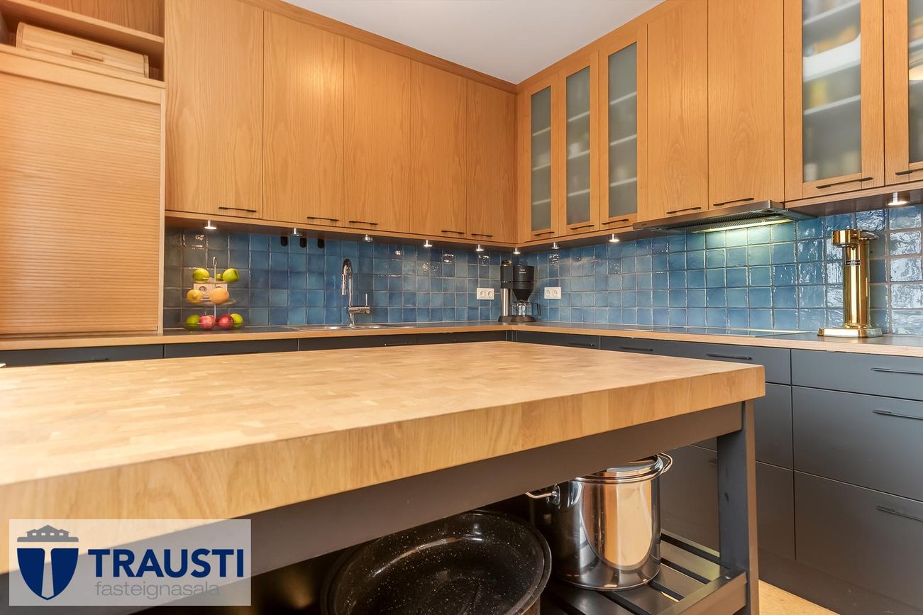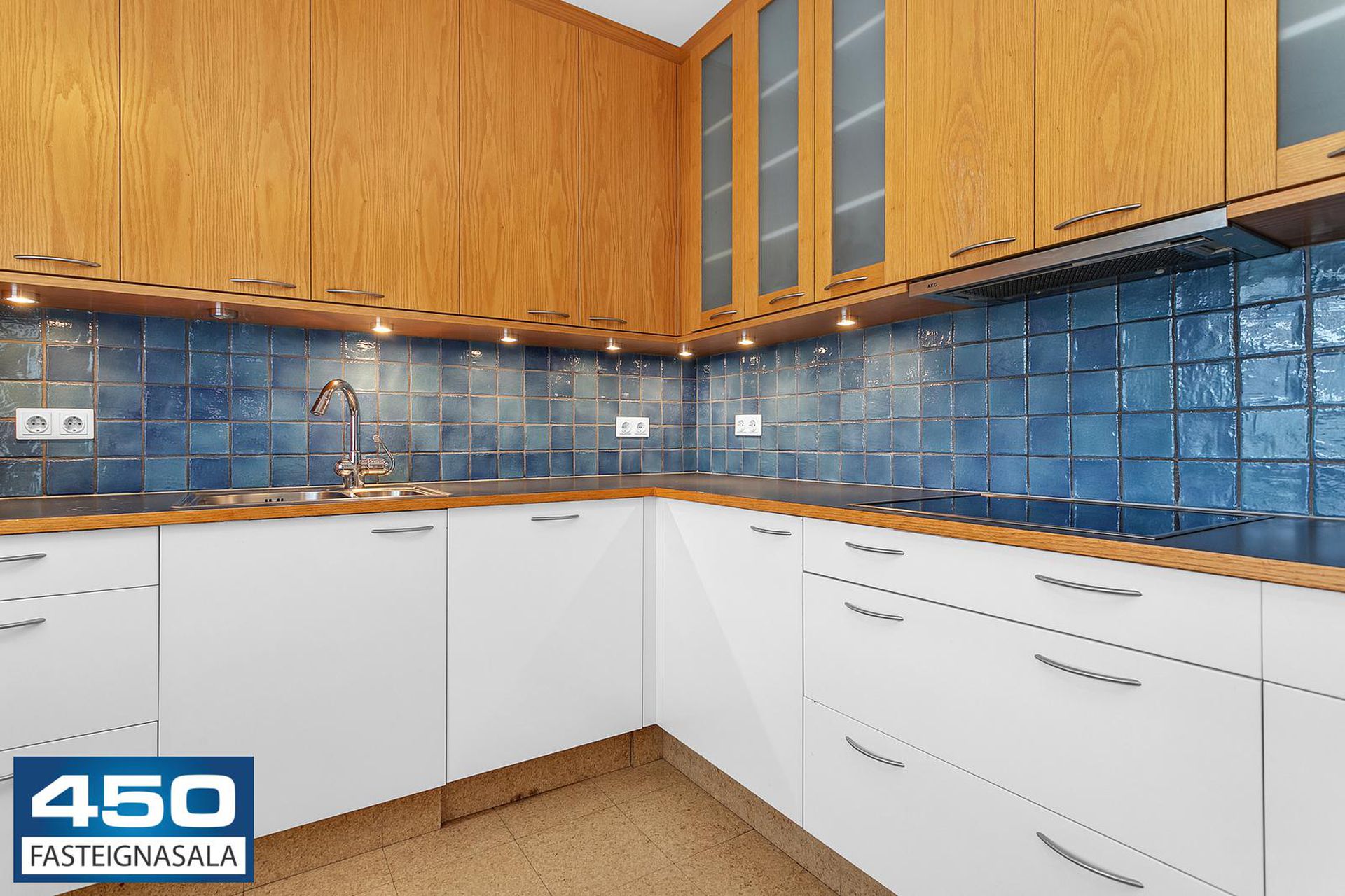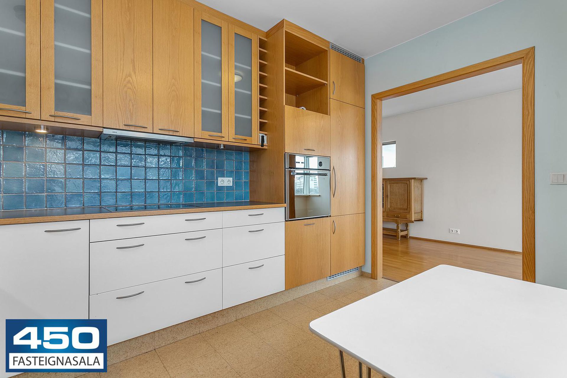 Parketgólf, flísalögð gólf, korkflísar í eldhúsi.