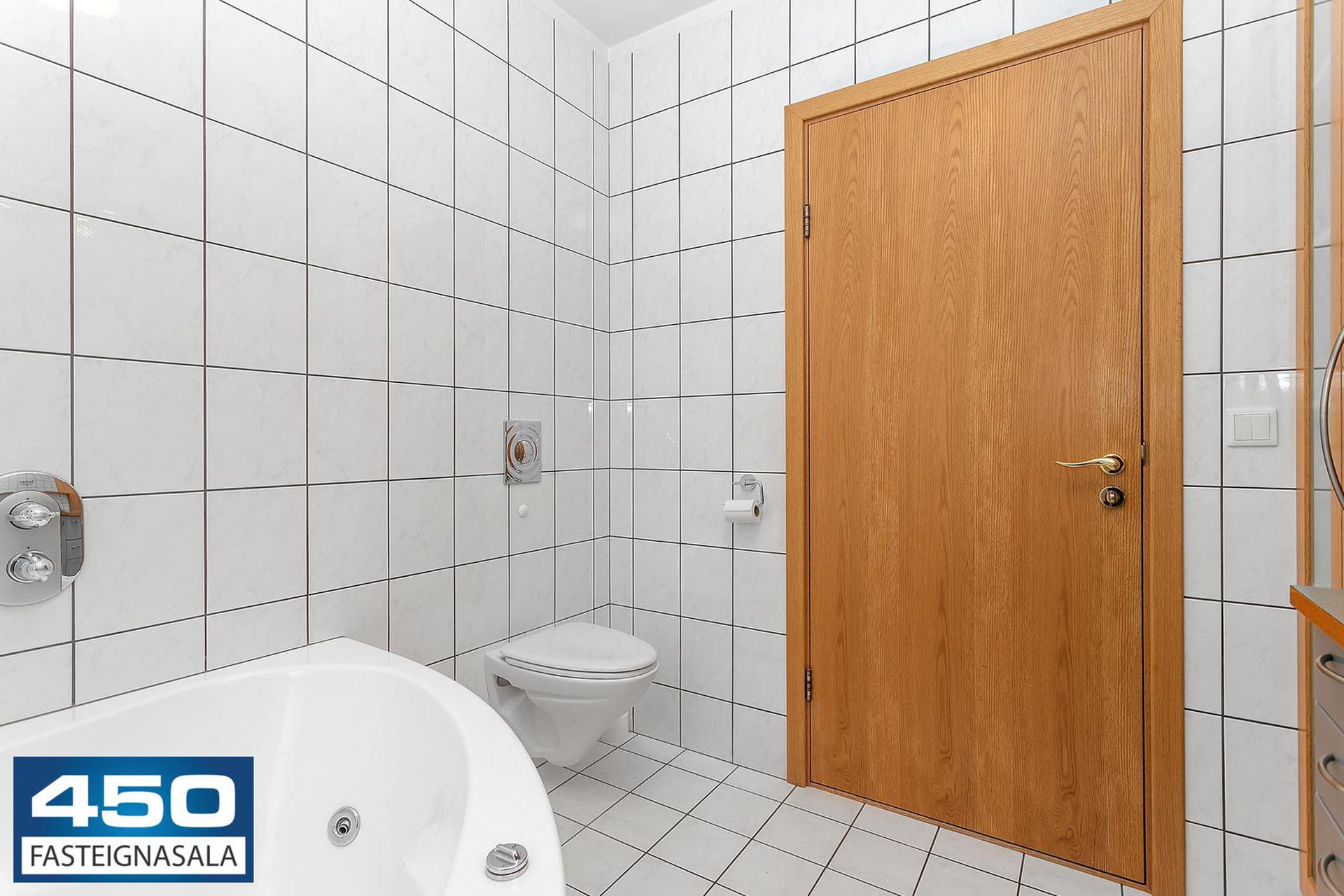 Baðkar í einu baði, sturtuklefi í öðru. Báðar baðherbergi með Brúnás innréttingu og flísalögð.