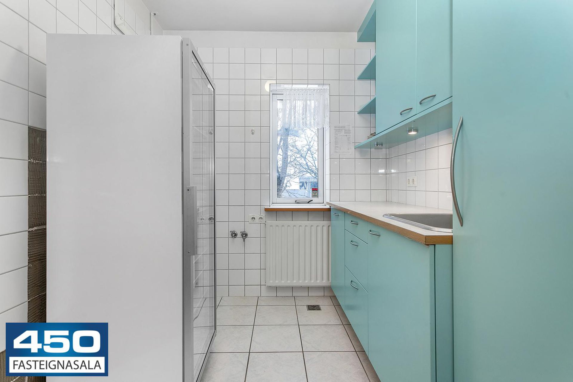 Rúmgott þvottahús með skolvask, skápum og flísalögðu gólfi.