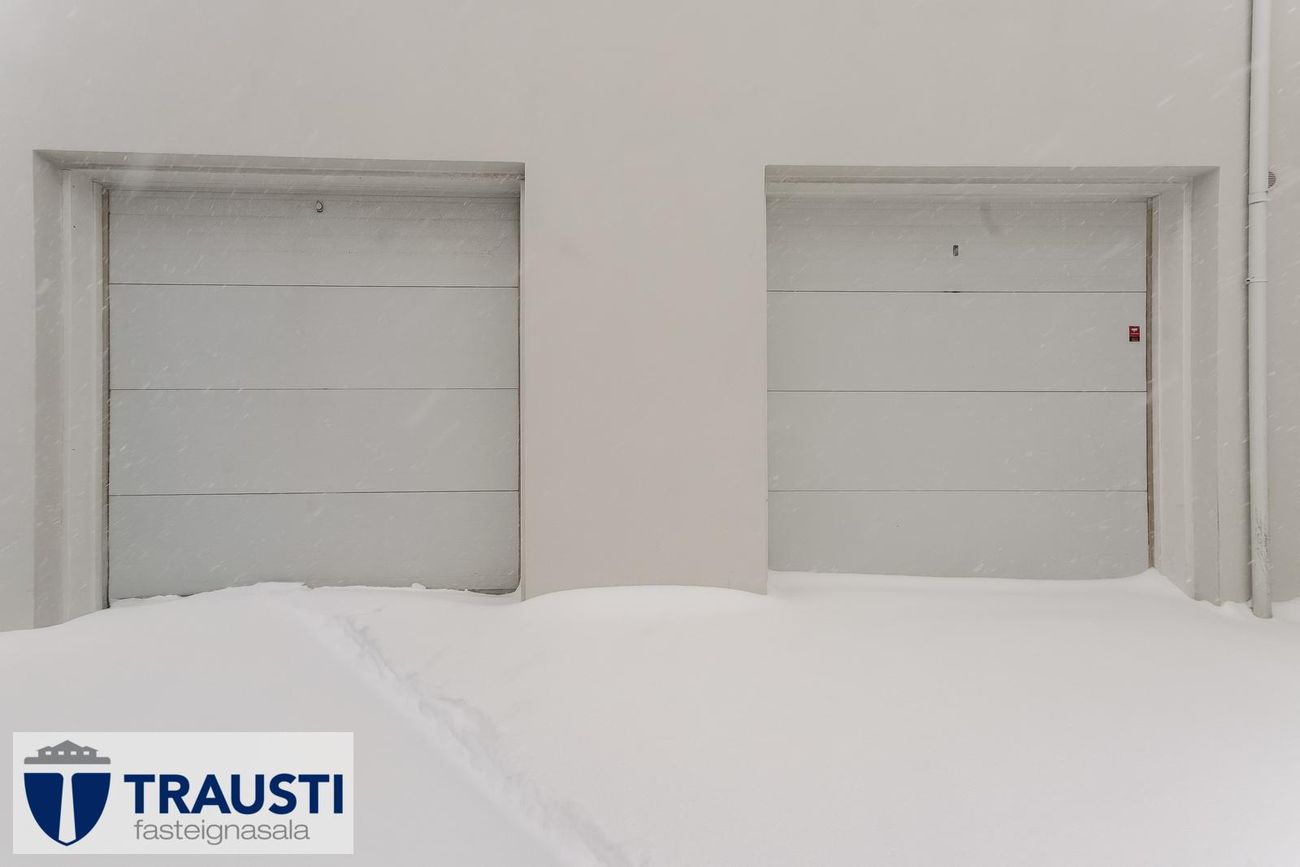 28,0 fm bílskúr með lofthæð, nýjum hillum og tveimur bílastæðum.