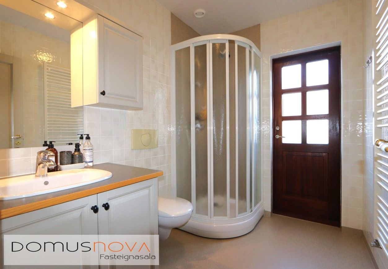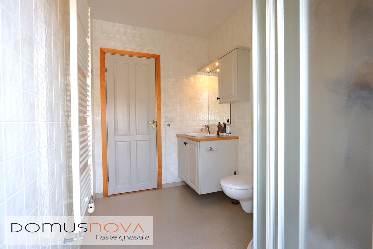 Baðherbergi, dúkur á gólfi, sturta, vaskskápur, hillur, dyr út á sólpall.