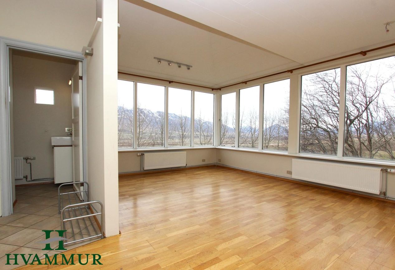 Stofa með parketi og stórum gluggum til austurs og suðurs á efri hæð.