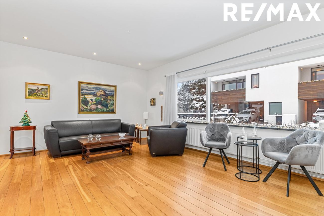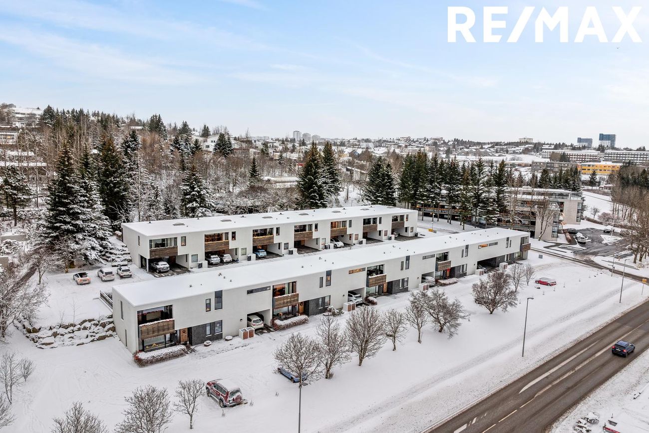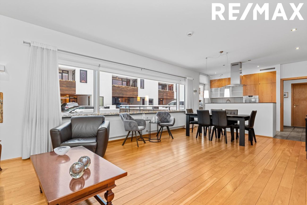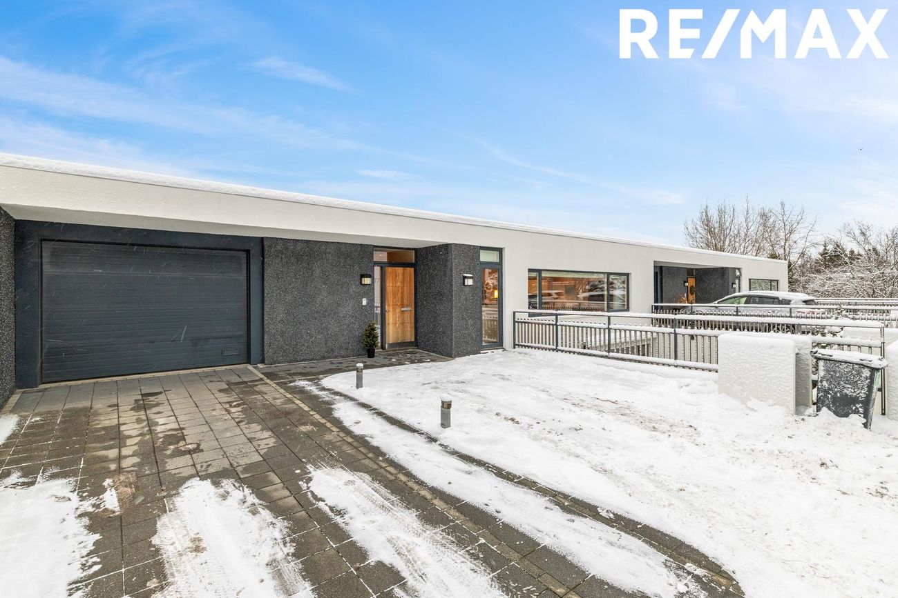 107,9 fm íbúð með 28,3 fm bílskúr, opið rými, sérinngangur, innbyggður bílskúr, tvö bílastæði á lóð.