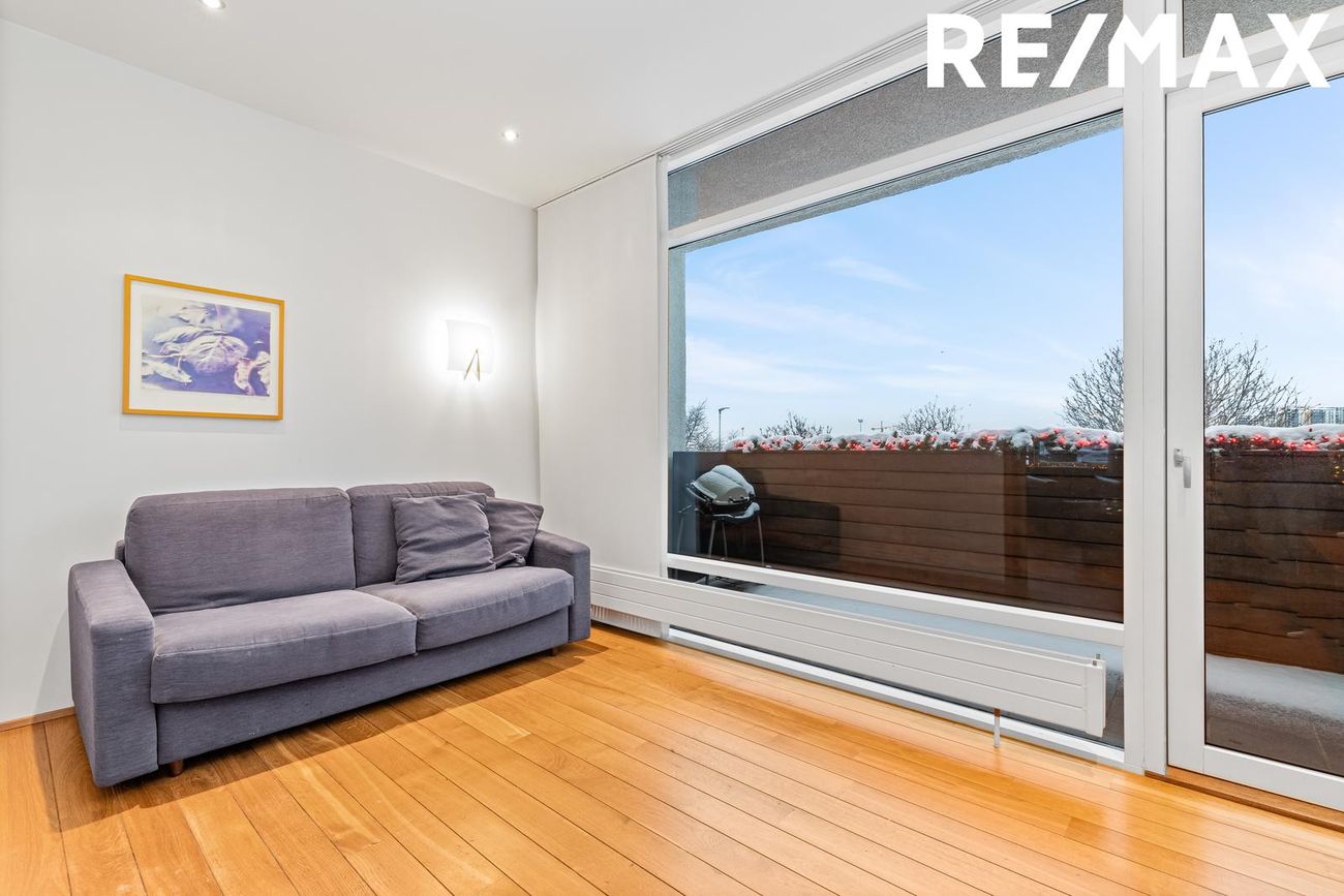 Opið og bjart rými með parket á gólfi og stórum suðurglugga. Tengt sjónvarpsherbergi sem hægt er að nota sem svefnherbergi.