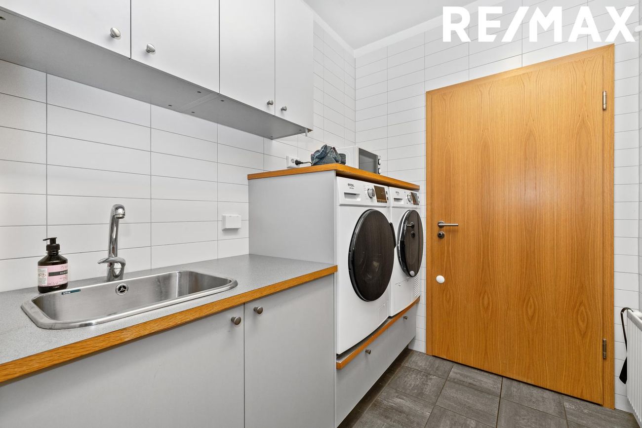 Þvottahús inn af anddyri með hvítum innréttingum.