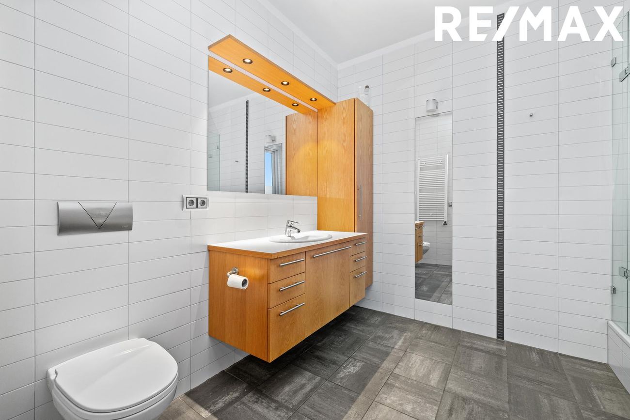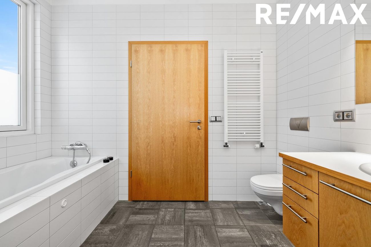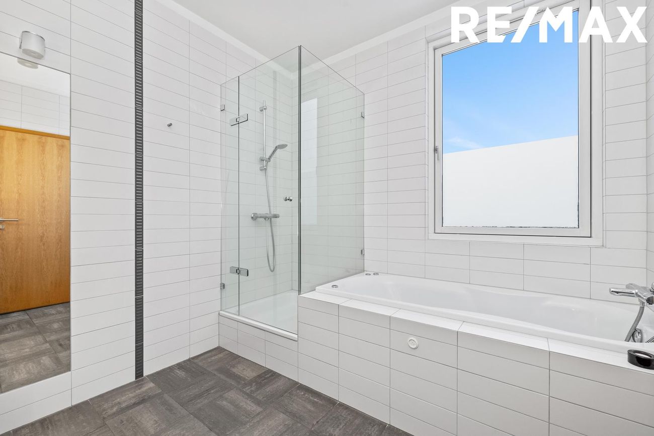 Baðherbergi með baðkari, sturtu, upphengt WC og opnanlegum glugga.