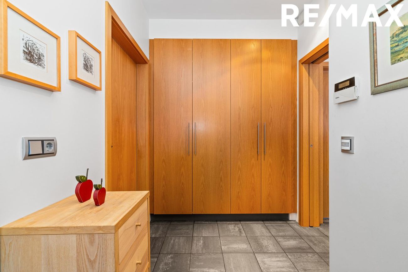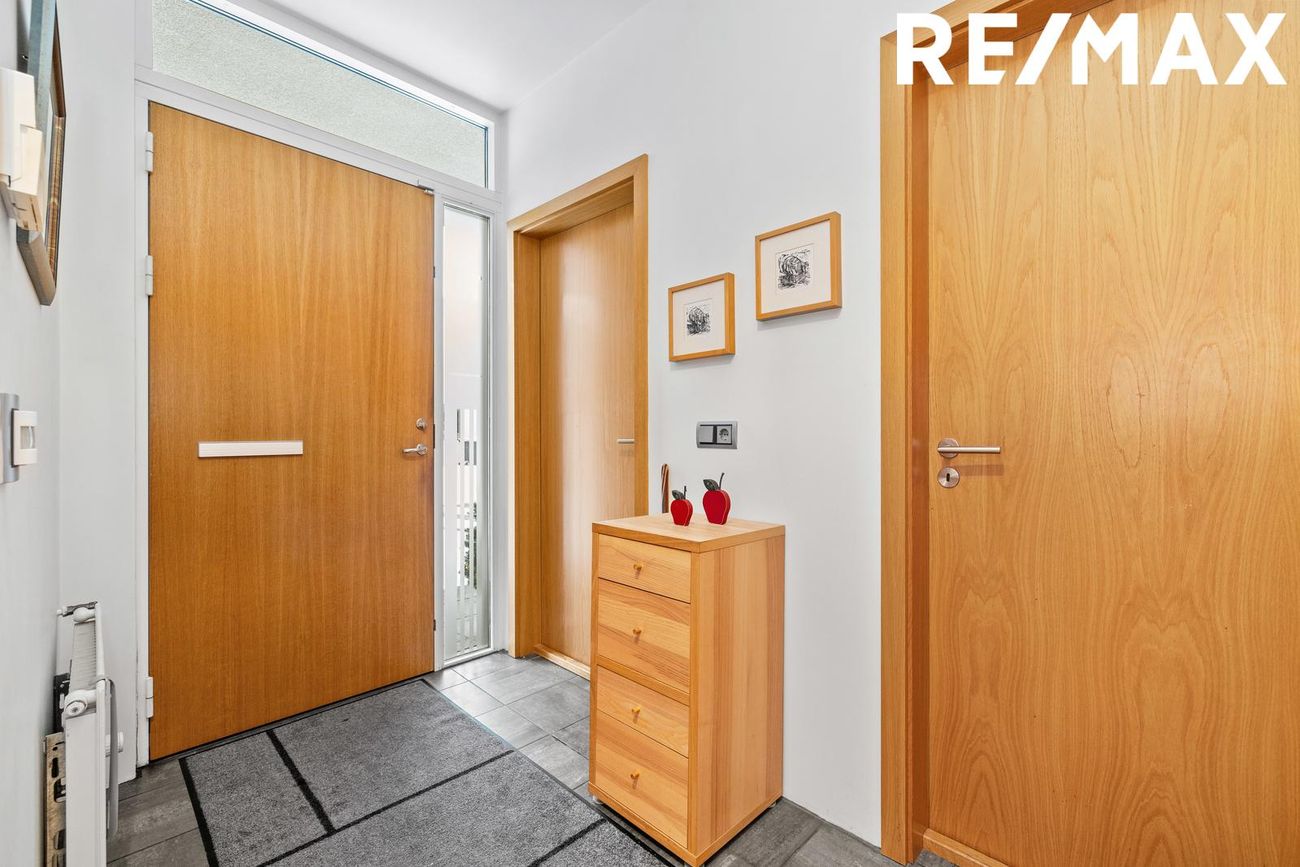 Þvottahús með hvítum innréttingum inn af anddyri.