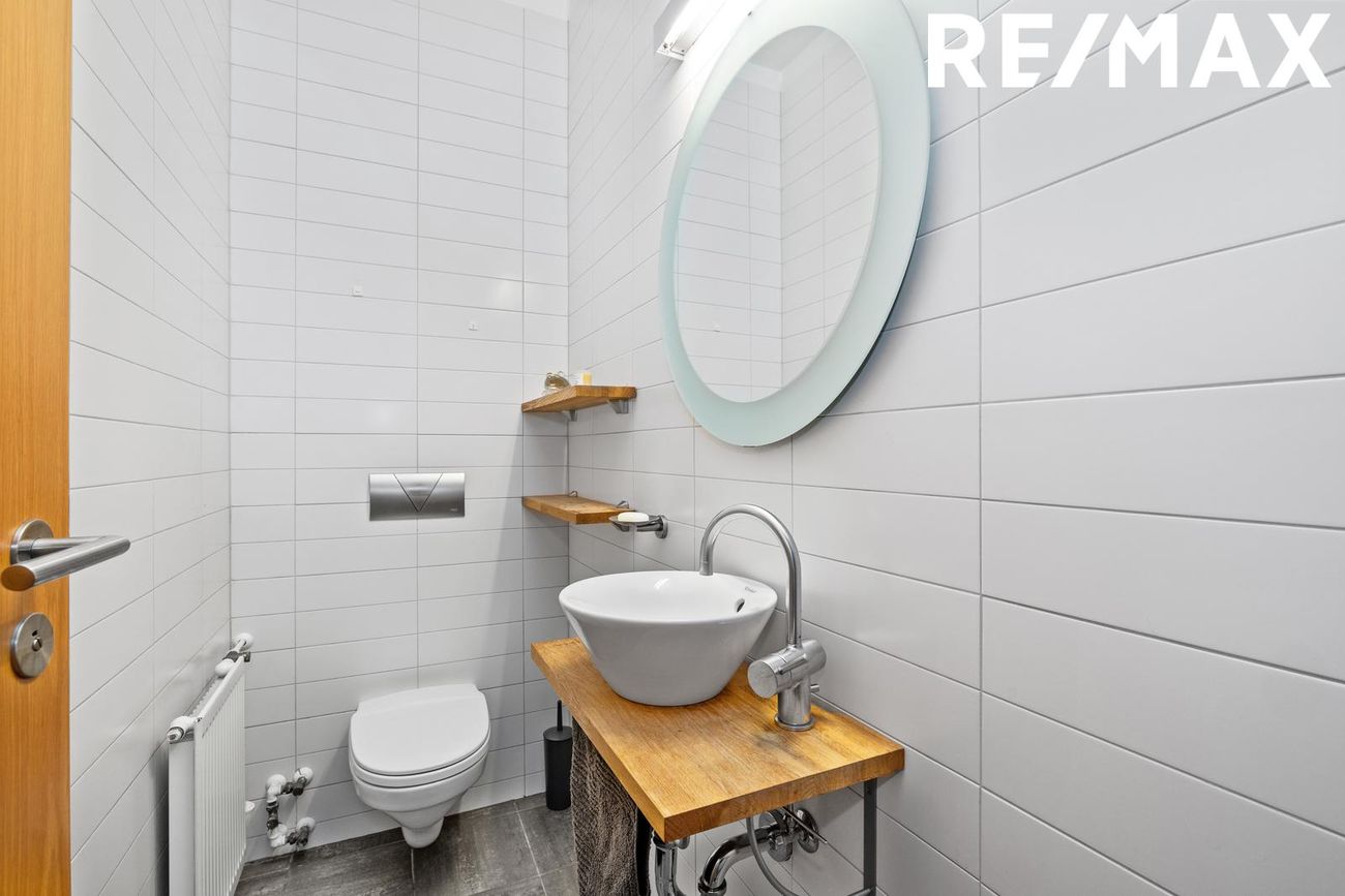 Gestasalerni með flísalögðum gólfi og veggjum.