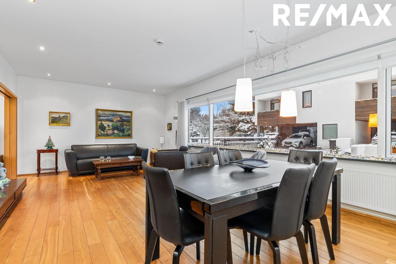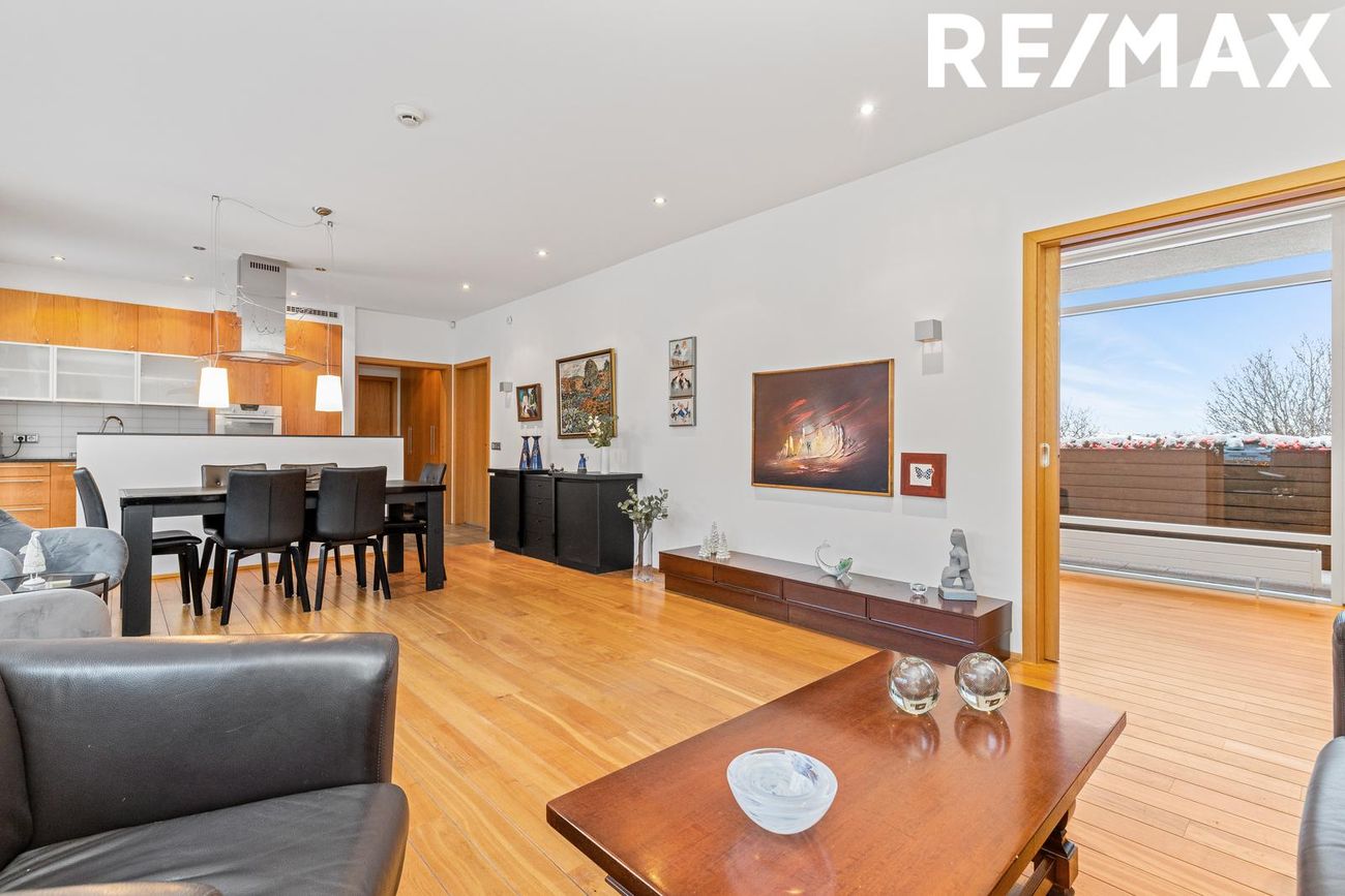 Opið og bjart rými með parketgólfi og stórum gluggum sem snúa í suður.