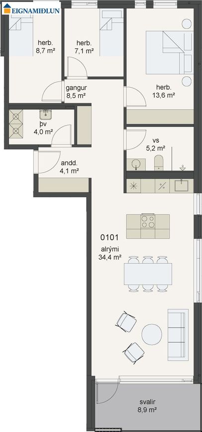 NÁNAR: Íbúð merkt 01-01 er með 3 svefnherbergjum,eldhúsi, stofu, borðstofu, baðherbergi og sérþvottahúsi. Íbúðin er skráð 101,5 fm og sérgeymsla merkt 00-02 er 8,3 fm, birt stærð er 109,8 fm. Svalir í suður skráðar 8,9 fm. Íbúðinni fylgir stæði í bílakjallara merkt B-042.