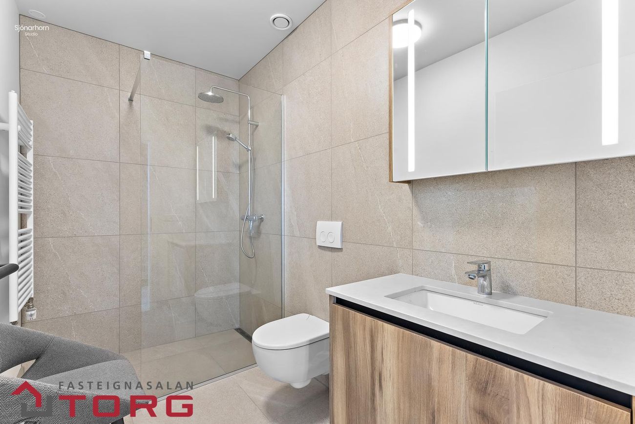 Baðherbergi. Baðherbergið er með gólfhita. Vönduð innrétting, speglaskápur, upphengt salerni, handklæðaofn. Walk-in sturta.