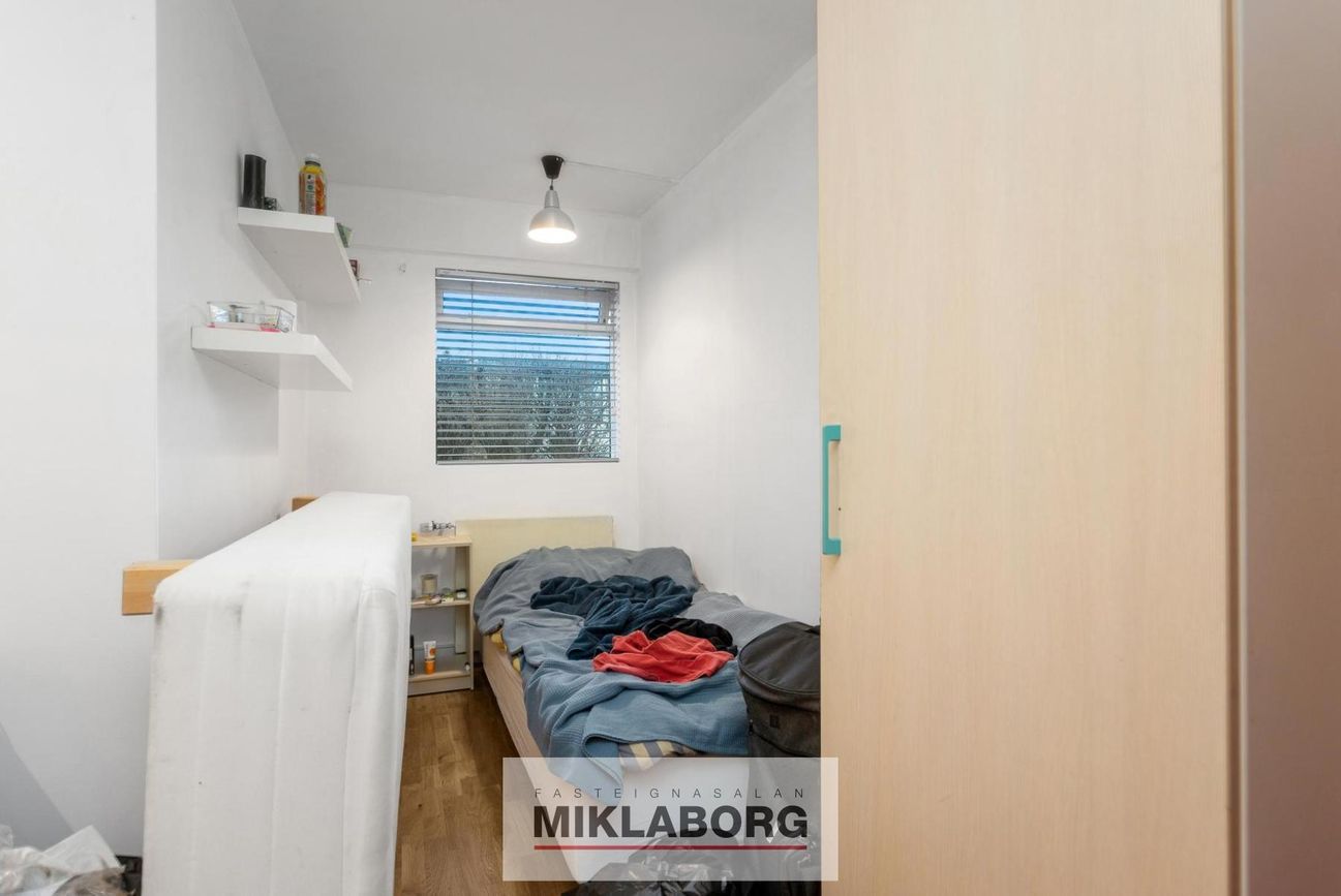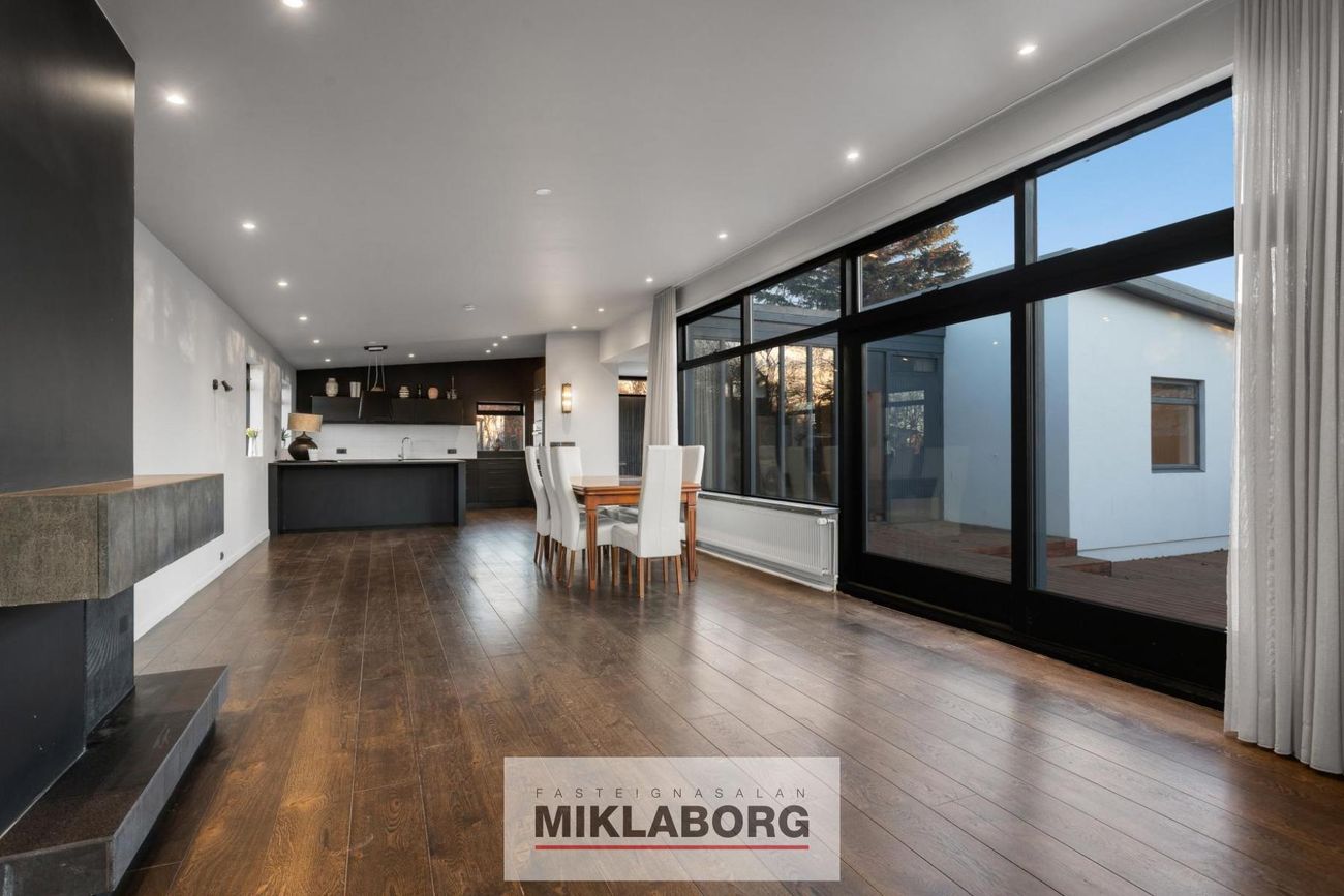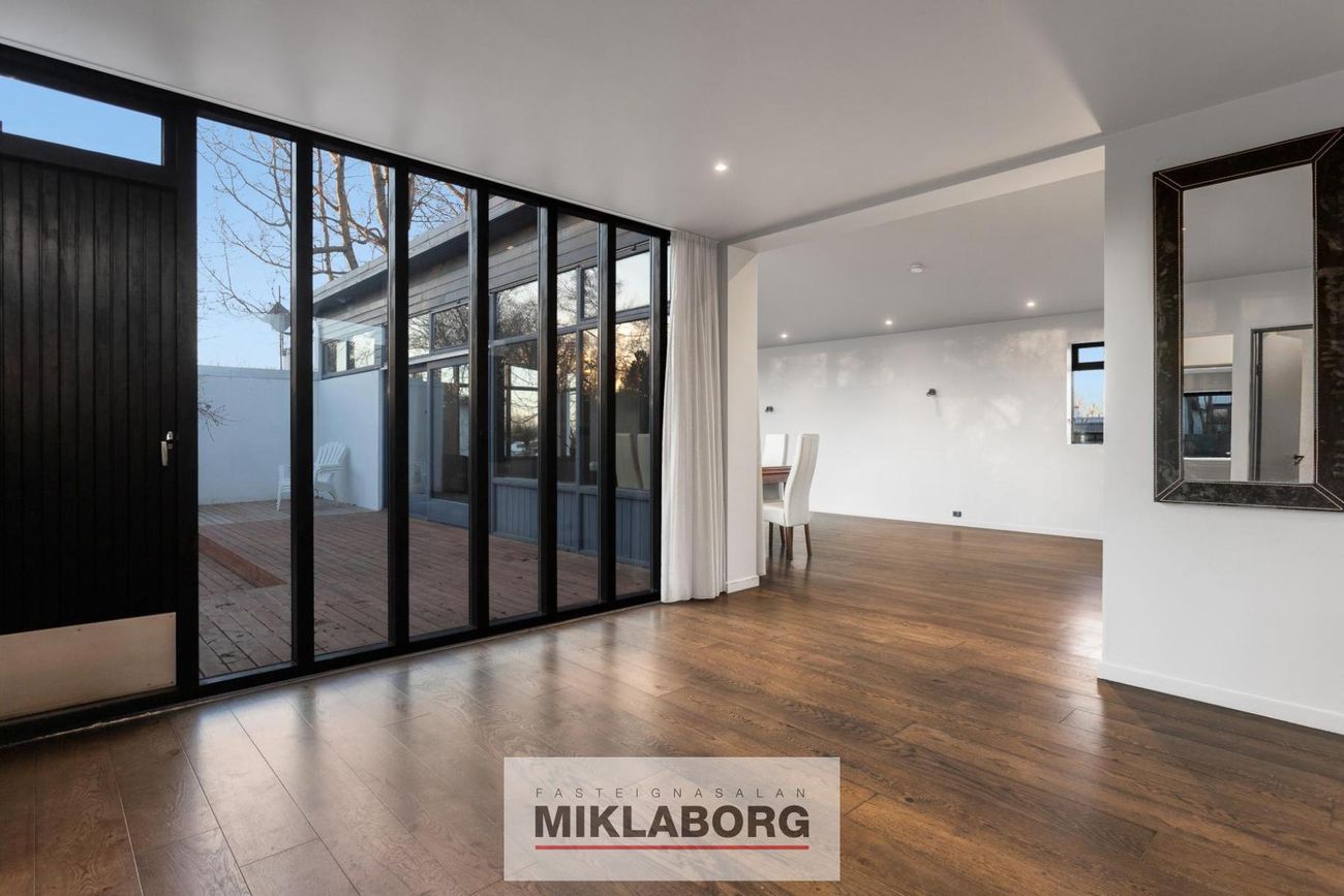 Efri hæð með 4 herbergjum, stórum stofu og opnu eldhúsi. Neðri hæð skipt í þrjár íbúðir með sérstökum aðgangi.