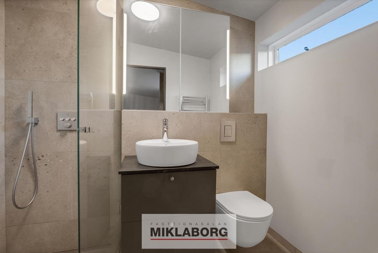 Efri hæð: Flísalagt baðherbergi með baðkari og sturtu. Hjónasvíta með 'walk-in' sturtu. Aukaíbúðir með sturtu eða 'walk-in' sturtu.