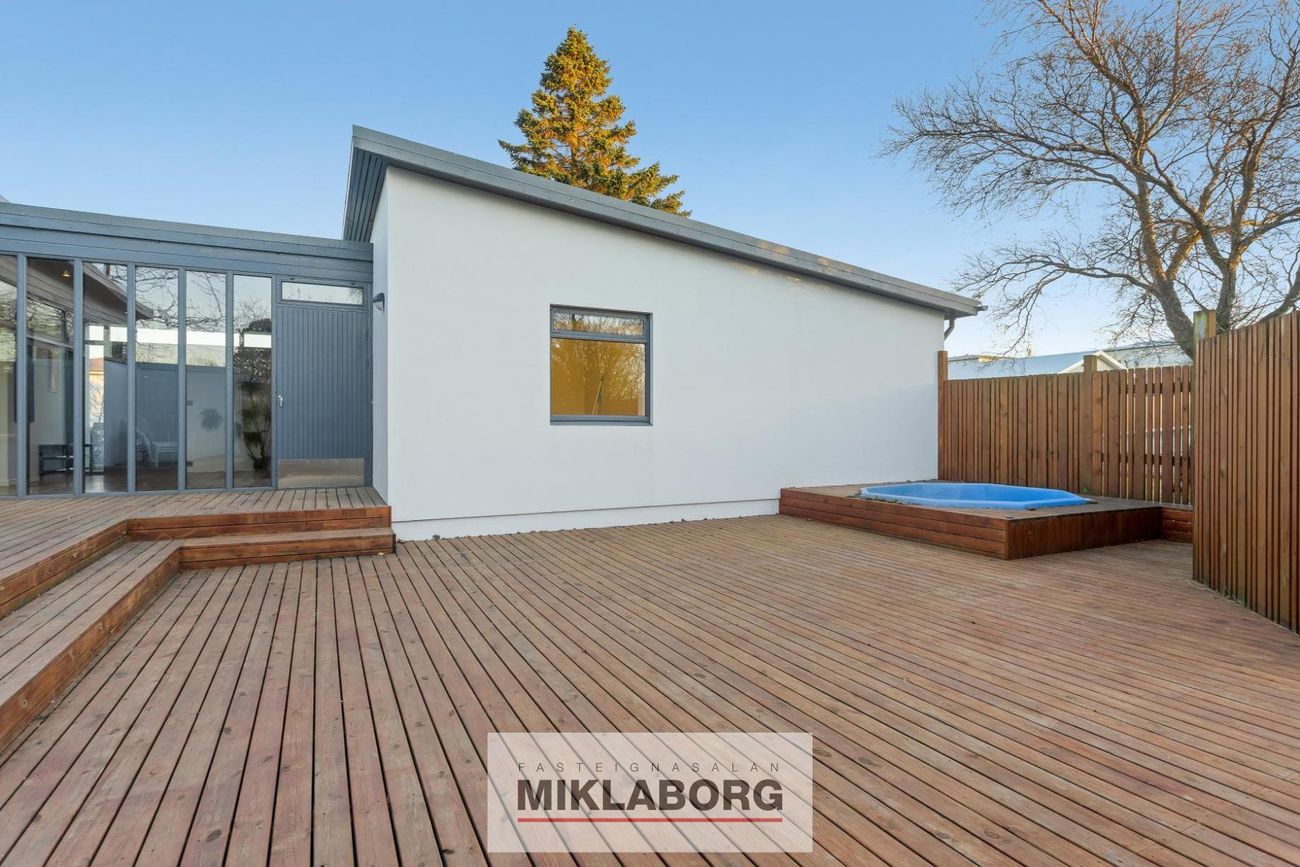 Sólríkur afgirtur pall með heitum potti í suðurátt.