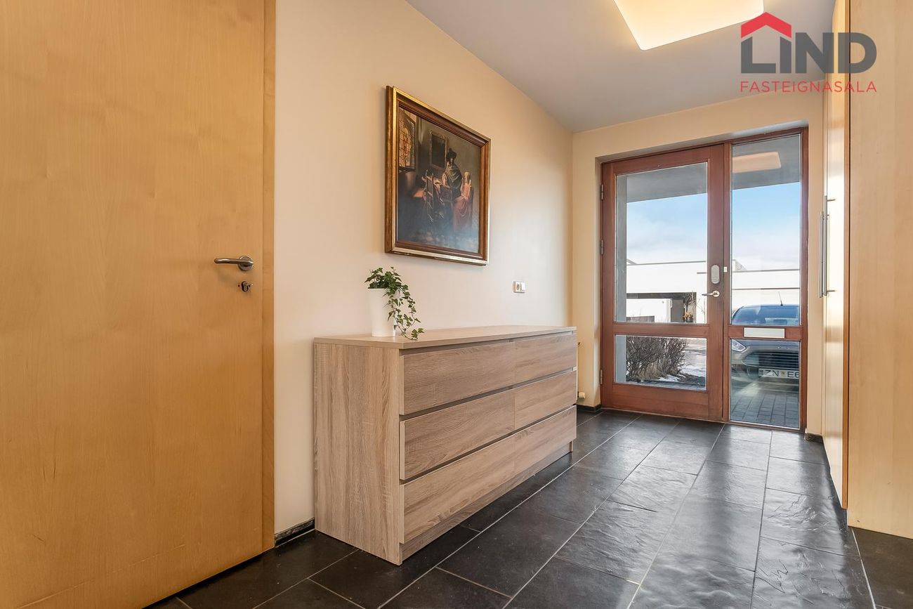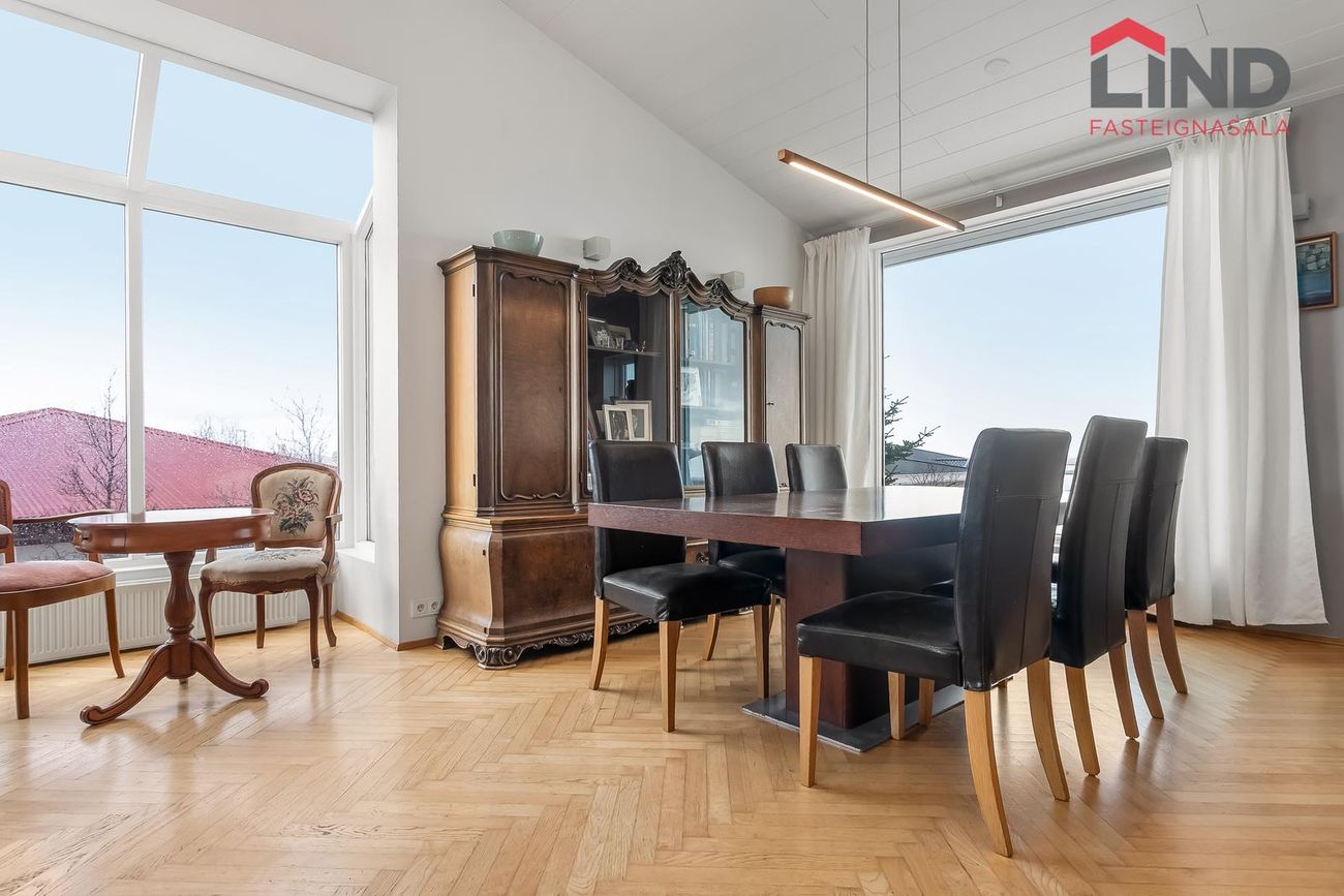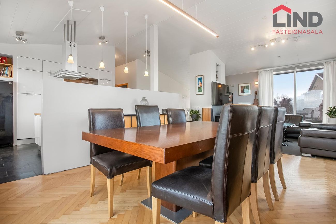LIND fasteignasala og Helga Pálsdóttir löggiltur fasteignasali kynnir rúmgott einbýlishús á tveimur hæðum með fimm rúmgóðum svefnherbergjum og tvöföldum bílskúr. Húsið er skráð 258 m2 þar af er innbyggður 54,3 m2 bílskúr. Skjólsæll bakgarður til suðurs með verönd og heitum potti. Gengið út á svalir til norðurs frá eldhúsi með fallegu útsýni. Alrýmið er bjart og rúmgott. Stór og rúmgóð innkeyrsla með hitalögnum. Um er að ræða fallega eign með stórfenglegu útsýni í botngötu á þessum eftirsótta stað í Garðabæ.Nánari lýsing neðri hæðForstofan er flísalögð og með fataskápum, hiti í gólfi