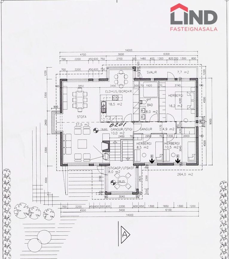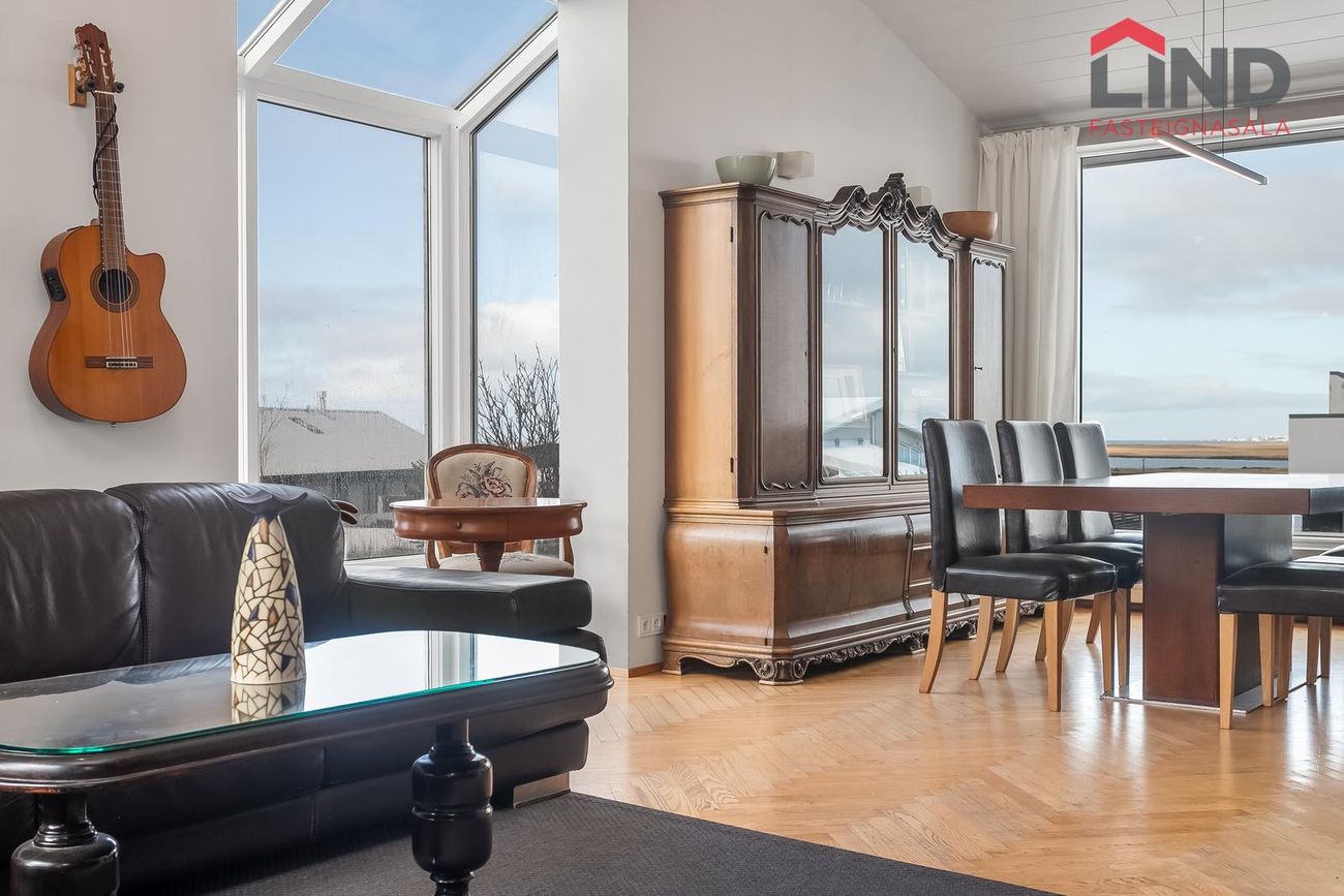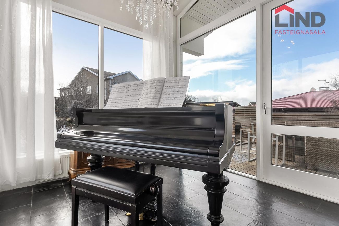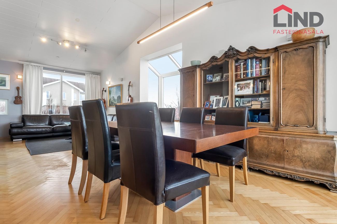 LIND fasteignasala og Helga Pálsdóttir löggiltur fasteignasali kynnir rúmgott einbýlishús á tveimur hæðum með fimm rúmgóðum svefnherbergjum og tvöföldum bílskúr. Húsið er skráð 258 m2 þar af er innbyggður 54,3 m2 bílskúr. Skjólsæll bakgarður til suðurs með verönd og heitum potti. Gengið út á svalir til norðurs frá eldhúsi með fallegu útsýni. Alrýmið er bjart og rúmgott. Stór og rúmgóð innkeyrsla með hitalögnum. Um er að ræða fallega eign með stórfenglegu útsýni í botngötu á þessum eftirsótta stað í Garðabæ.Nánari lýsing neðri hæðForstofan er flísalögð og með fataskápum, hiti í gólfi