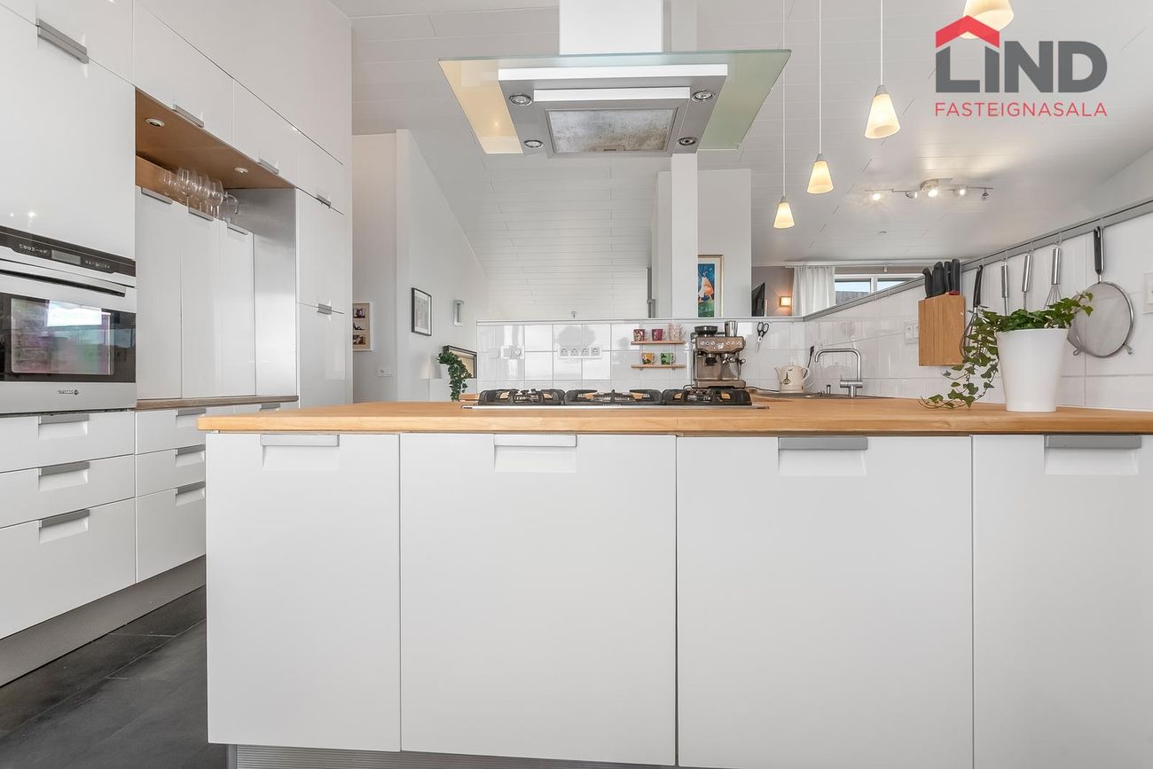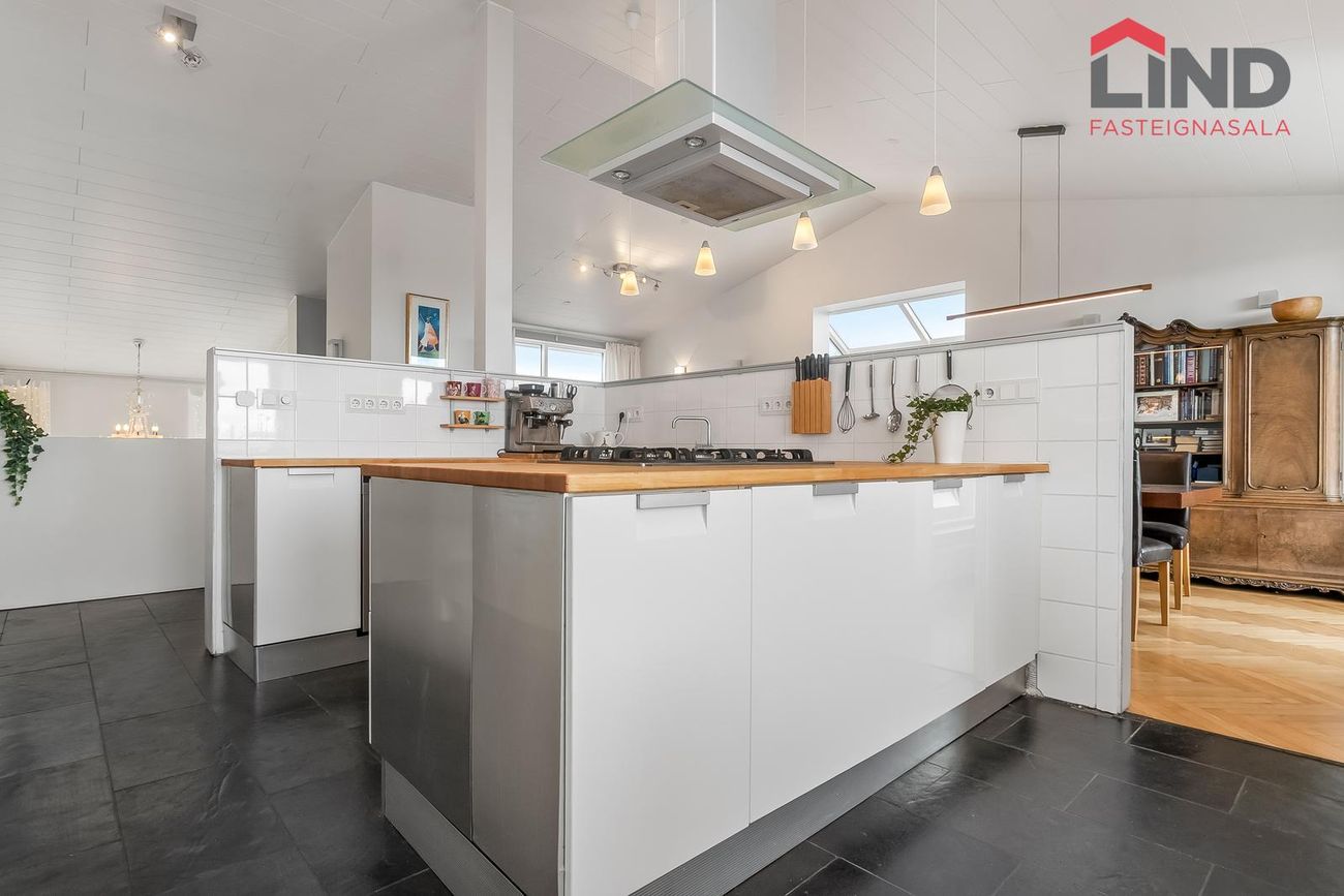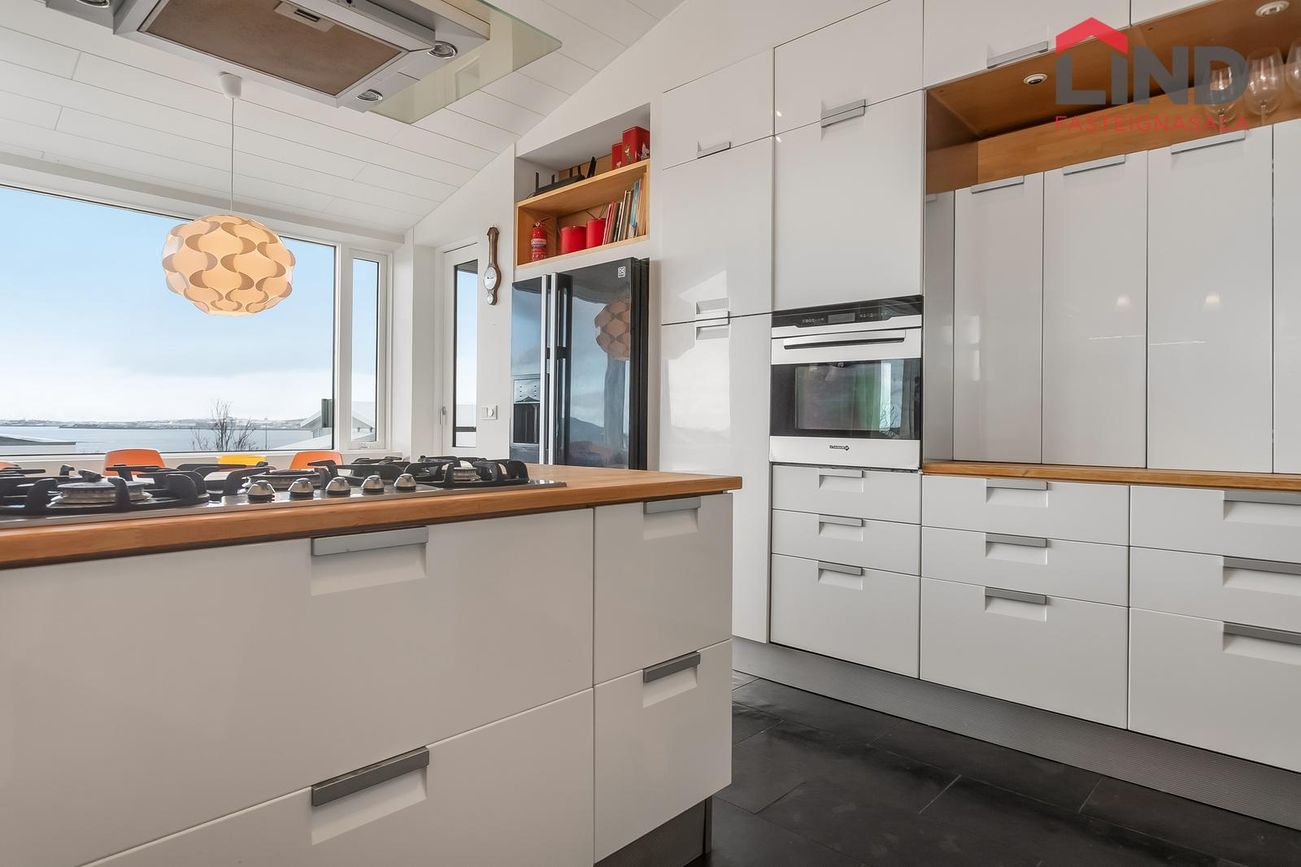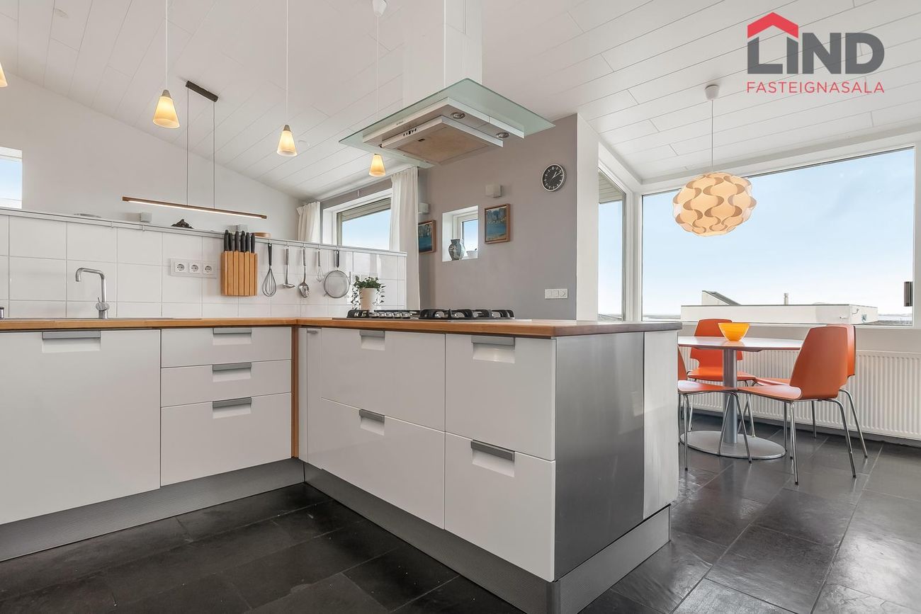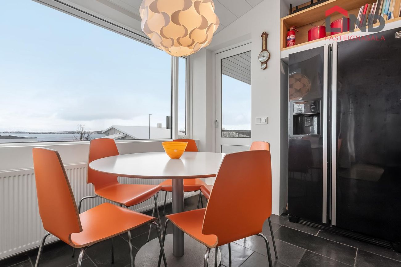 Flísalagður stigi upp á aðra hæð. Útgengt er út á verönd með heitum potti.Efri hæð -Alrými sem er bjart og rúmgott. Eldhús með hvítri InnX innréttingu með olíuborinni viðarborðplötu og gashelluborði. Gert er ráð fyrir tvöföldum ísskáp í innréttingu og uppþvottavél, eldavél á lítilli eyju, flísar á gólfi ,útgengi á svalir er snúa norðurs með stórfenglegu útsýni.
