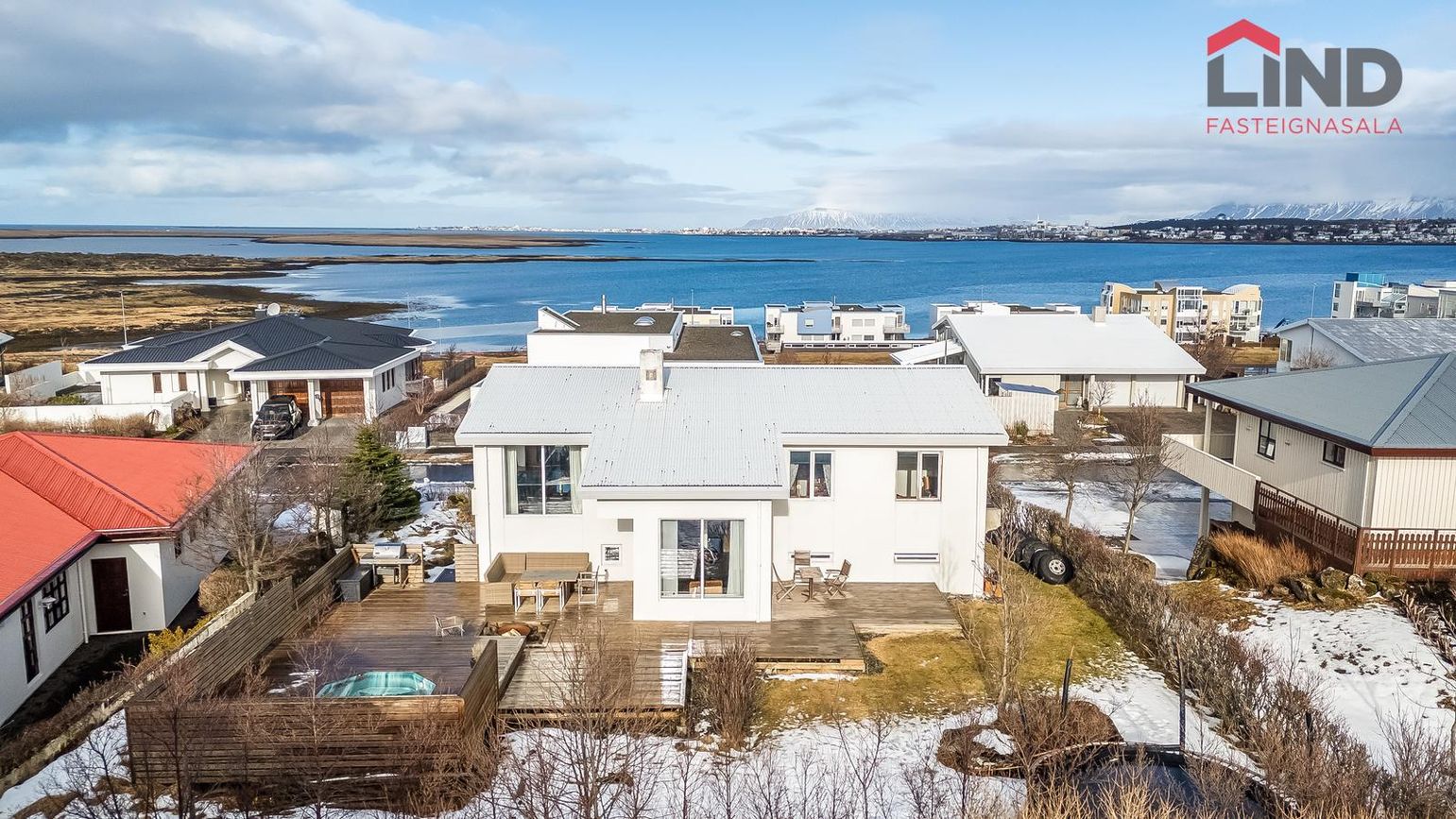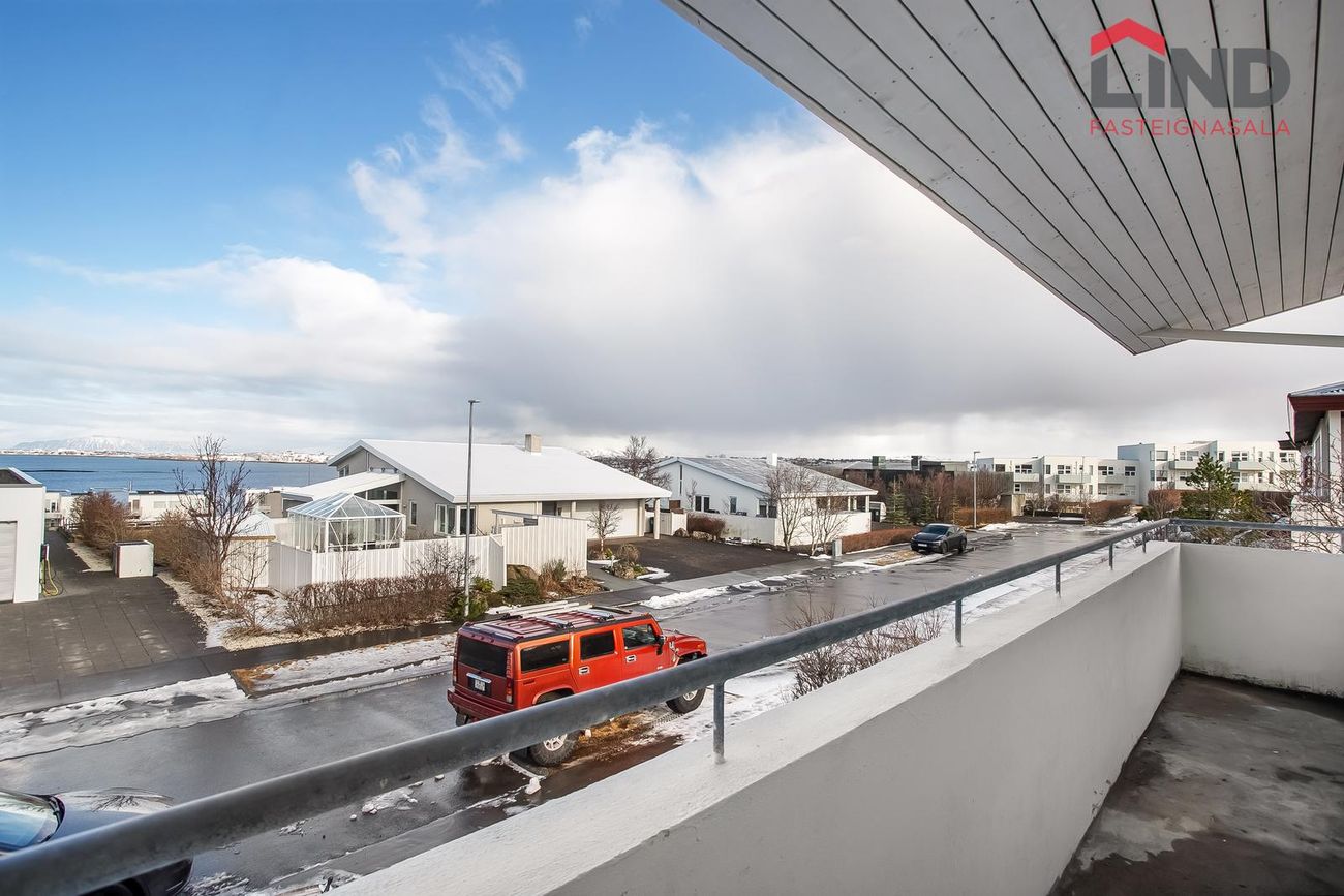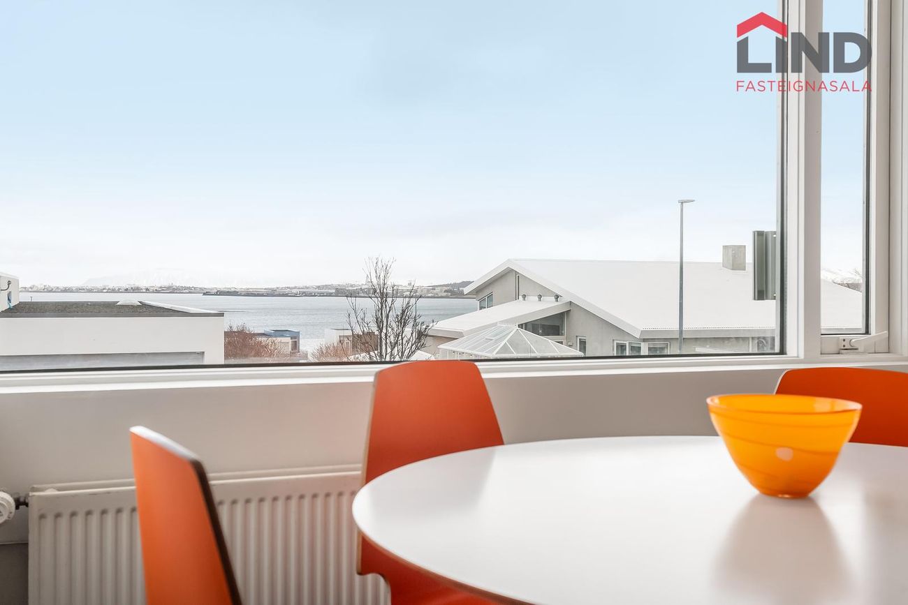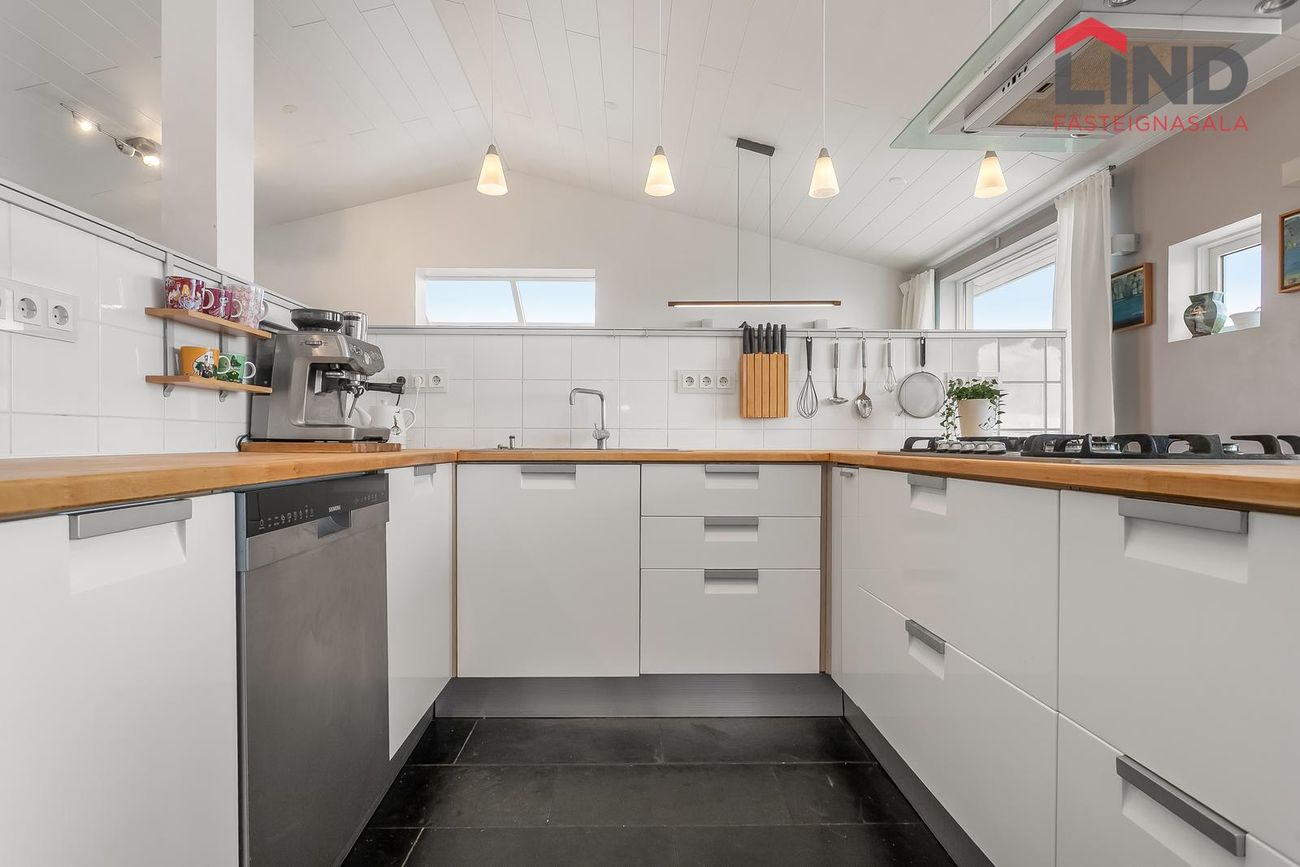 Flísalagður stigi upp á aðra hæð. Útgengt er út á verönd með heitum potti.Efri hæð -Alrými sem er bjart og rúmgott. Eldhús með hvítri InnX innréttingu með olíuborinni viðarborðplötu og gashelluborði. Gert er ráð fyrir tvöföldum ísskáp í innréttingu og uppþvottavél, eldavél á lítilli eyju, flísar á gólfi ,útgengi á svalir er snúa norðurs með stórfenglegu útsýni.