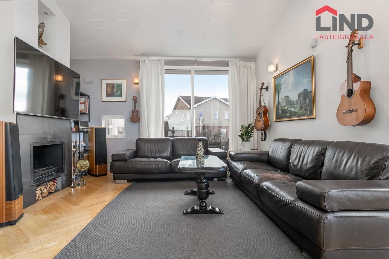 Stofa -borðstofa með gegnheilu parketi á gólfi og fallegum arni.