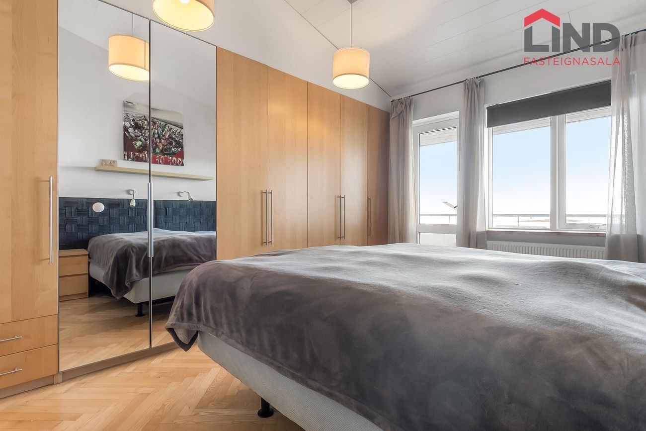 Hjónaherbergið er með parketi á gólfi og fataskáp á heilum vegg.