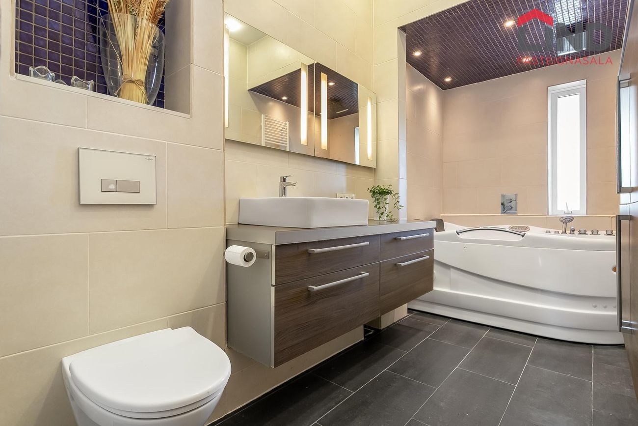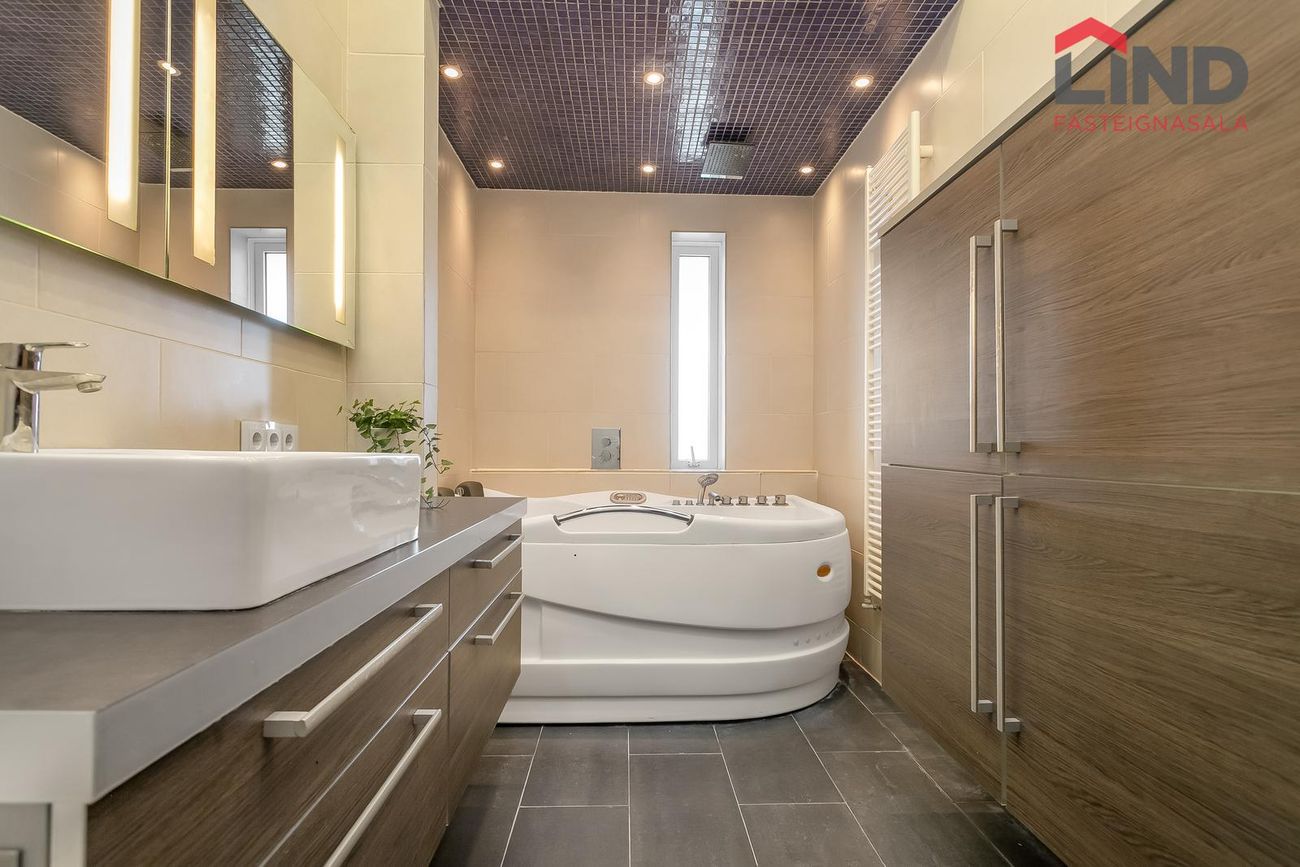 Baðherbergi með stóru baðkari, innréttingu, upphengdu salerni og handklæðaofni. Hiti í gólfi.