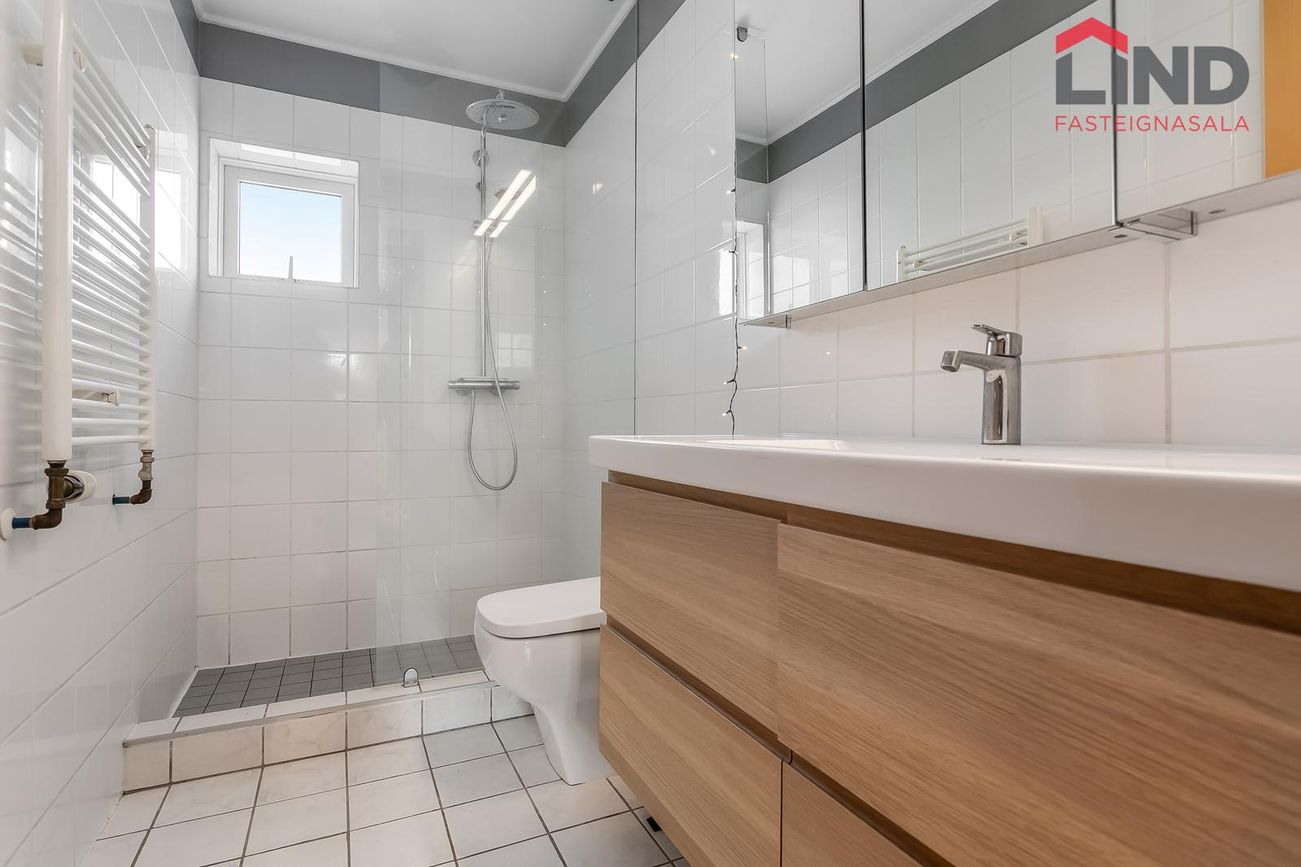 Baðherbergið er með sturtu, innréttingu með efri og neðri skápum, og handklæðaofni. Hiti í gólfi.