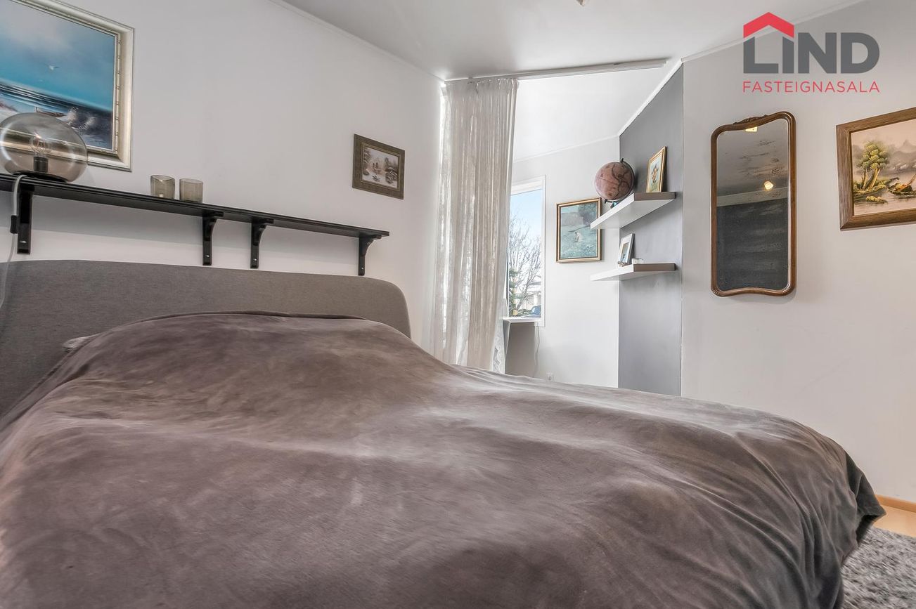 Svefnherbergin á neðri hæðinni eru tvö með parketi, annað með stórum fataskáp.