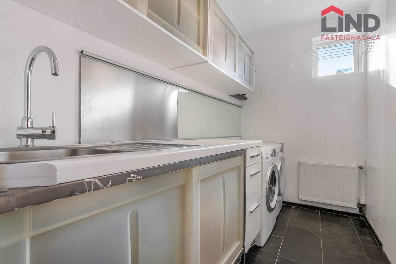 Þvottahús með flísalögðu gólfi og innréttingu þar sem gert er ráð fyrir þvottavél og þurrkara.