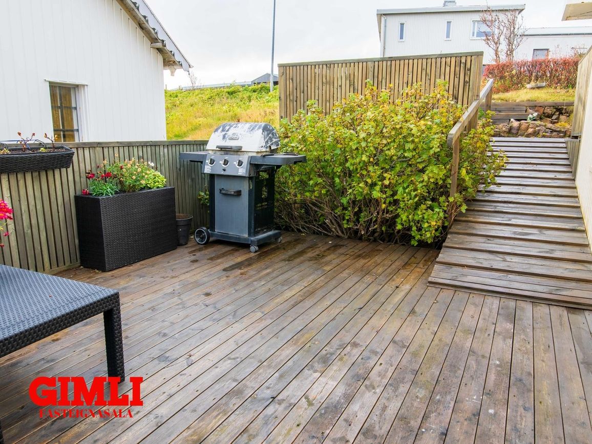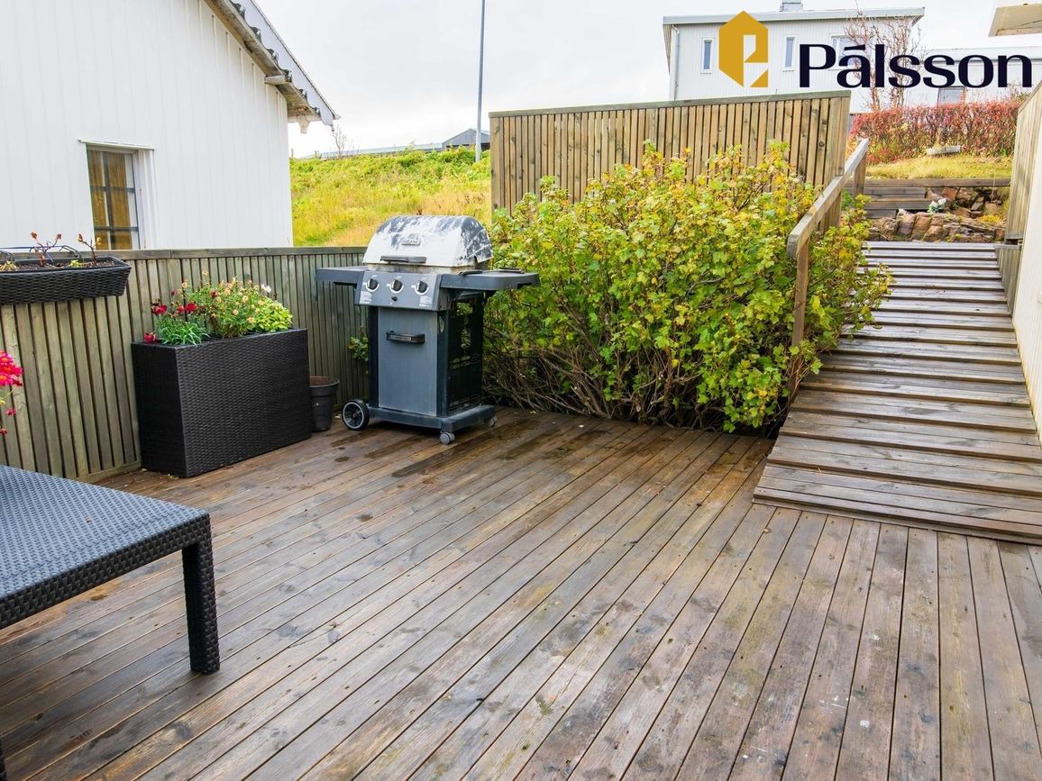 Garðurinn er stór með miklum gróðri, heitur pottur ásamt stórum sólpöllum.