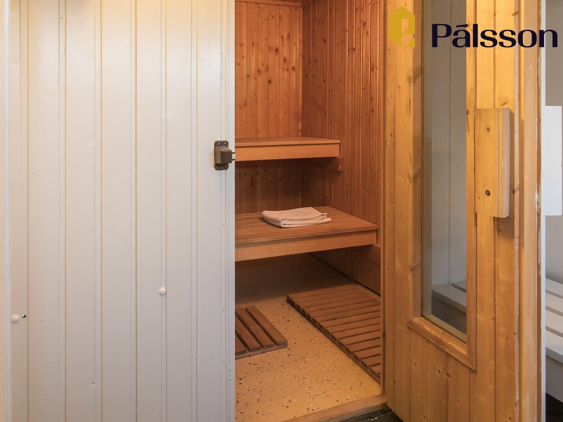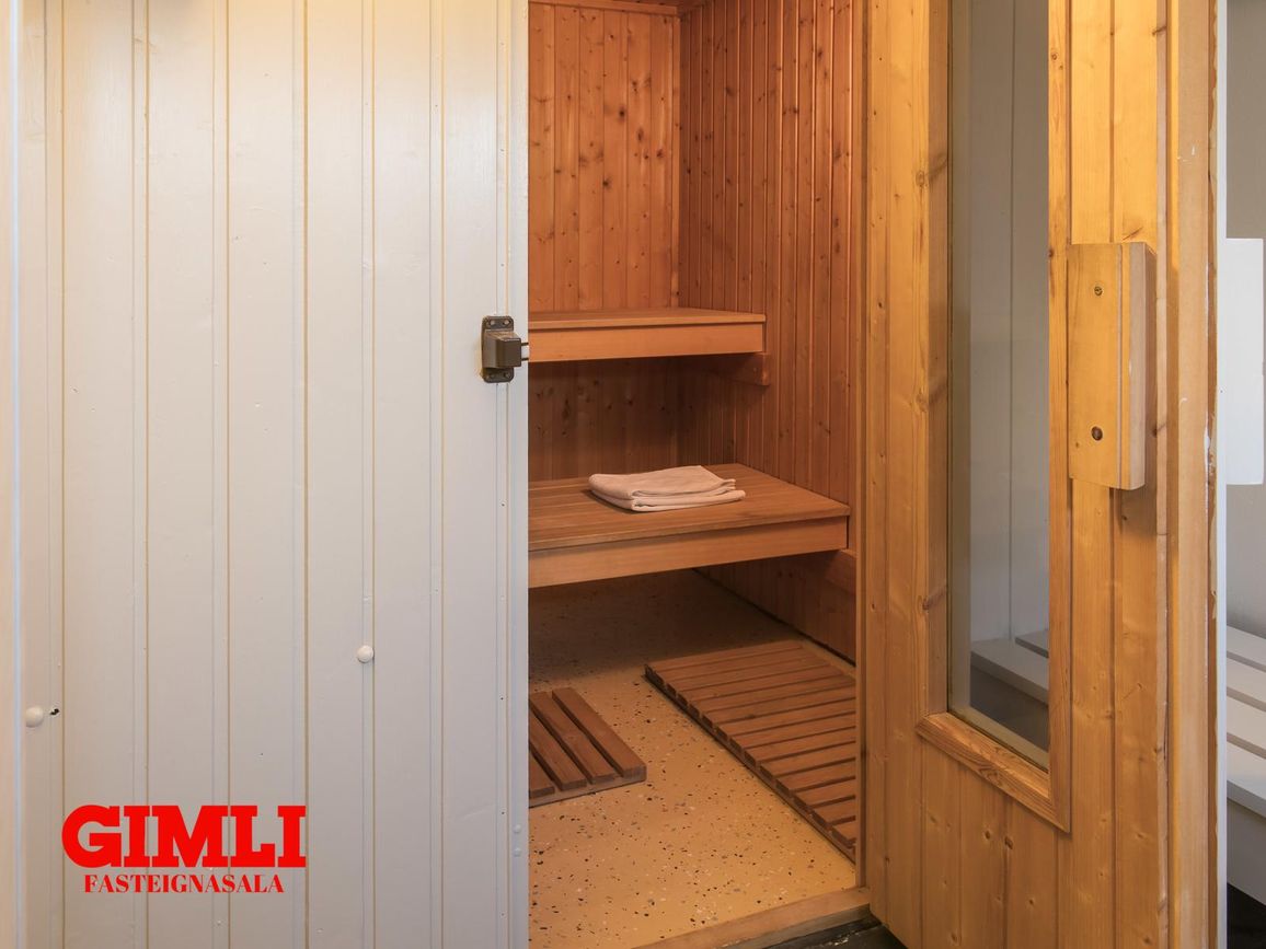 Parket er á öllum rýmum nema flísar á baðherbergi og saunaherberginu.