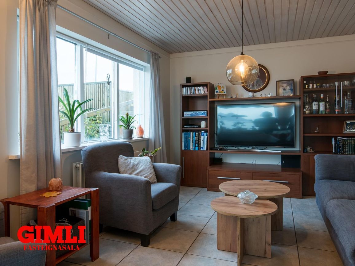 2. hæð er með anddyri, 3 svefnherbergjum, 2 þeirra með parketi á gólfi en 3ja með flísum. Tvö baðherbergi , annað er með baðkari og aðstöðu fyrir þvottavél og þurrkara og hitt er með sturu. Tvær samliggjandi stofur en úr stofunni er gengið út að sunnanverðu á góðan pall, nýleg falleg eldhúsinnrétting og dúkur á gólfi. Flísar eru á gólfi í anddyrinu, stofunni, baðherberginu og einnig í þvottahúsinu. Sakvæmt Þjóðskrá Íslands er 2 hæðin skrá 131 fm.