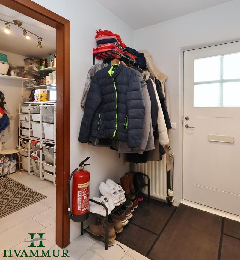 Forstofa er með ljósum flísum á gólfi og opnu fatahengi. Inn af forstofu er rúmgóð