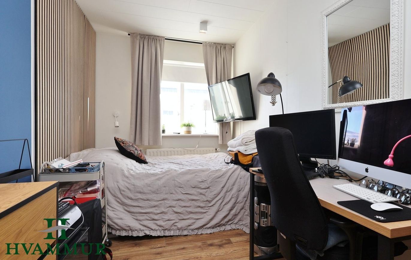 Svefnherbergin eru þrjú, öll með harðparketi á gólfum og fataskápum.