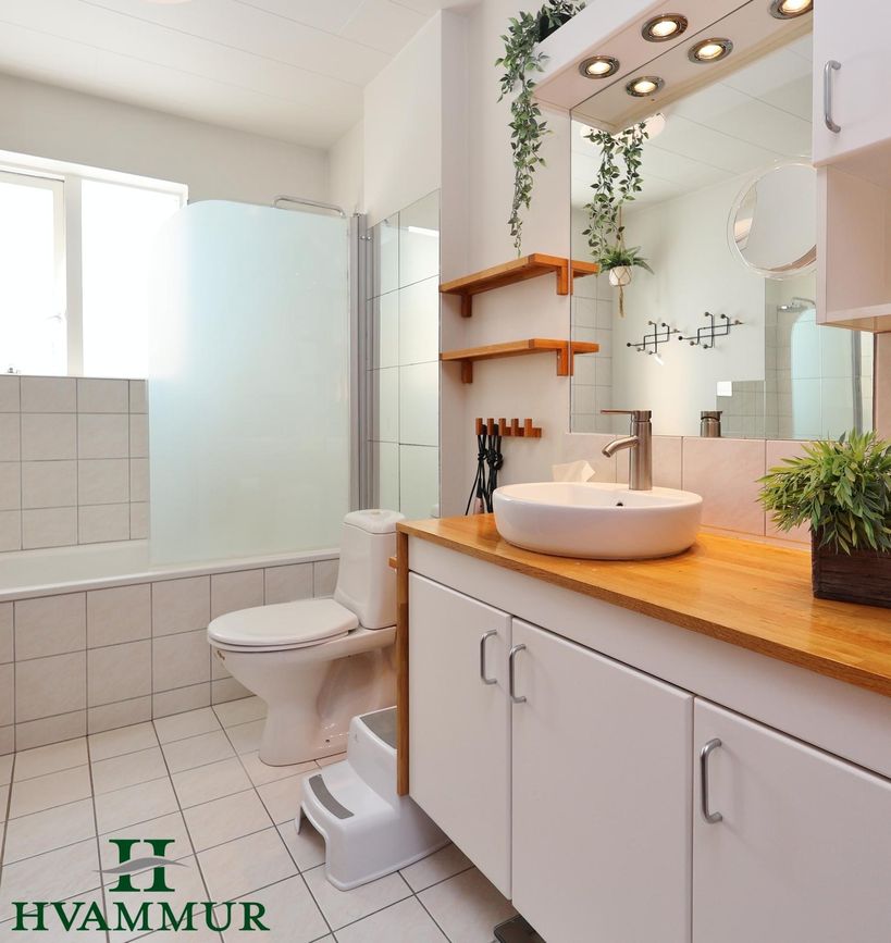 Baðherbergið er með flísum á gólfi og hluta veggja, ljósri innréttingu, baðkari með sturtutækjum og wc. Einnig er stæði fyrir þvottavél og þurrkara og einnig viðarlituð bekkplata og ljósir efriskápar.