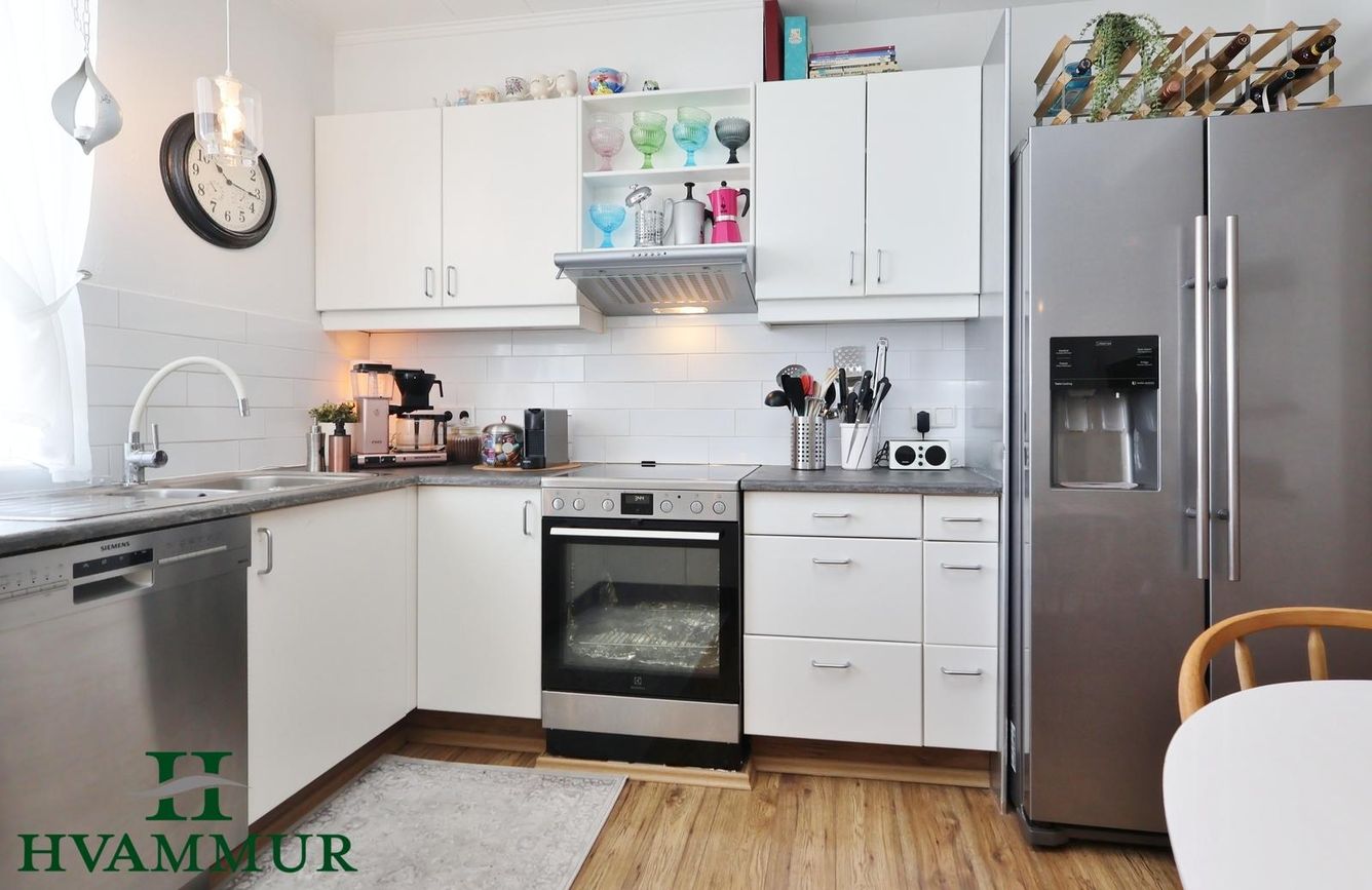 Stofa og eldhús eru í björtu og opnu rými með harðparketi á gólfi. Úr stofu er gengið út á steyptar vestur svalir.