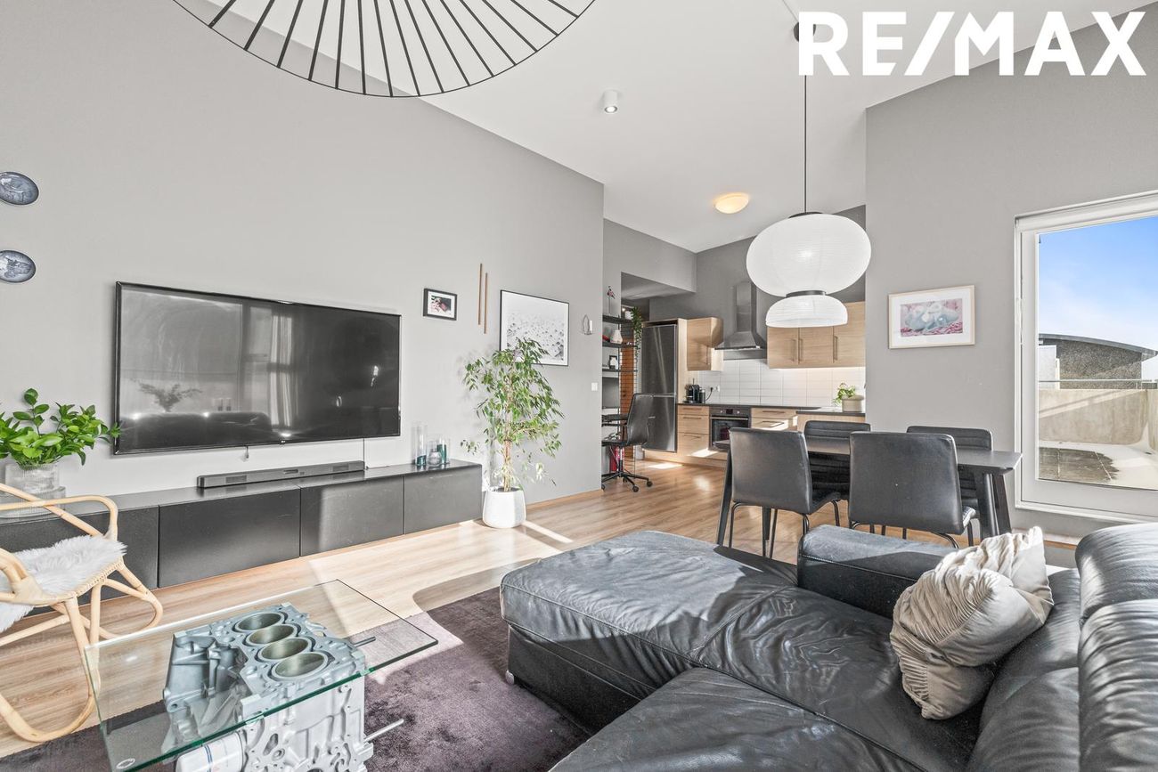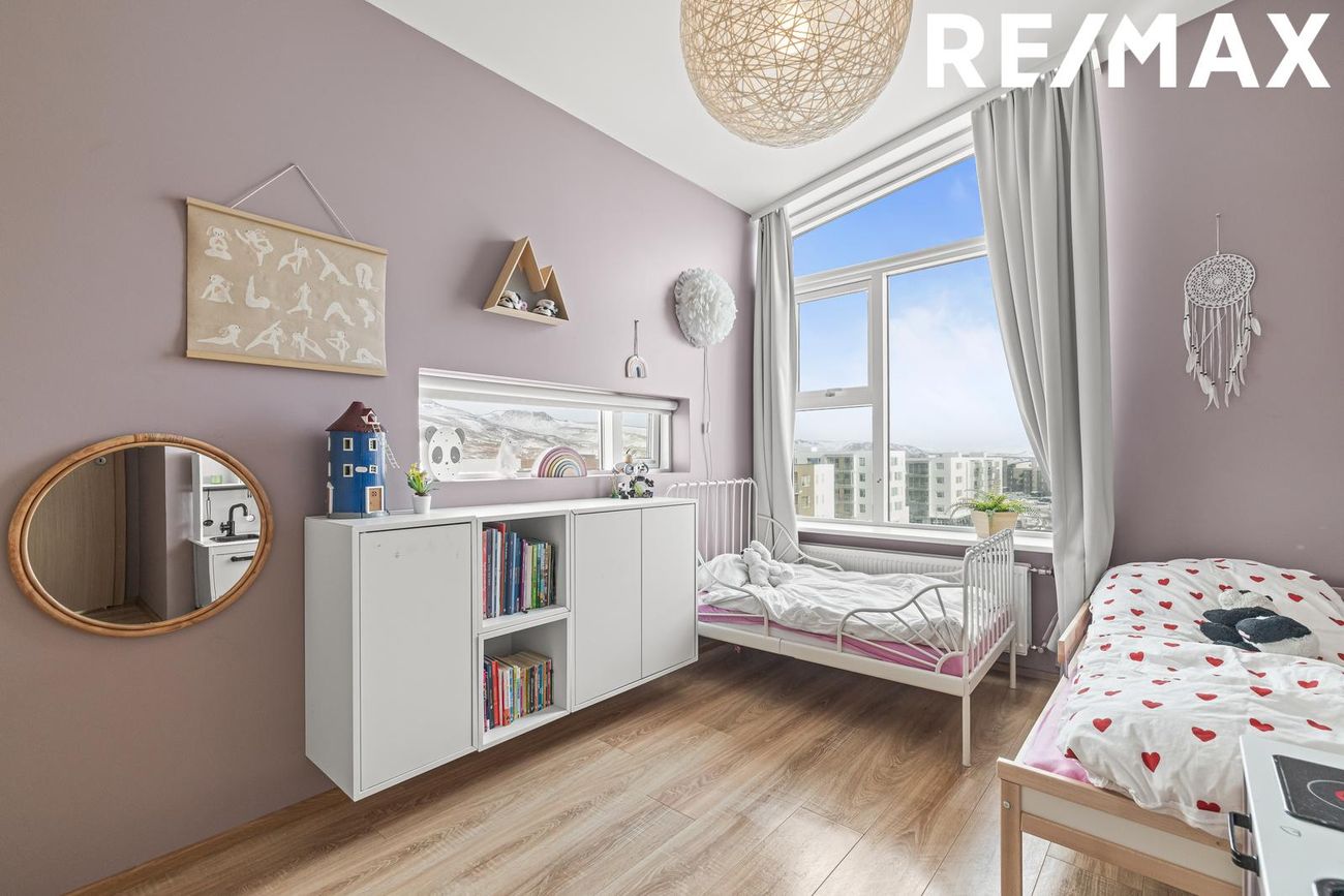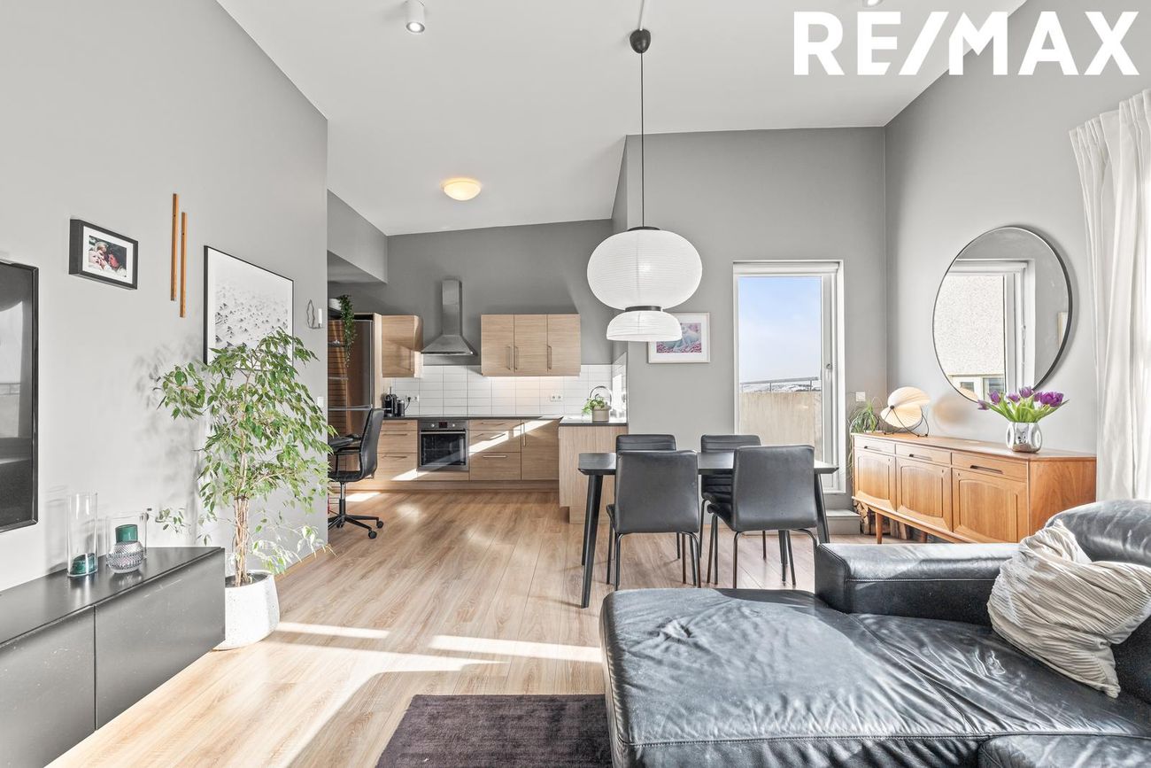 Mikil lofthæð er í íbúðinni og einstaklega fallegt og mikið útsýni úr almennt öllum rýmum íbúðar. Eignin er staðsett í vinsælu og grónu fjölskylduvænu hverfi þar sem stutt er í grunn- og leikskóla, íþróttasvæði FRAM, sund, bókasafnið og fallegar gönguleiðir um dalinn.