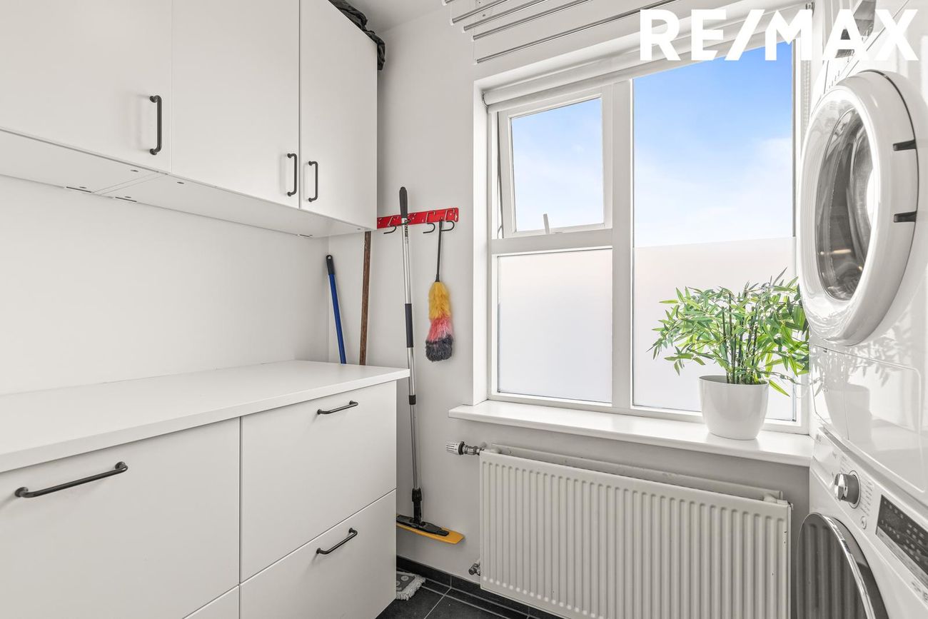 Þvottahús er inn af baðherberginu og er hvít innrétting með góðu skápaplássi á móts við þvottavél og þurrkara. Gluggi er á baðherberginu sem tryggir góða loftræstingu. Flísar eru á gólfi og hluta veggja.