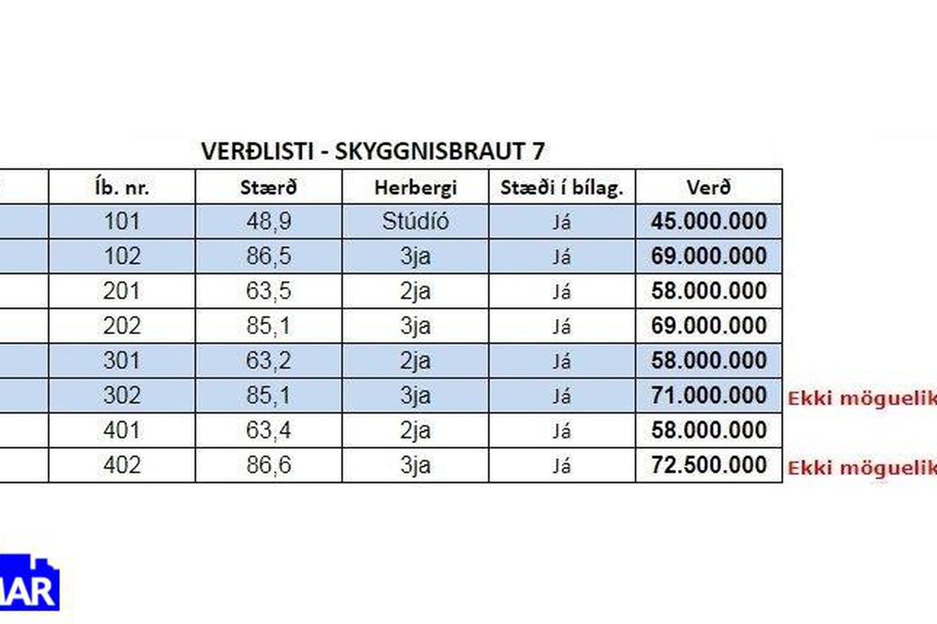 | 3 | 85,10 m² | 71.500.000 kr. 14. mars 2024 | 69.000.000 kr. 13. september 2023 |