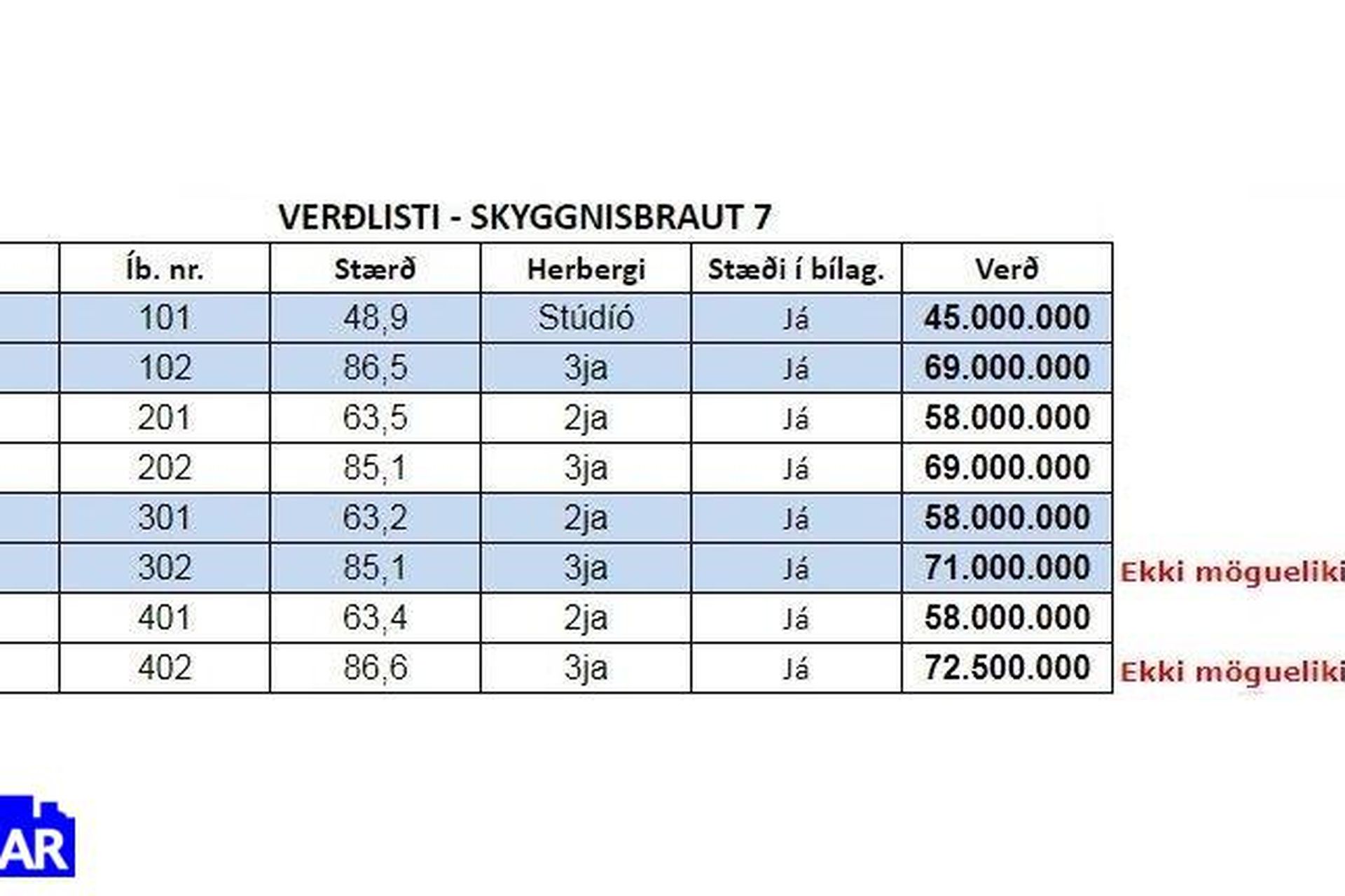 | Íbúð | Herbergi | Stærð | Síðasta ásetta verð | Síðasti kaupsamningur |