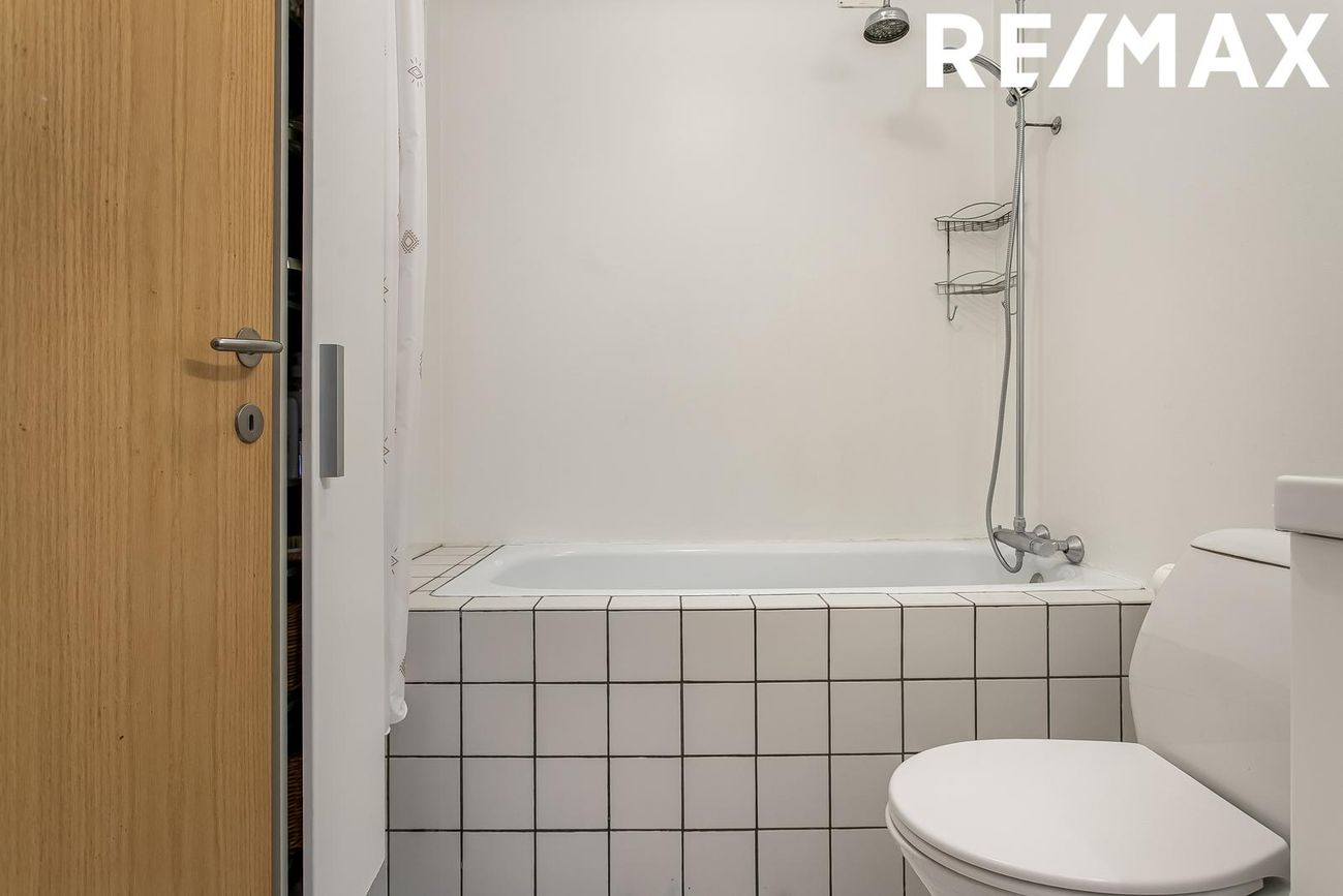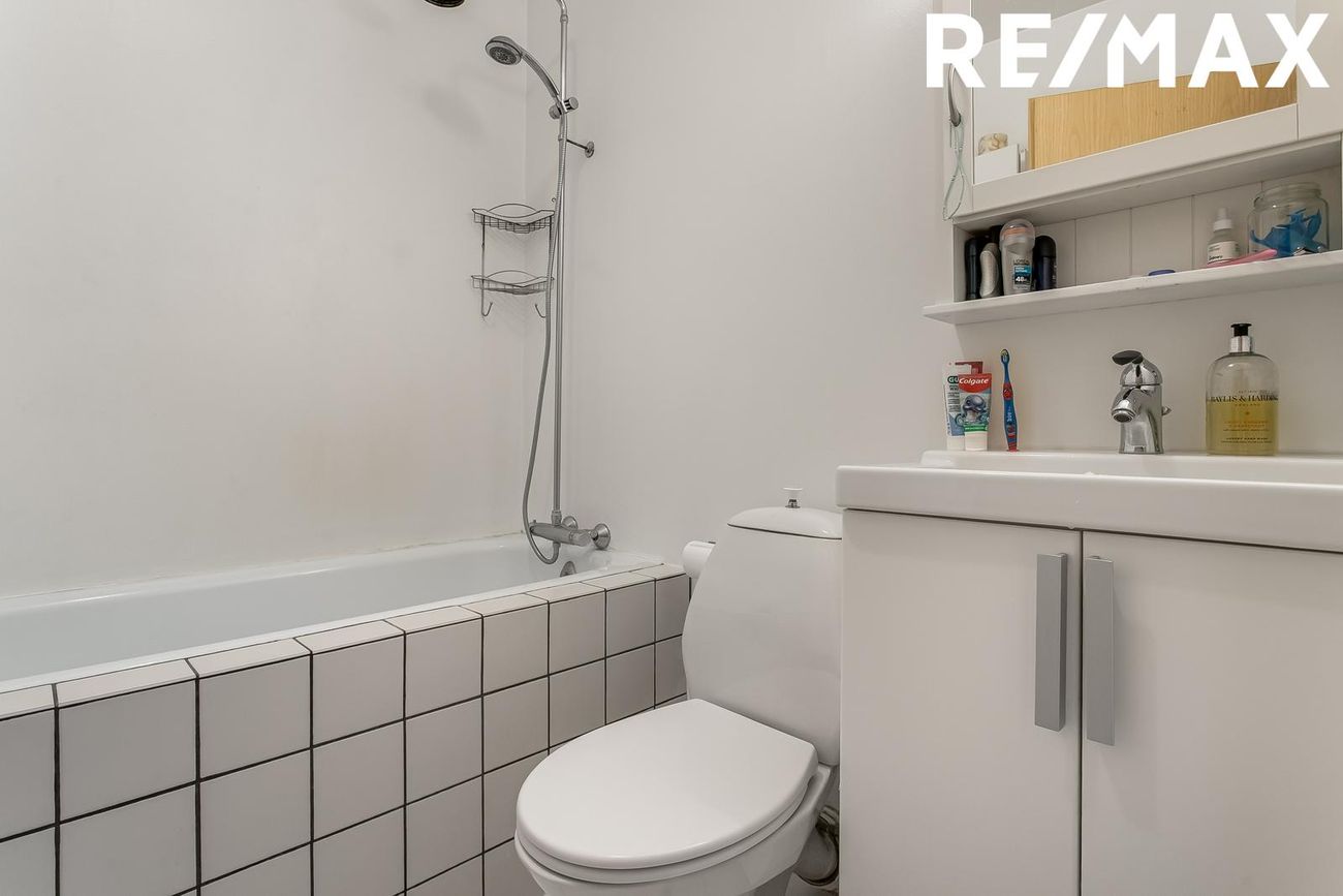 Baðherbergi með baðkari með sturtu aðstöðu. Flísar á gólfi. Vaskinnrétting og handklæðaskápur.