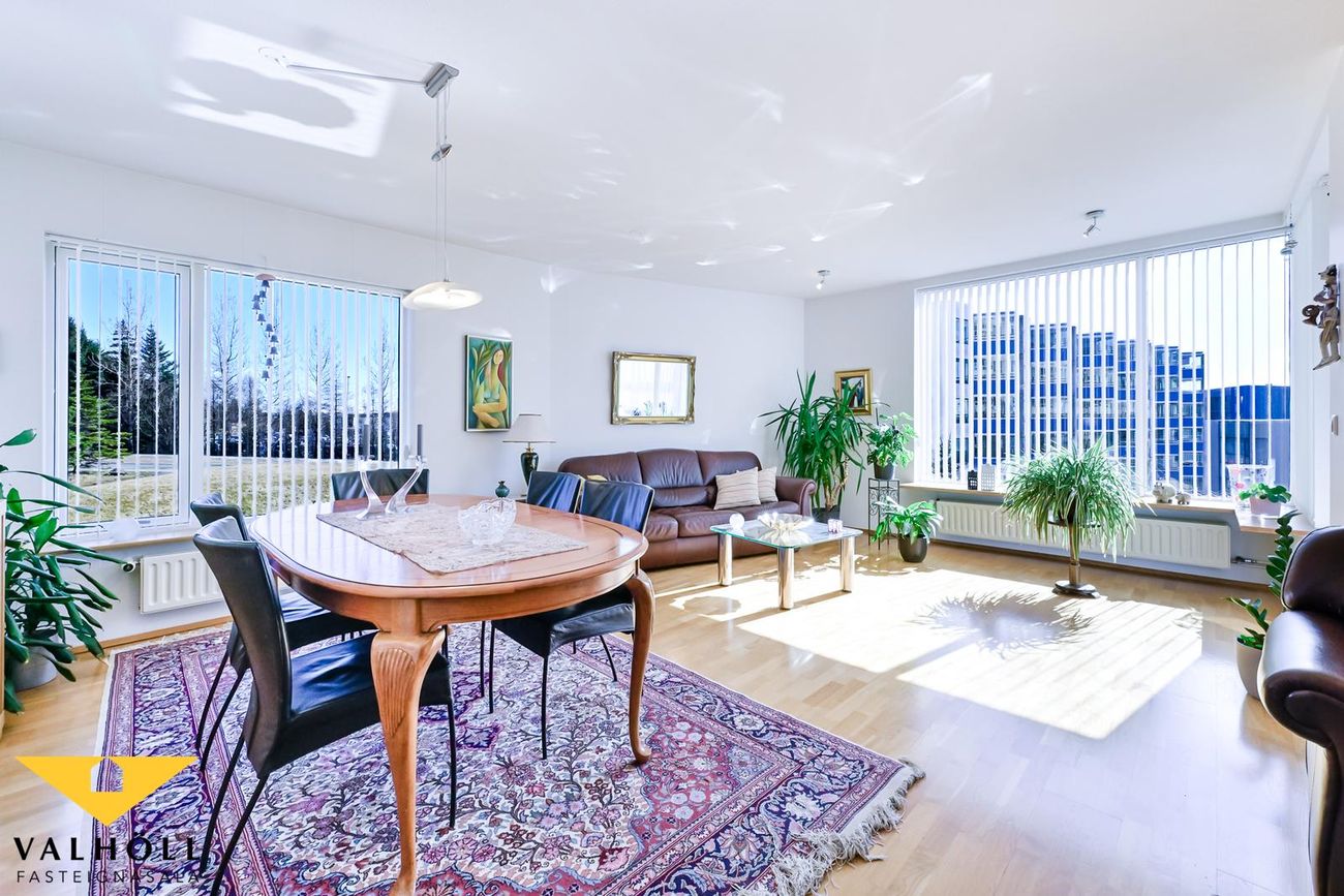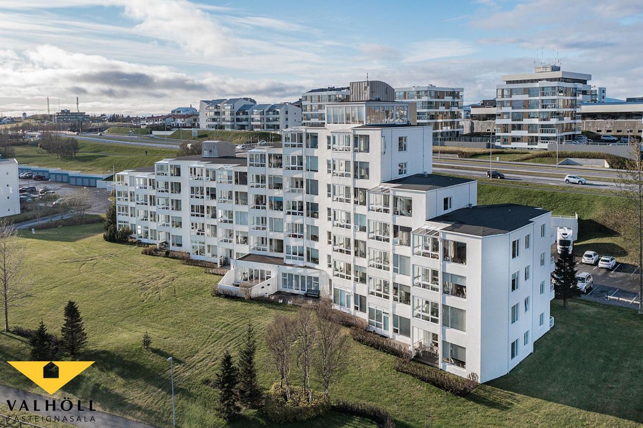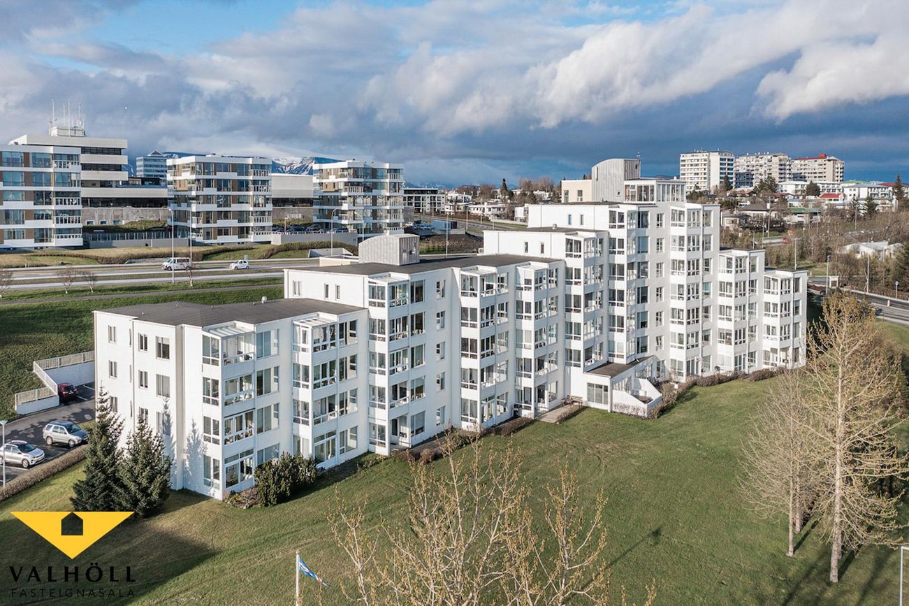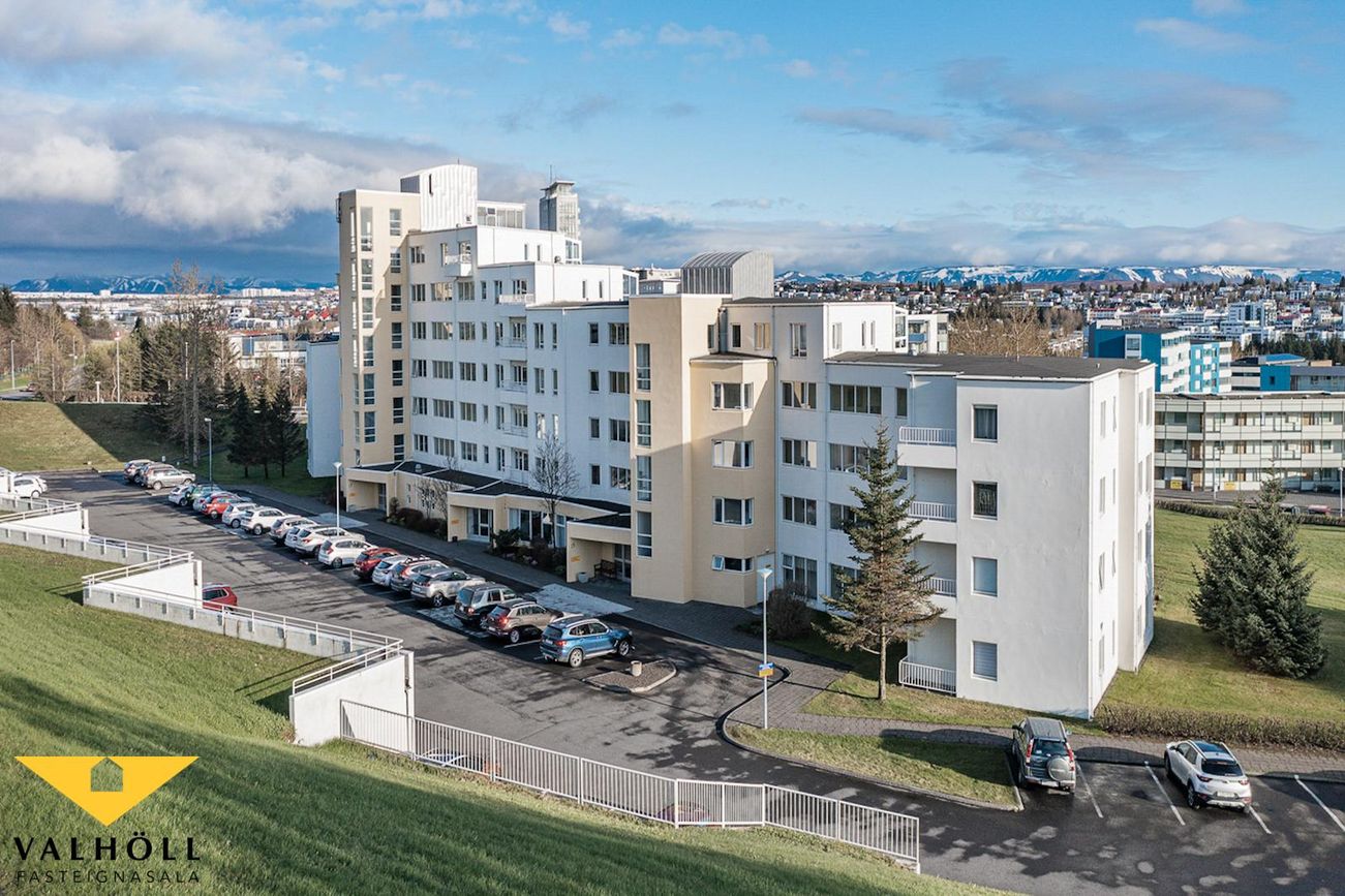 Valhöll fasteignasala, Síðumúla 27, sími:588-4477 og Ingólfur Gissurarson löggiltur Fasteignasali og leigumiðlari, síðan 1989, sími:896-5222, kynna: Falleg og stór 137,6 fm endaíbúð, (145,5 fm með yfirbyggðum svölum meða svalalokun), á 2.hæð ásamt 23,1 fm bílskúr í eftirsóttu lyftuhúsi fyrir 55 ára og eldri, á góðum stað við Borgarspítalan. Stutt í alla þjónustu. Mjög góð sameiginleg aðstaða á jarðhæð hússins þar sem eru setustofur, rúmgóður veislusalur (fyrir um 60 manns) með eldhúsi, er til reiðu fyrir íbúa gegn vægri leigu. Snyrti og hárgreiðslustofa. Tækjasalur með búningsherbergjum+sturtu, saunaklefa og heitum potti á lóð. Mjög góður húsvörður sér um daglegan rekstur húsfélagsins. SKIPULAG: Forstofa með skápum. Gestasnyrting flísalögð innaf forstofu. Hol og gangur. Hjónaherbergi með góðum skápum. útgengt úr því á norð-austur svalir flísalagðar. Annað rúmgott herbergi. Gluggalaus geymsla innaf gangi sem getur verið með sérlögn fyrir þvottavél. Baðherbergi með sturtu og baðkari, innréttingu og glugga. Dúkur á gólfi, flísar á veggjum. Rúmgott eldhús með borðkrók, mjög góð Alno innrétting, flísar milli skápa og innbygg uppþvottavél fylgir. Mjög stór stofa og borðstofa / sjónvarpsstofa. Útgengt úr stofu á góðar um 8 fm yfirbyggðar flísalagðar suðvestur svalir með svalalokun. Gott útsýni. Gólfefni íbúðar: Eikarparket á allri íbúðinni nema flísar á gestasnyrtingu, dúkur á baði og geymslu. Bílskúr í bílskúralengju gengt húsinu, með hita, rafmagni og köldu vatni.