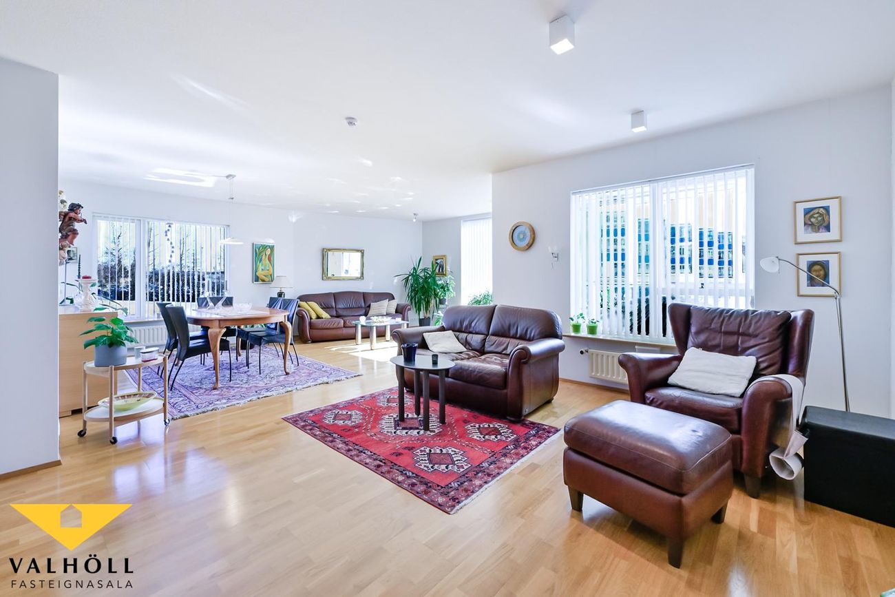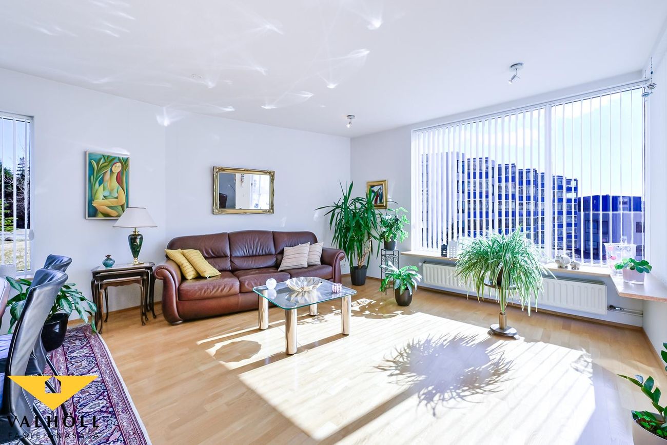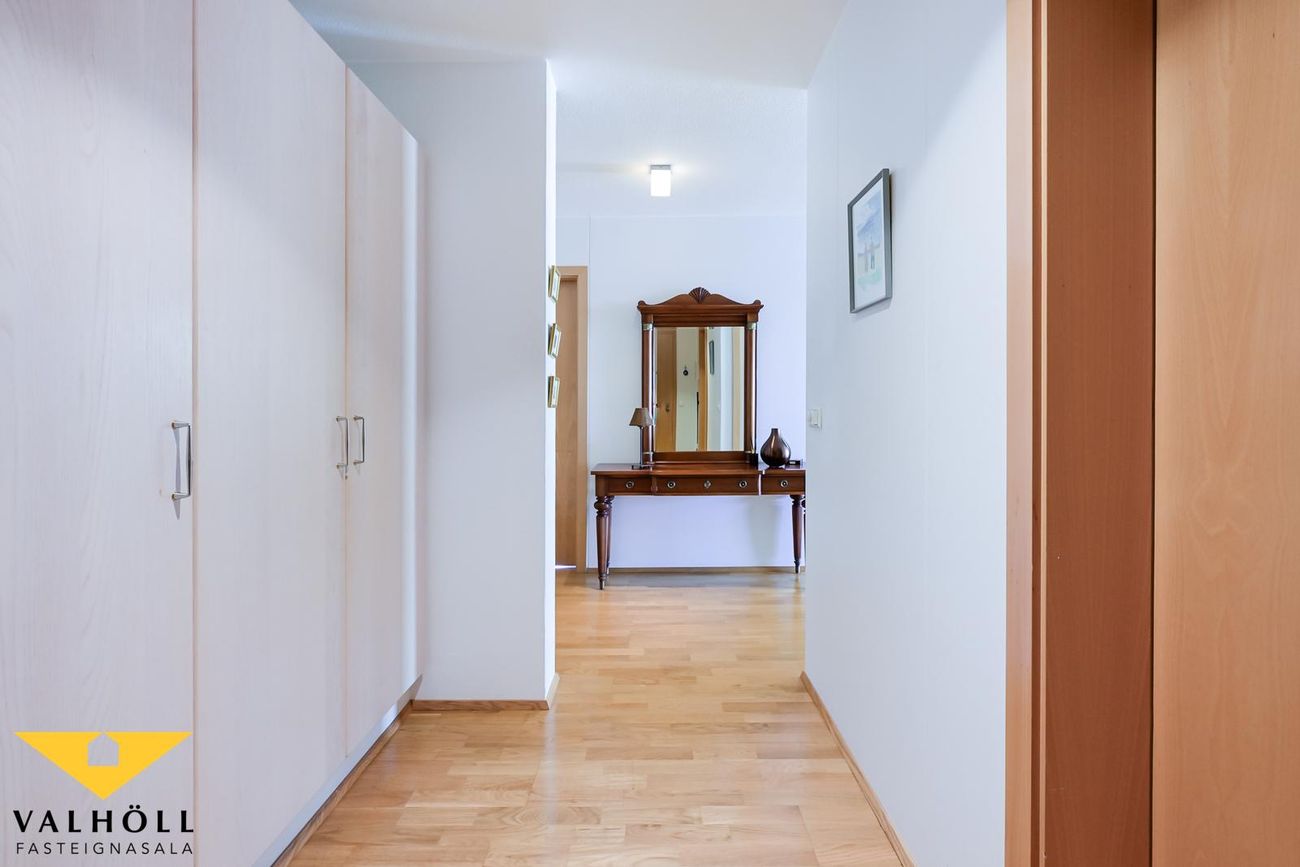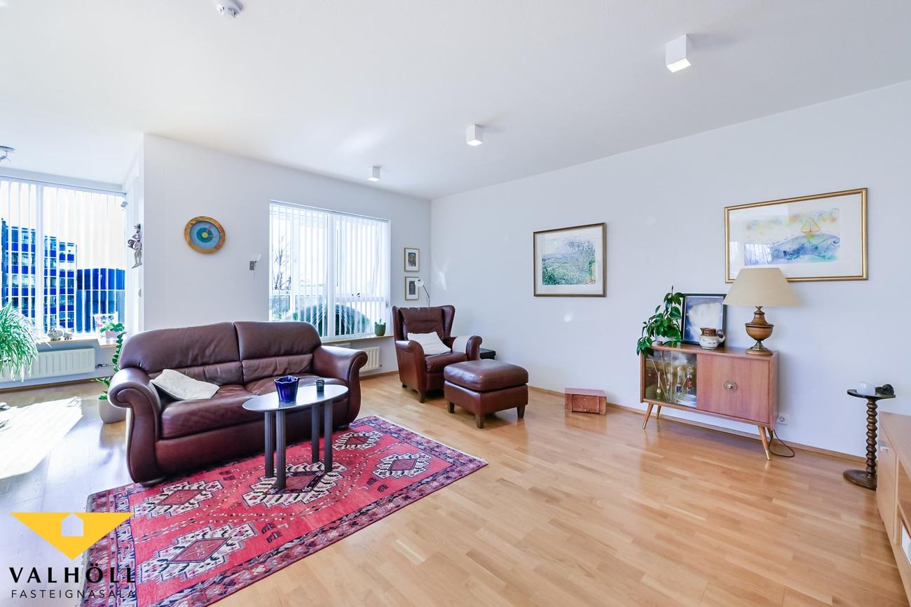 Valhöll fasteignasala, Síðumúla 27, sími:588-4477 og Ingólfur Gissurarson löggiltur Fasteignasali og leigumiðlari, síðan 1989, sími:896-5222, kynna: Falleg og stór 137,6 fm endaíbúð, (145,5 fm með yfirbyggðum svölum meða svalalokun), á 2.hæð ásamt 23,1 fm bílskúr í eftirsóttu lyftuhúsi fyrir 55 ára og eldri, á góðum stað við Borgarspítalan. Stutt í alla þjónustu. Mjög góð sameiginleg aðstaða á jarðhæð hússins þar sem eru setustofur, rúmgóður veislusalur (fyrir um 60 manns) með eldhúsi, er til reiðu fyrir íbúa gegn vægri leigu. Snyrti og hárgreiðslustofa. Tækjasalur með búningsherbergjum+sturtu, saunaklefa og heitum potti á lóð. Mjög góður húsvörður sér um daglegan rekstur húsfélagsins. SKIPULAG: Forstofa með skápum. Gestasnyrting flísalögð innaf forstofu. Hol og gangur. Hjónaherbergi með góðum skápum. útgengt úr því á norð-austur svalir flísalagðar. Annað rúmgott herbergi. Gluggalaus geymsla innaf gangi sem getur verið með sérlögn fyrir þvottavél. Baðherbergi með sturtu og baðkari, innréttingu og glugga. Dúkur á gólfi, flísar á veggjum. Rúmgott eldhús með borðkrók, mjög góð Alno innrétting, flísar milli skápa og innbygg uppþvottavél fylgir. Mjög stór stofa og borðstofa / sjónvarpsstofa. Útgengt úr stofu á góðar um 8 fm yfirbyggðar flísalagðar suðvestur svalir með svalalokun. Gott útsýni. Gólfefni íbúðar: Eikarparket á allri íbúðinni nema flísar á gestasnyrtingu, dúkur á baði og geymslu. Bílskúr í bílskúralengju gengt húsinu, með hita, rafmagni og köldu vatni.