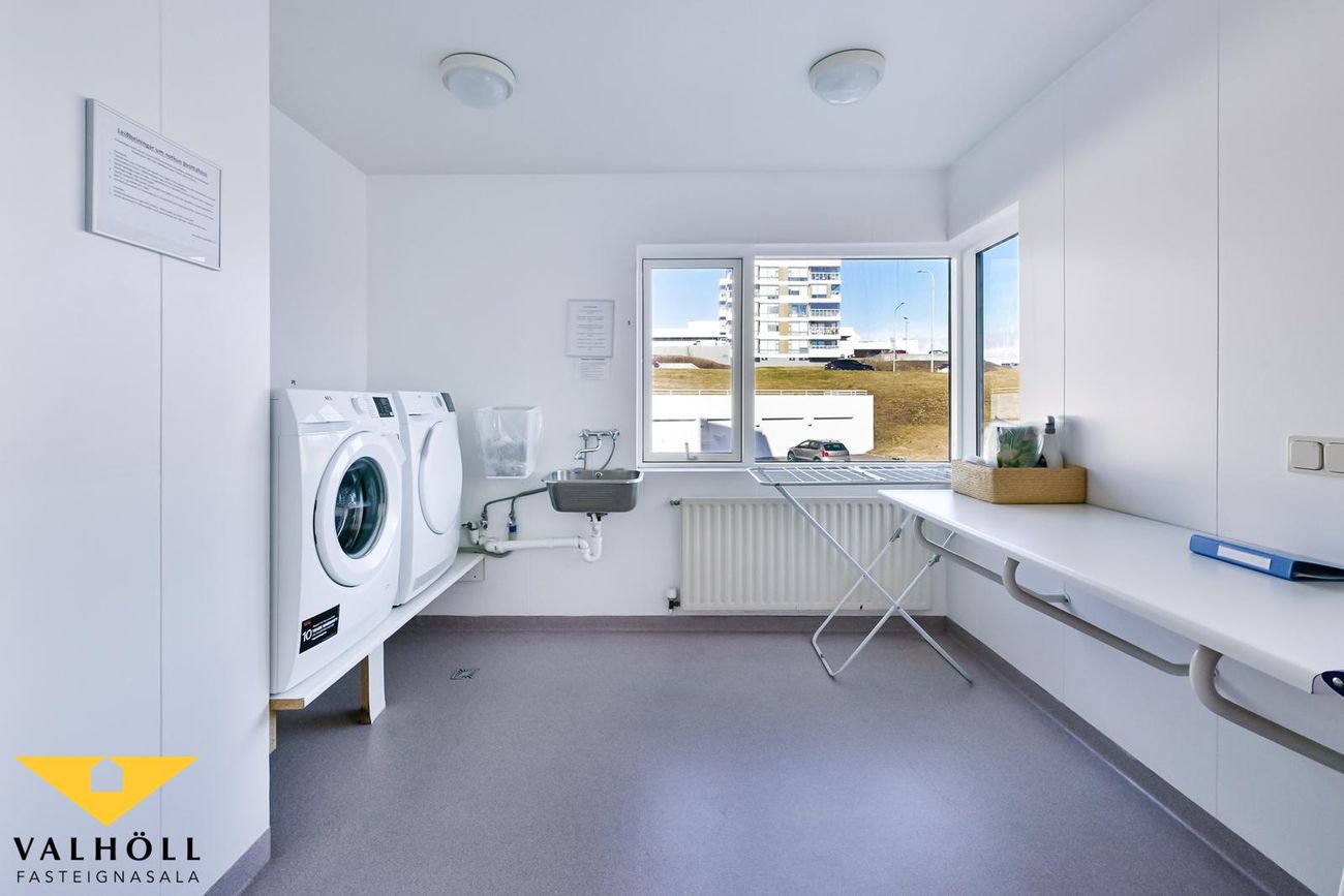 Ruslageymsla á hæðinni við hliðina á lyftunni. Huggulegt og rúmgott sameiginlegt þvottaherbergi í sameign á hæðinni með þvottavél og þurkara.