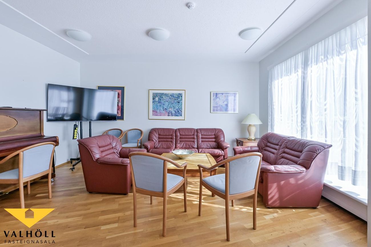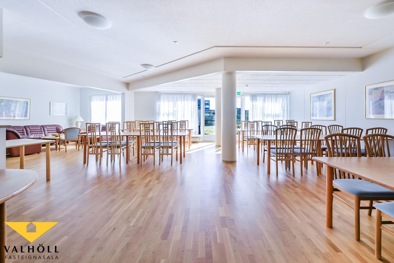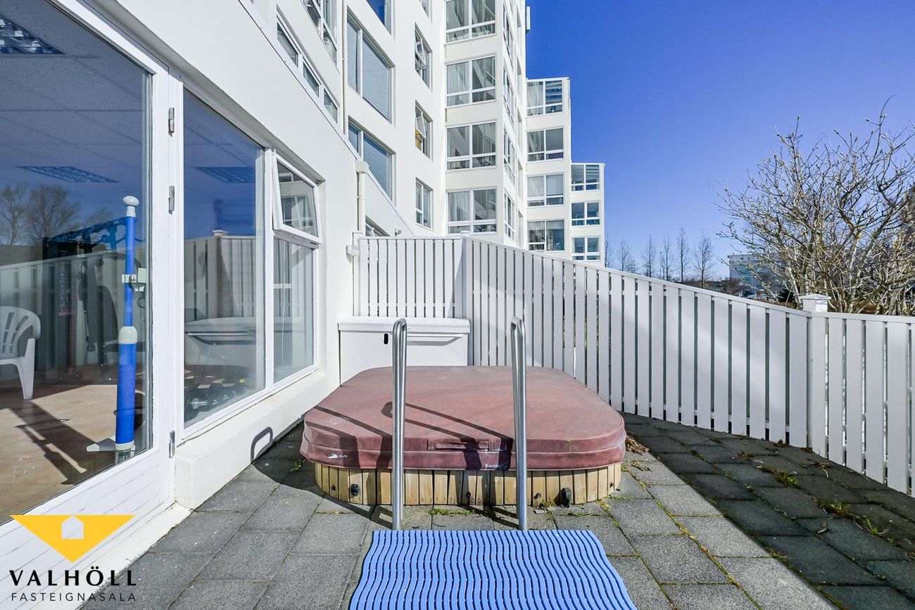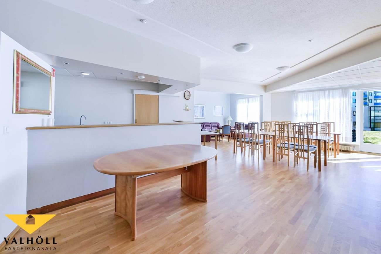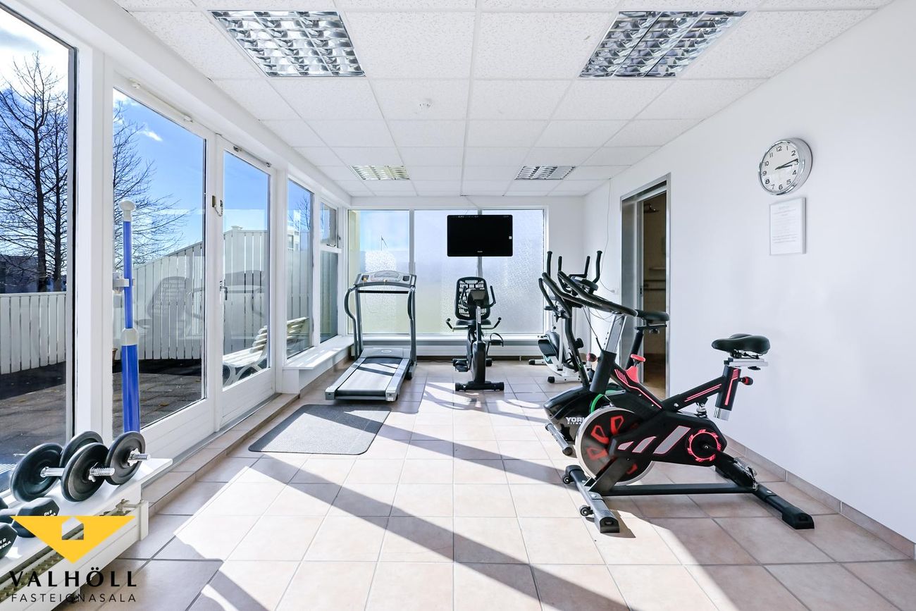 Í frábærri sameign á jarðhæðinni er eins og fyrr sagði sameiginlegur veislusalur fyrir um 60 manns með mjög góðu eldhúsi, sameiginlegar setustofur, líkamsræktarsalur með sturtuaðstöðu, gufubaði og útgengt á afgirta verönd með heitum potti. Hárgreiðslu og snyrtistofa. Einnig er sameiginlegur salur á efstu hæð sem er í útleigu. Góður húsvörður er til staðar í húsinu (býr þar) og sér um daglegan rekstur húsfélagsins.