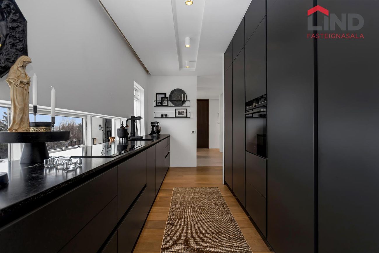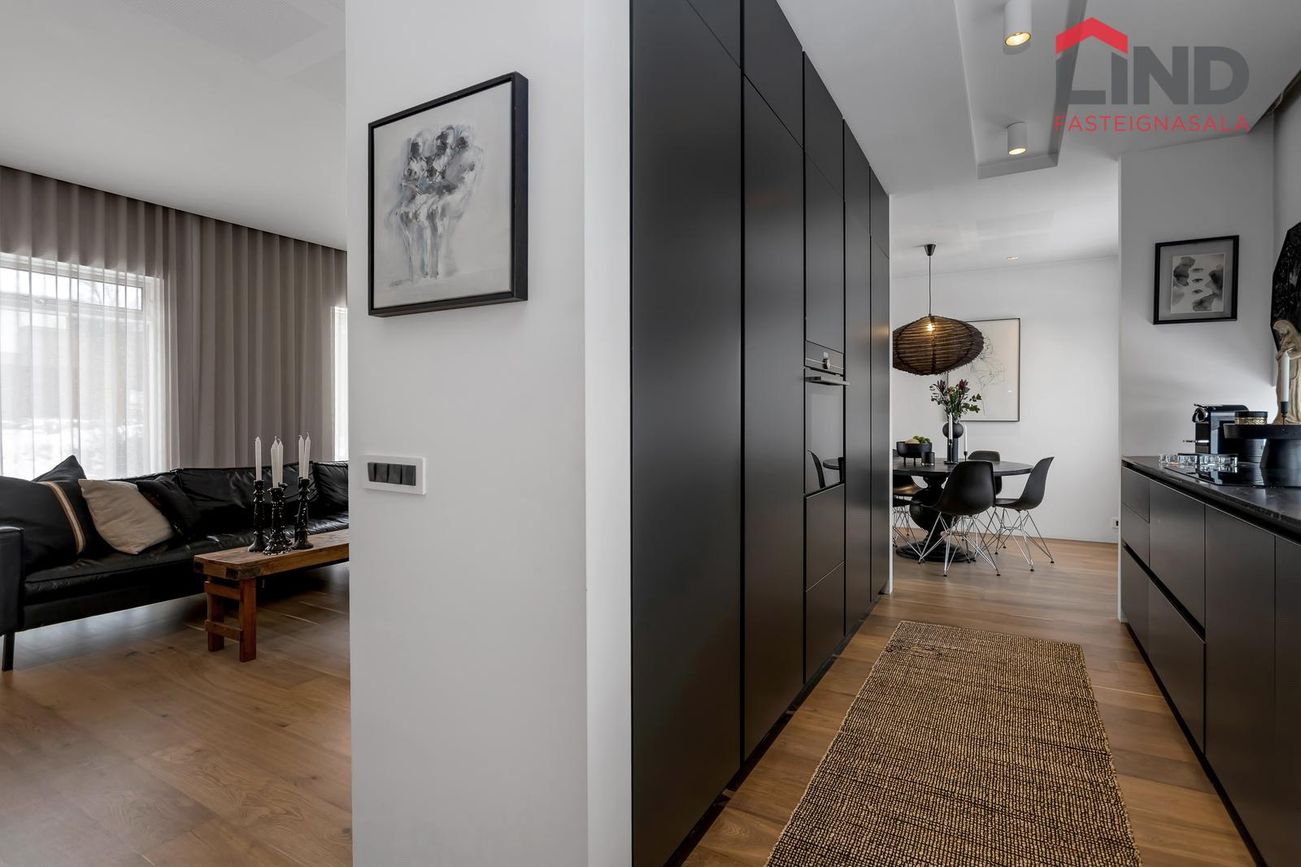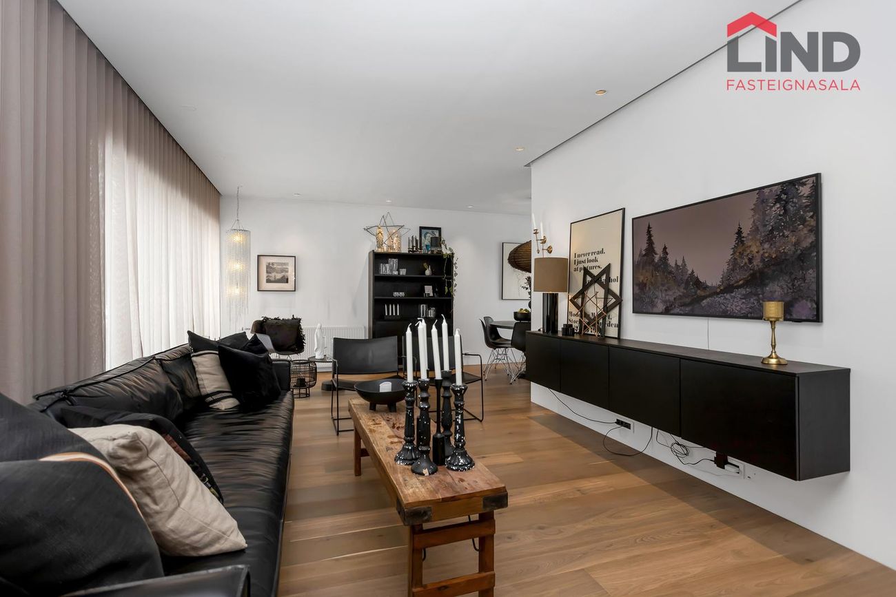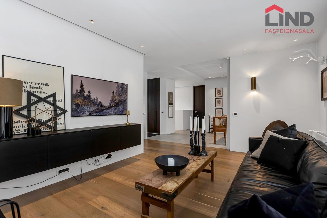 Björt og rúmgóð með innfelldri lýsingu og parketi úr reyktri eik.