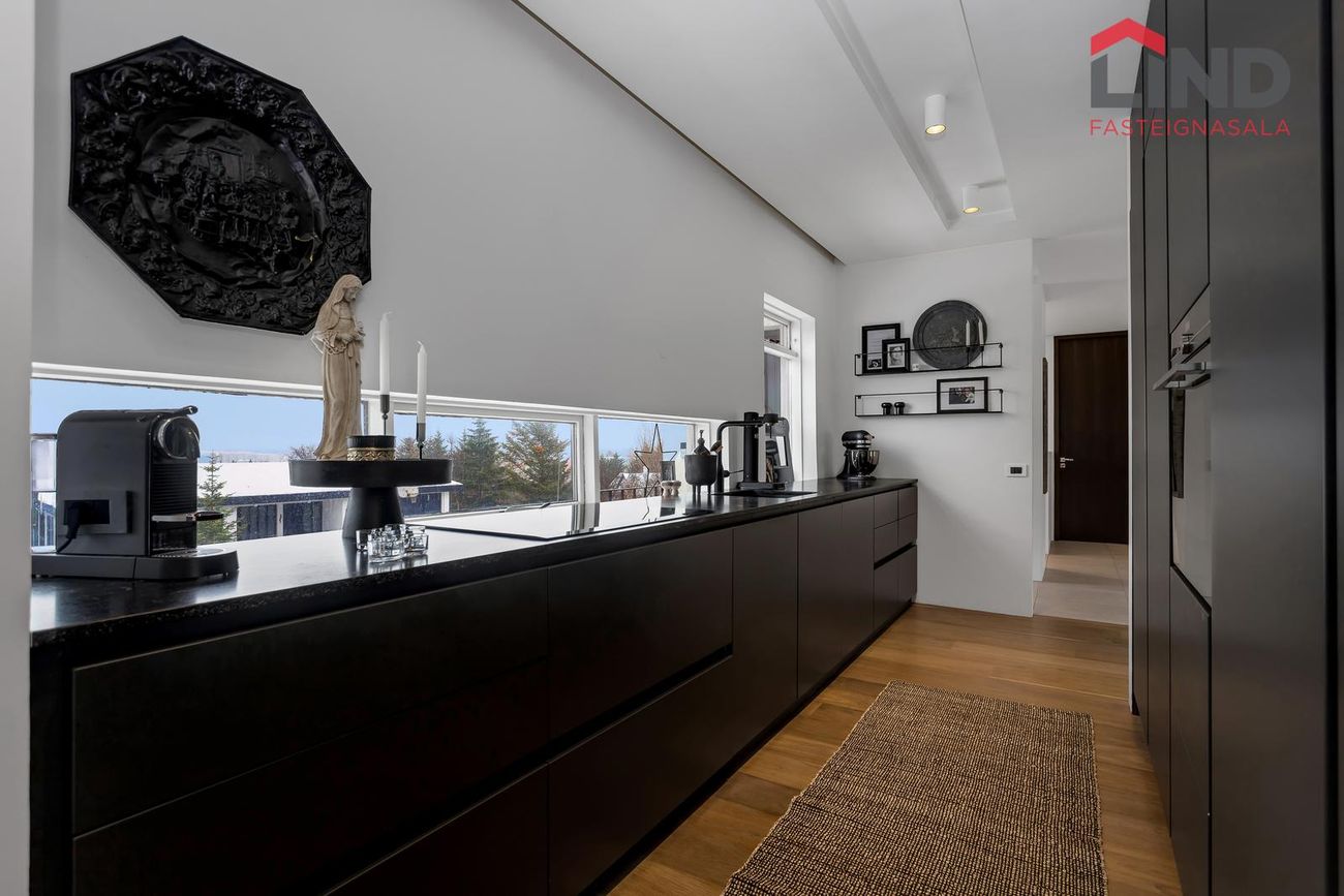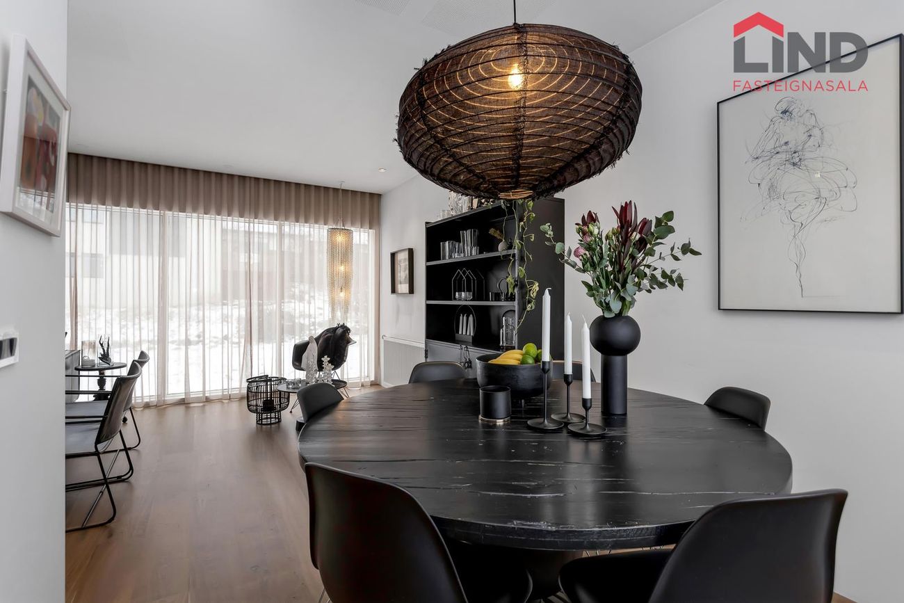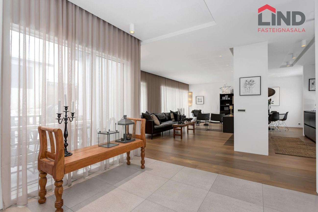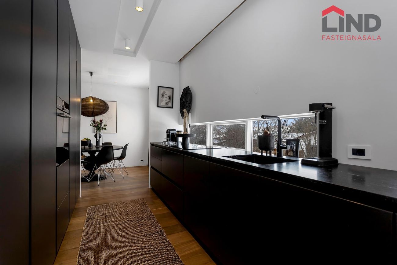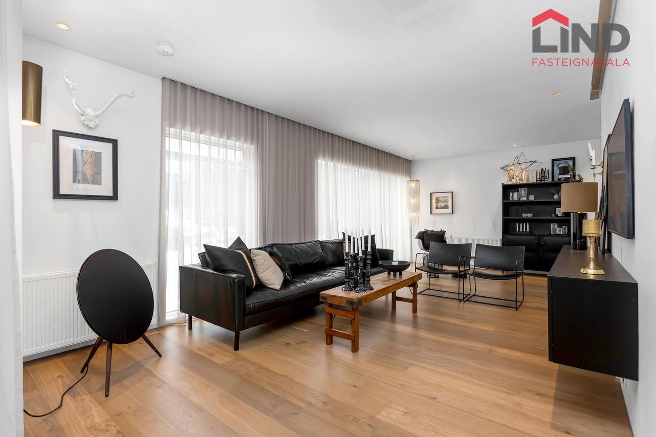 Björt og rúmgóð með innfelldri lýsingu og parketi úr reyktri eik.