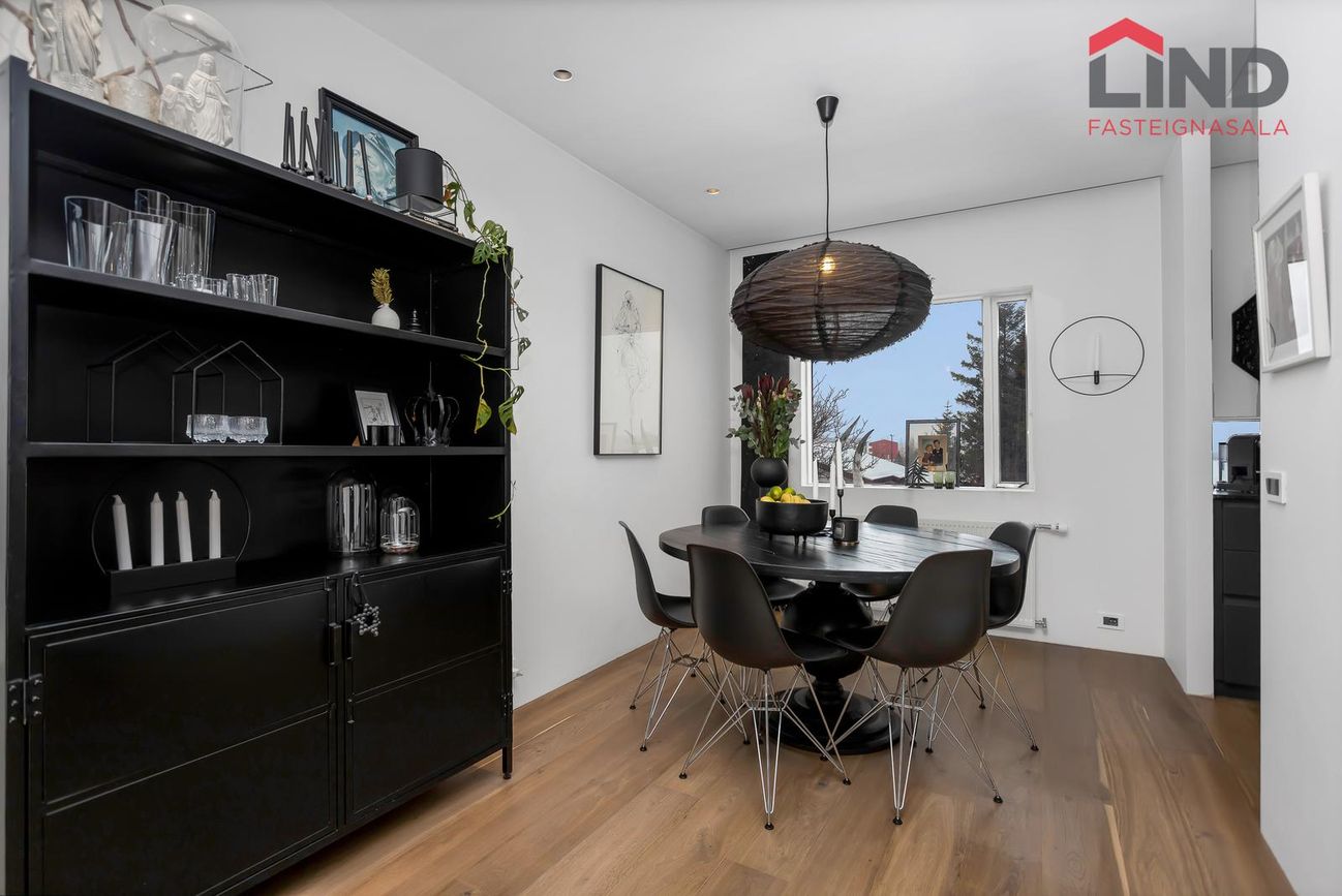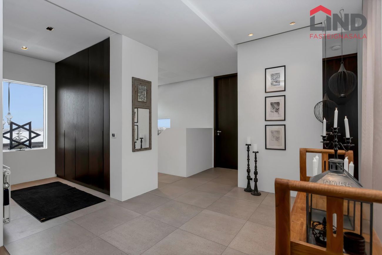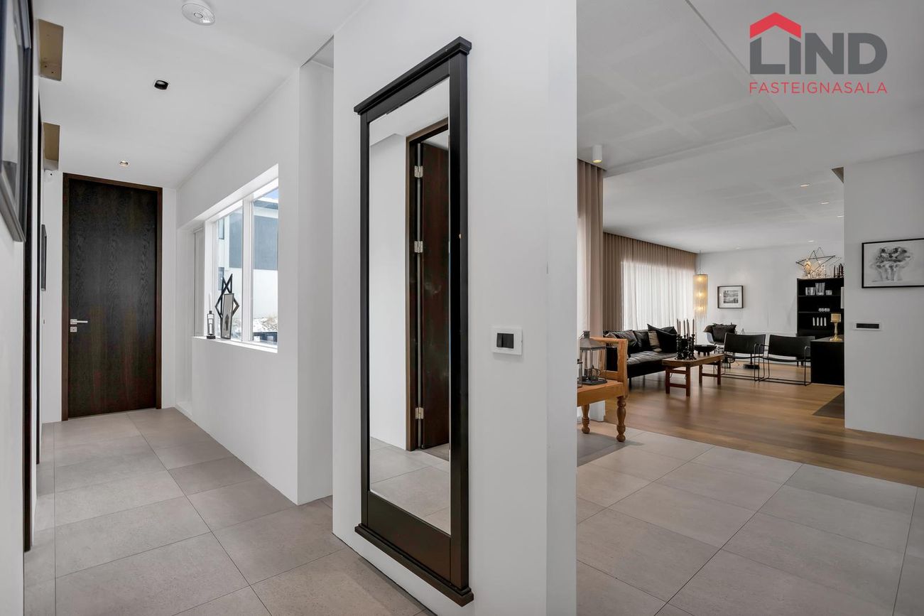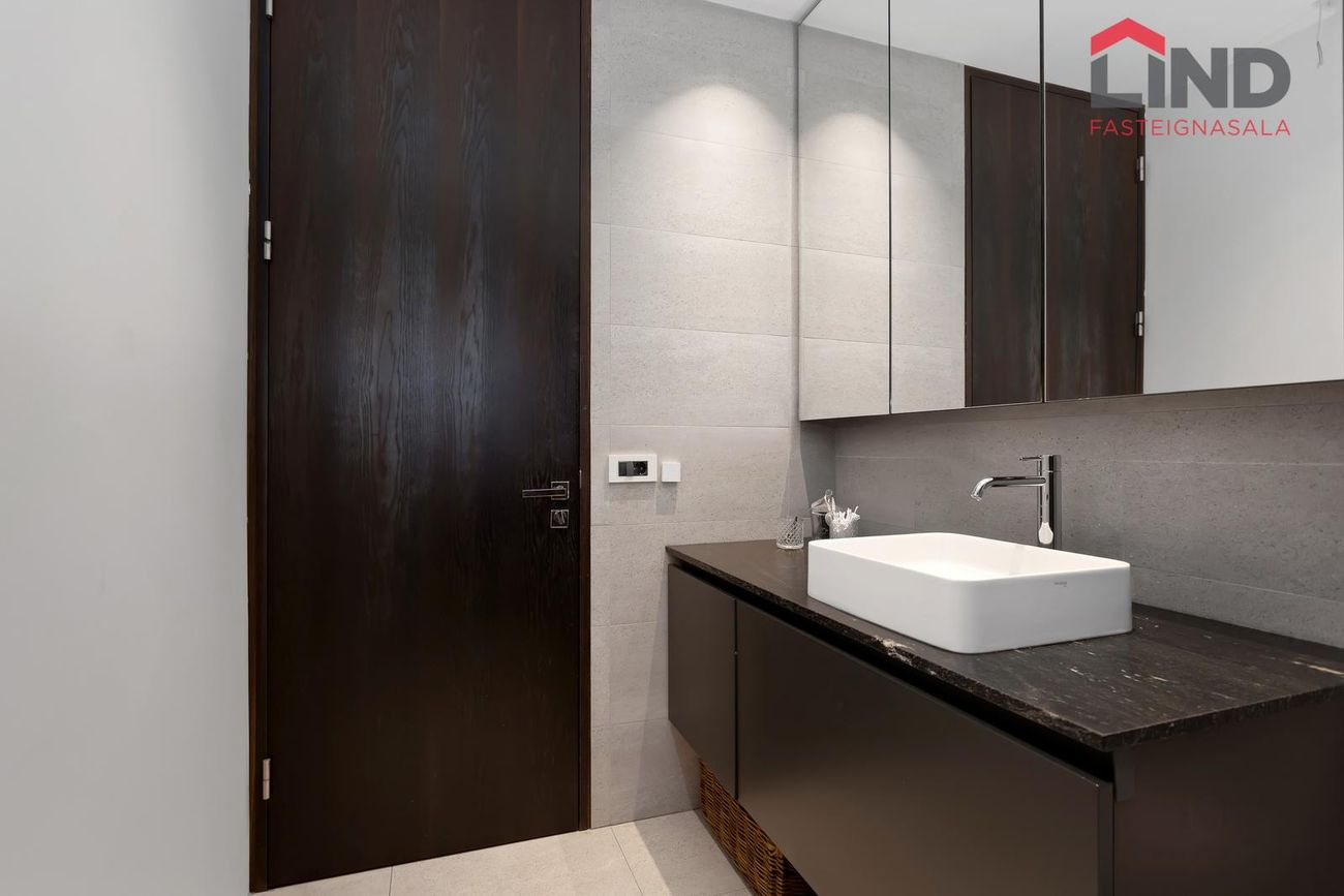 Björt og rúmgóð með innfelldri lýsingu og parketi úr reyktri eik.