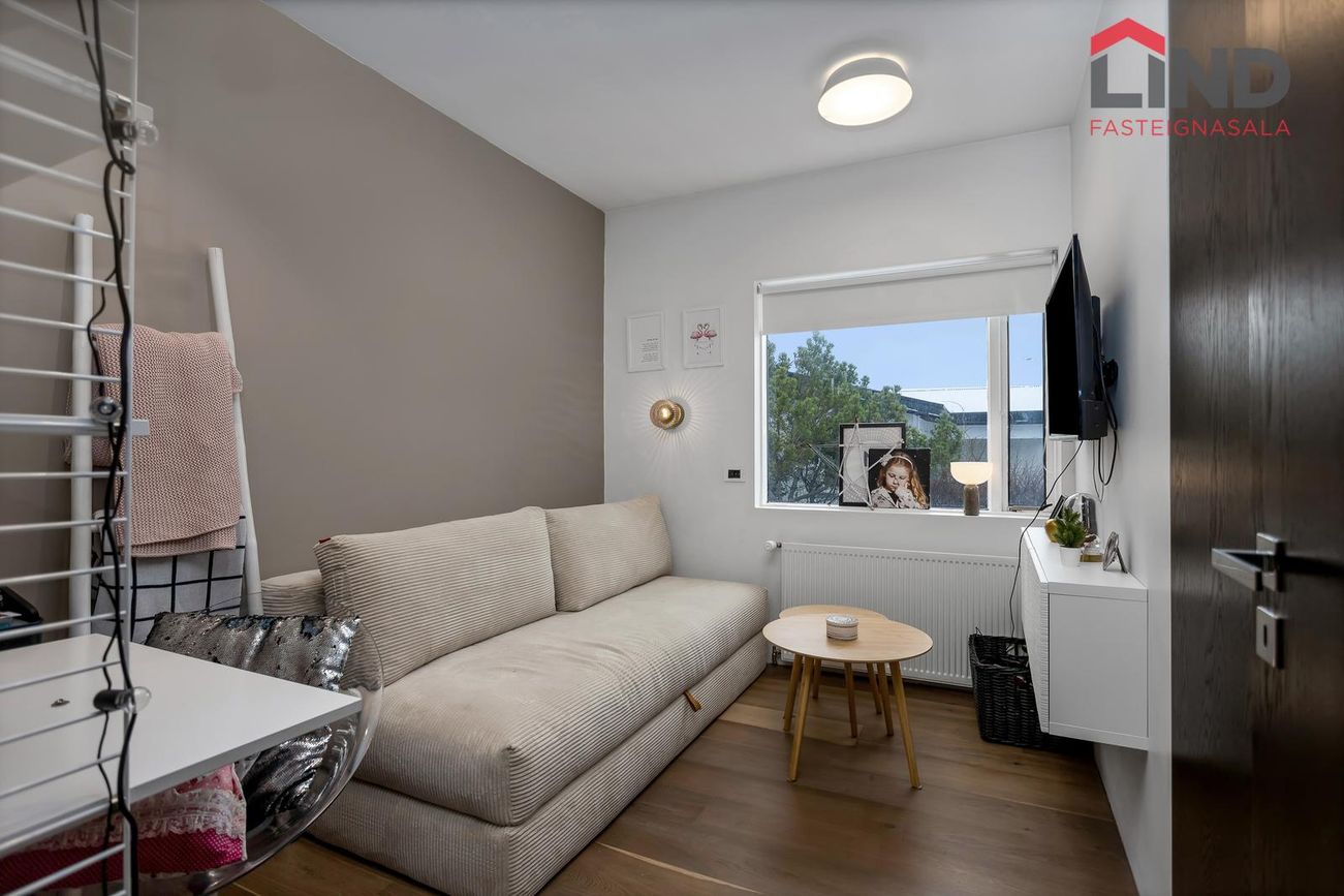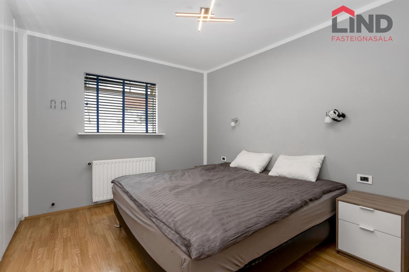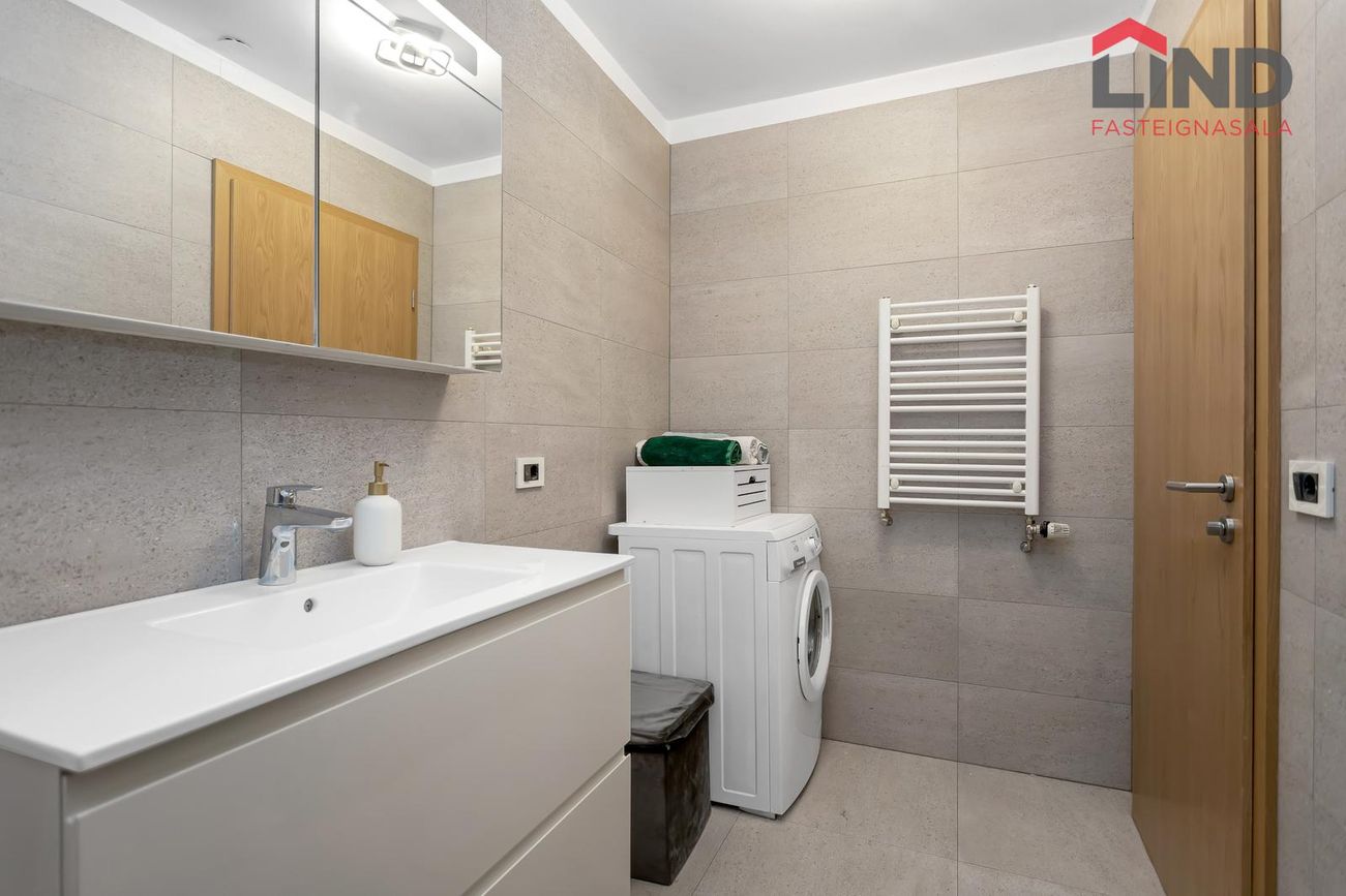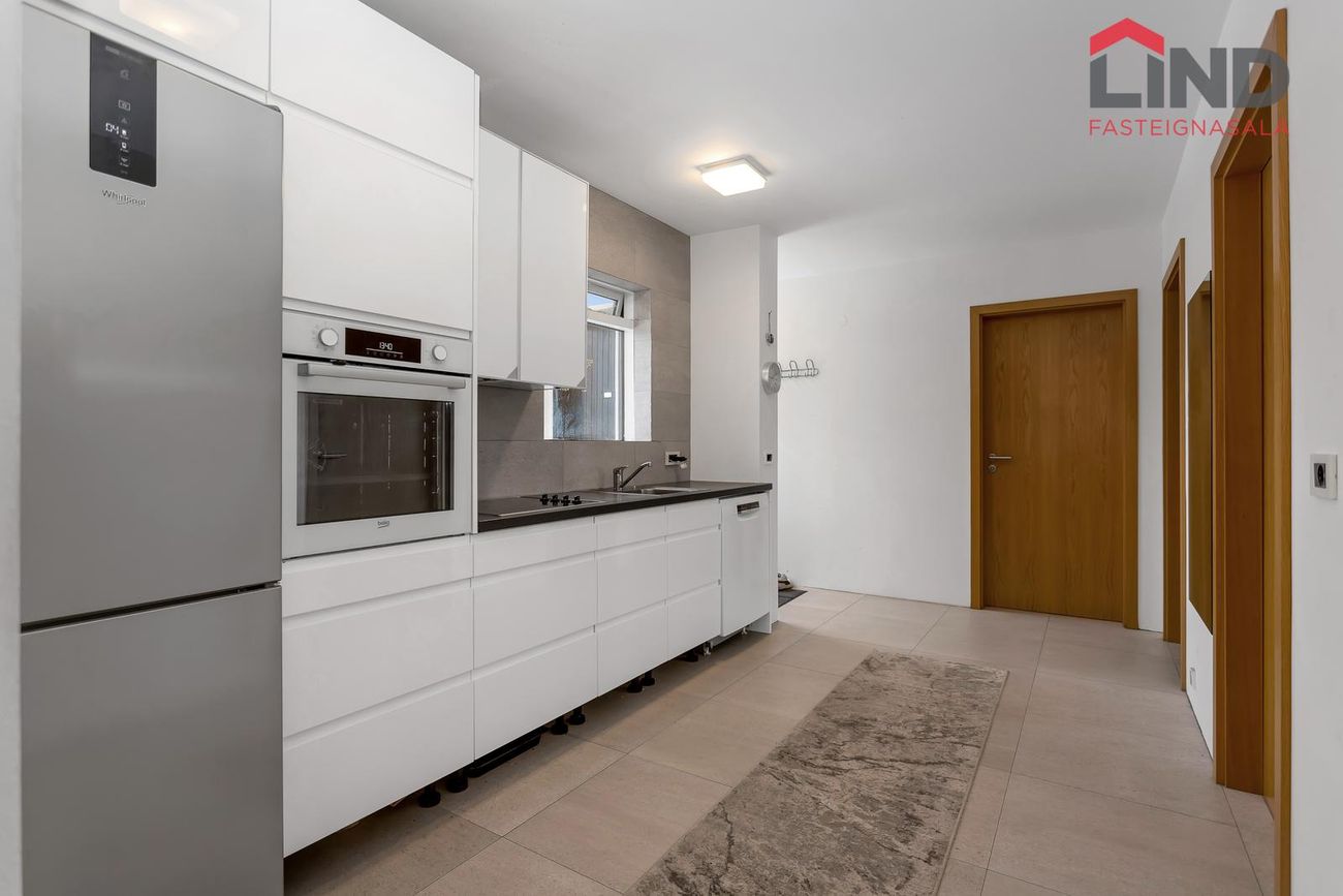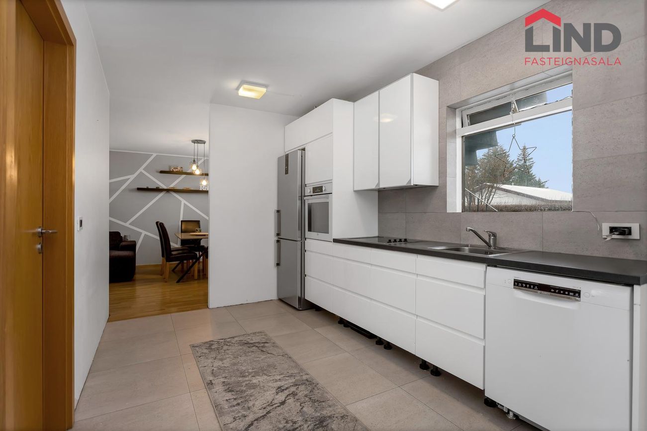 Björt og rúmgóð með innfelldri lýsingu og parketi úr reyktri eik.