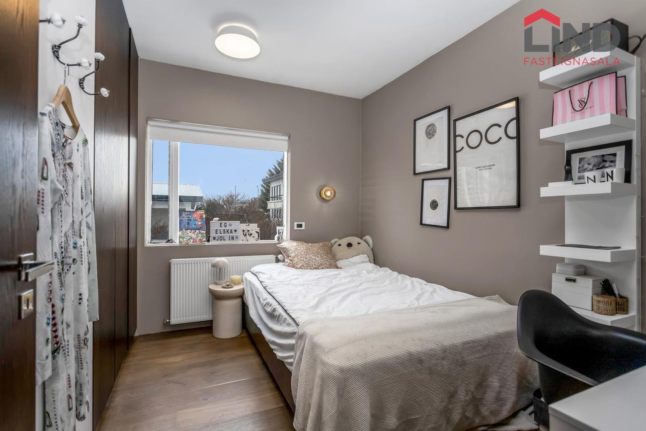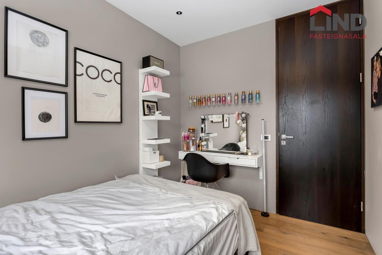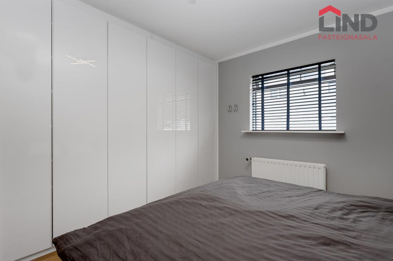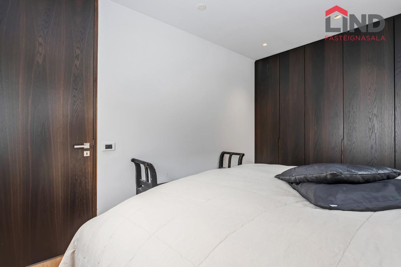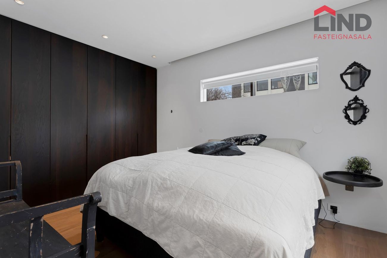 Hjónaherbergi og tvö barnaherbergi með sérsmíðuðum fataskápum og innfelldri lýsingu.